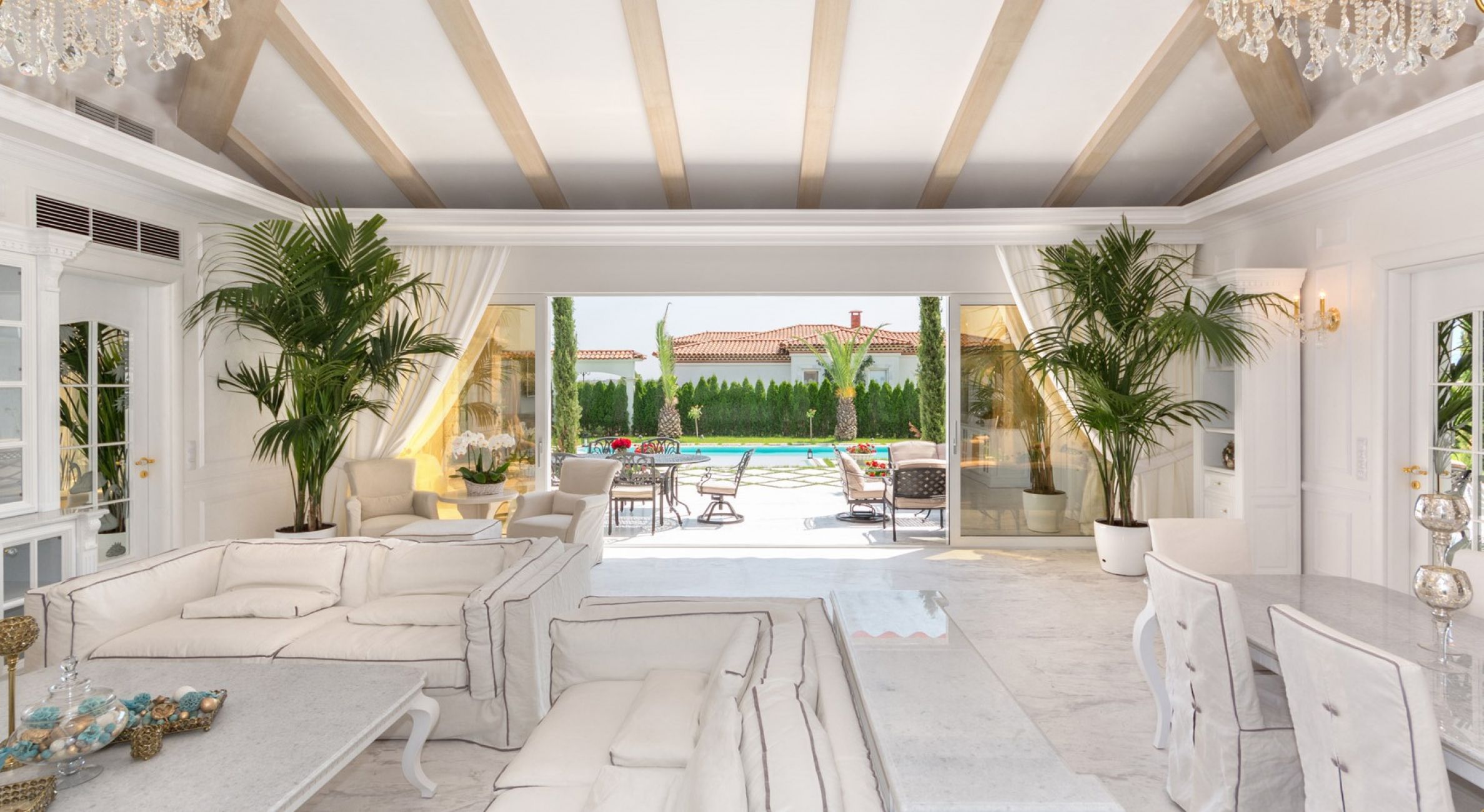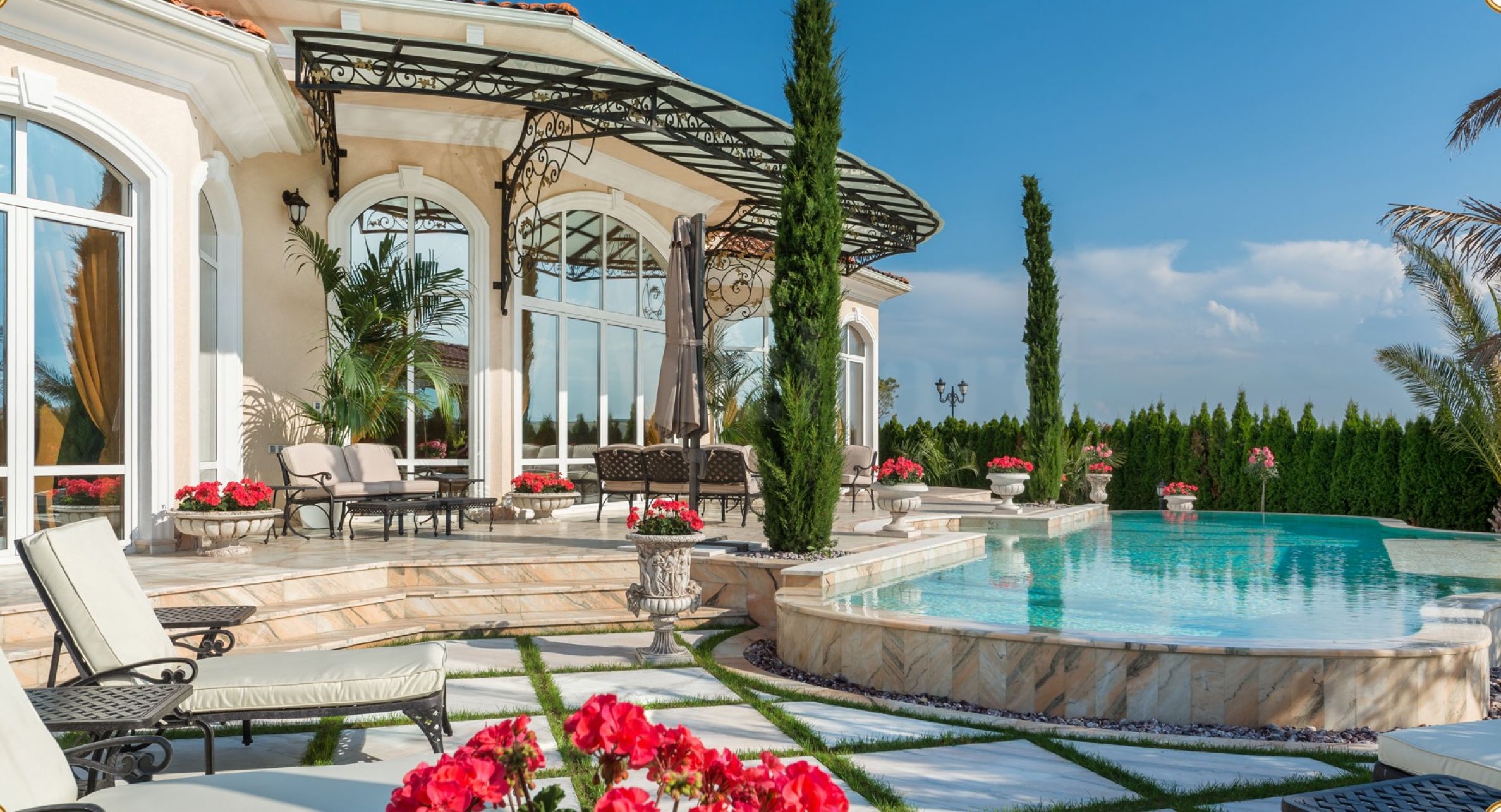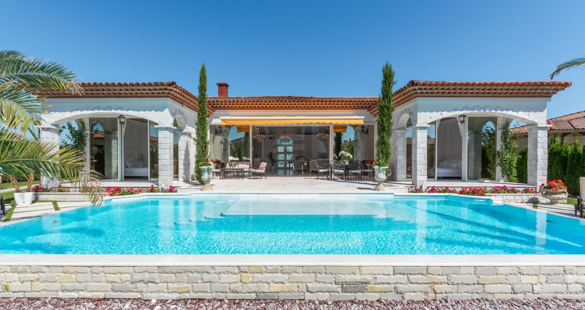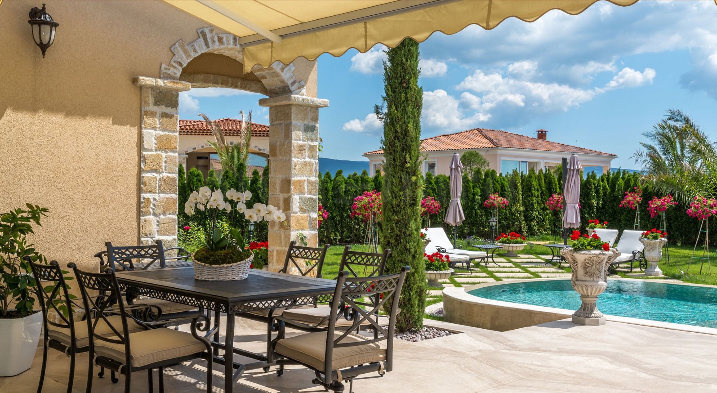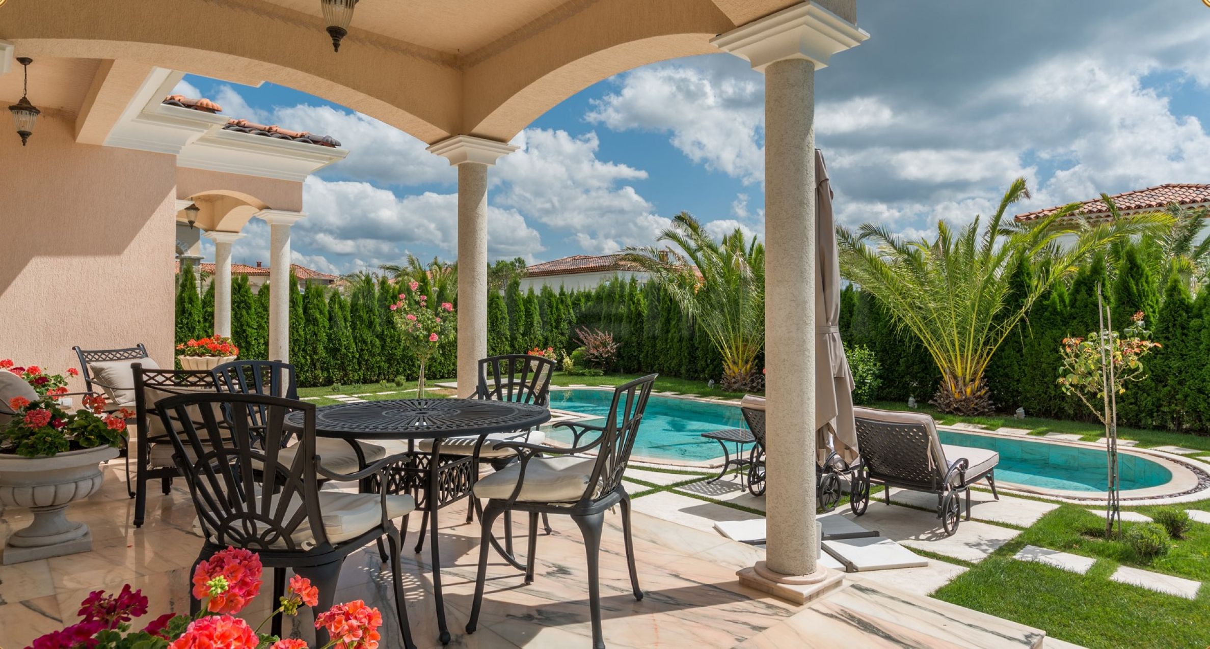 Veranda vede přímo k velkému bazénu, který se nachází uprostřed zahrady a je kompletně obložen přírodním mramorem „Pyrgos Light“.