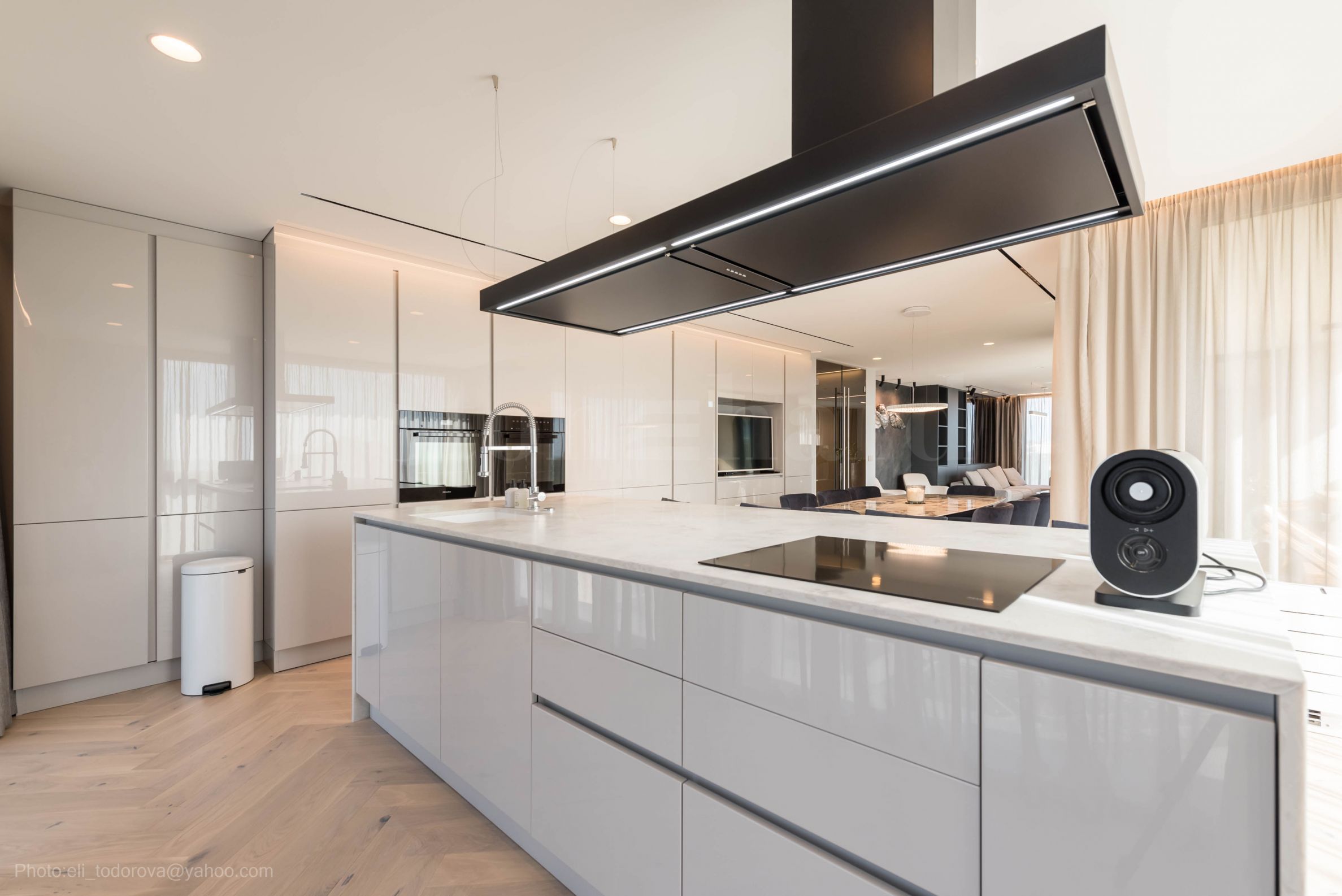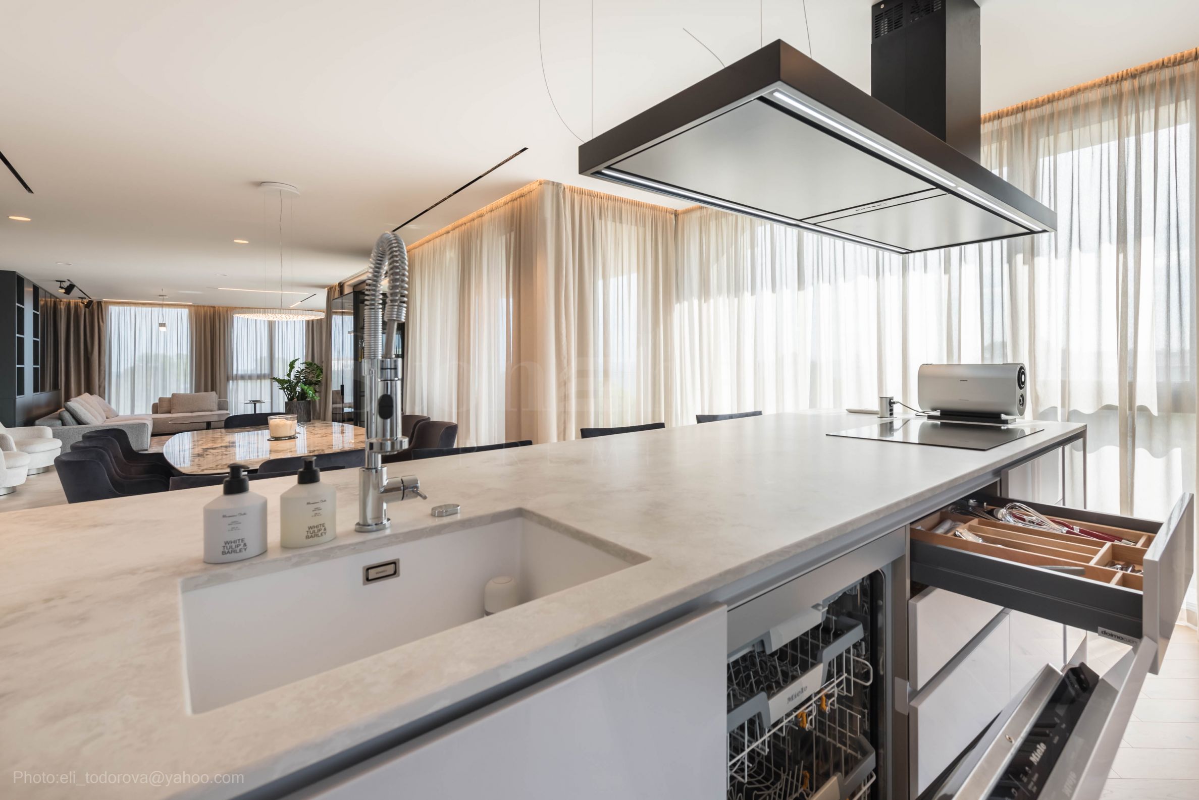 • riesiger Wohnbereich – eine Ecke mit Sofas, einem Esstisch mit Stühlen und einer modernen Küche mit einer Kochinsel;