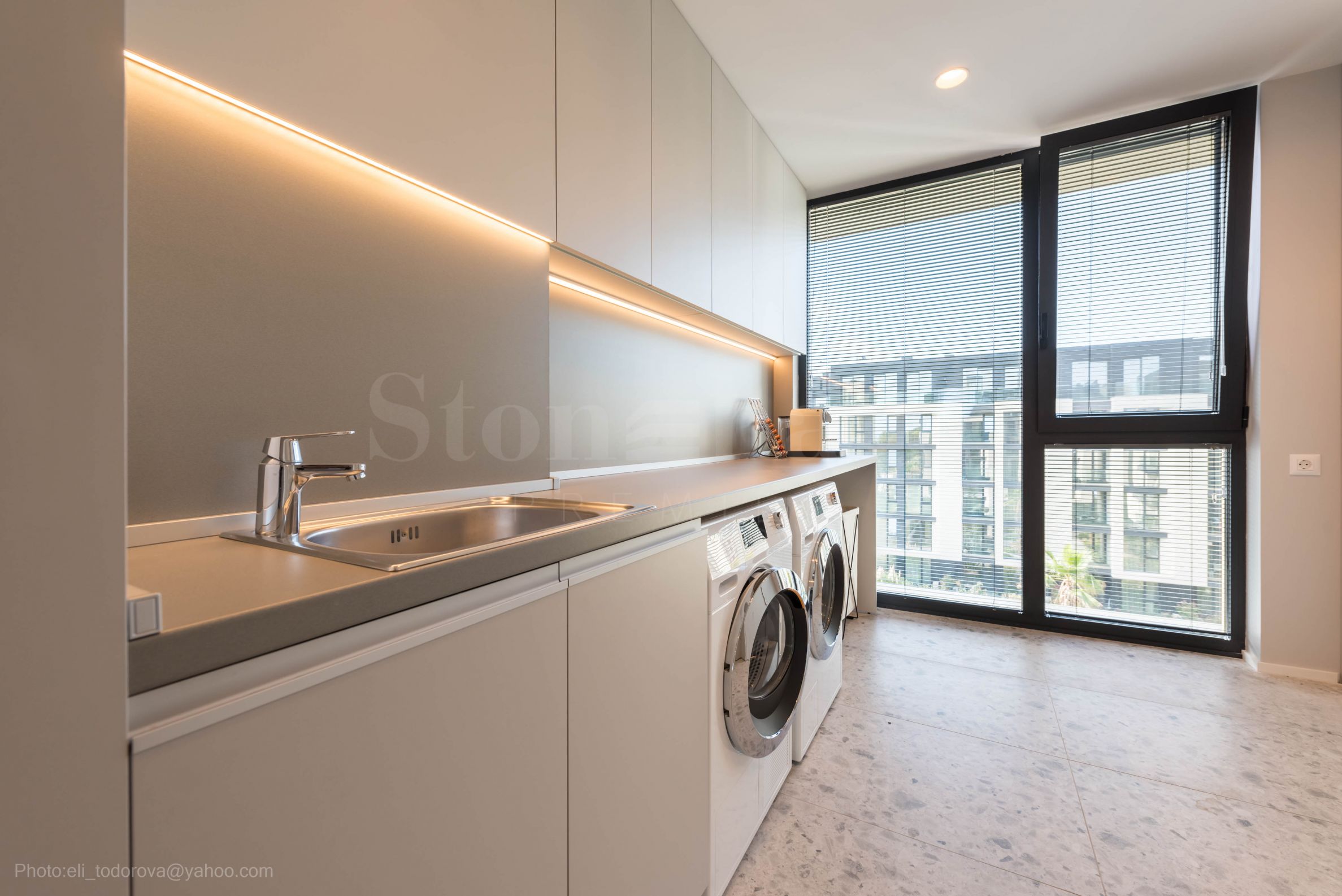 • Hauswirtschaftsraum mit Waschmaschine, Trockner und Servicekühlschränken, Schränke für verpackte Waren;
