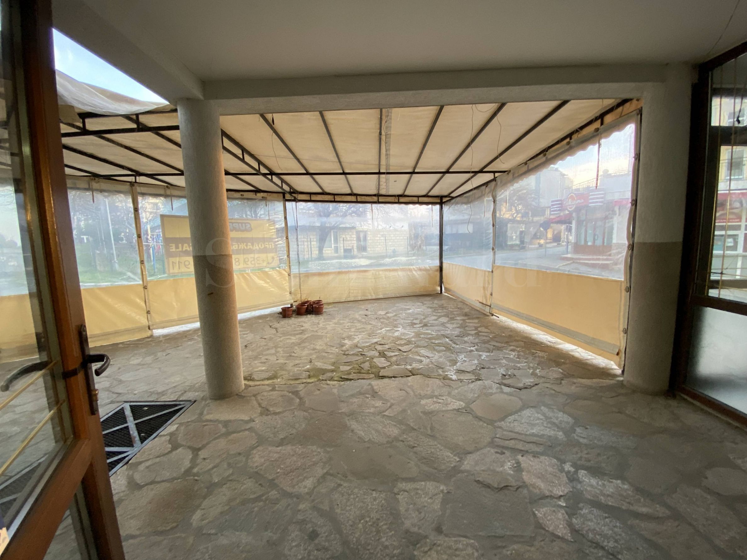 Toilette. Vor dem Laden gibt es einen zusätzlichen Raum mit eingebautem Schuppen und angebrachten winddichten Vorhängen.