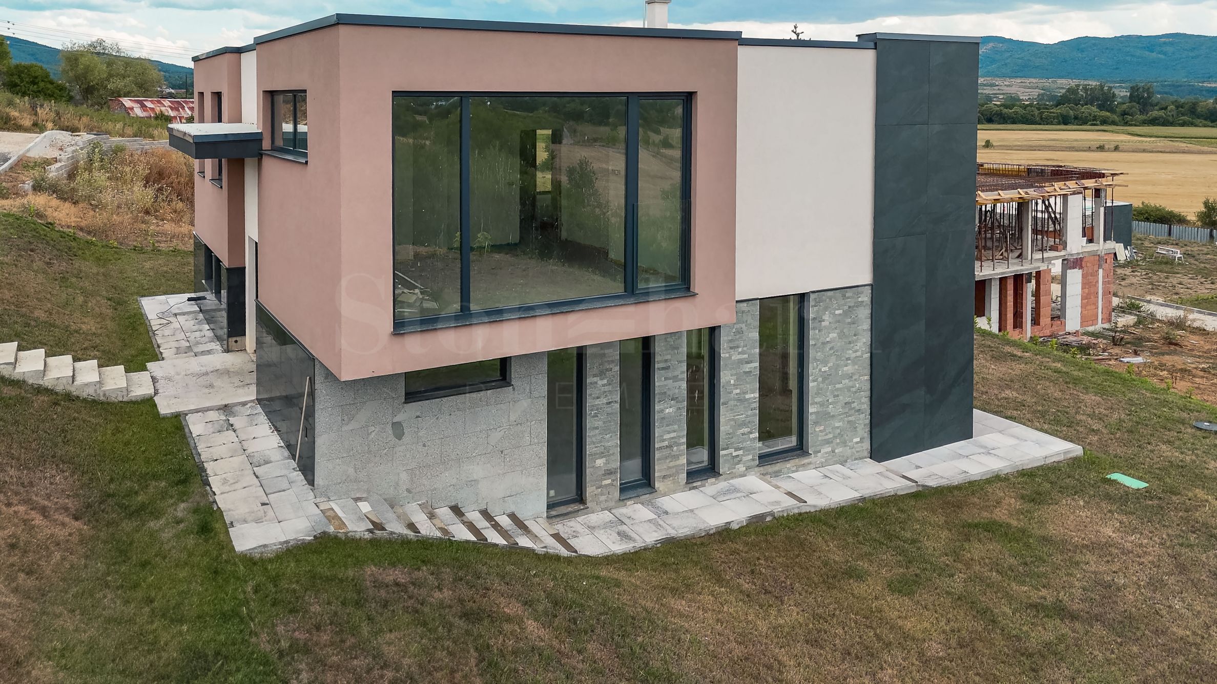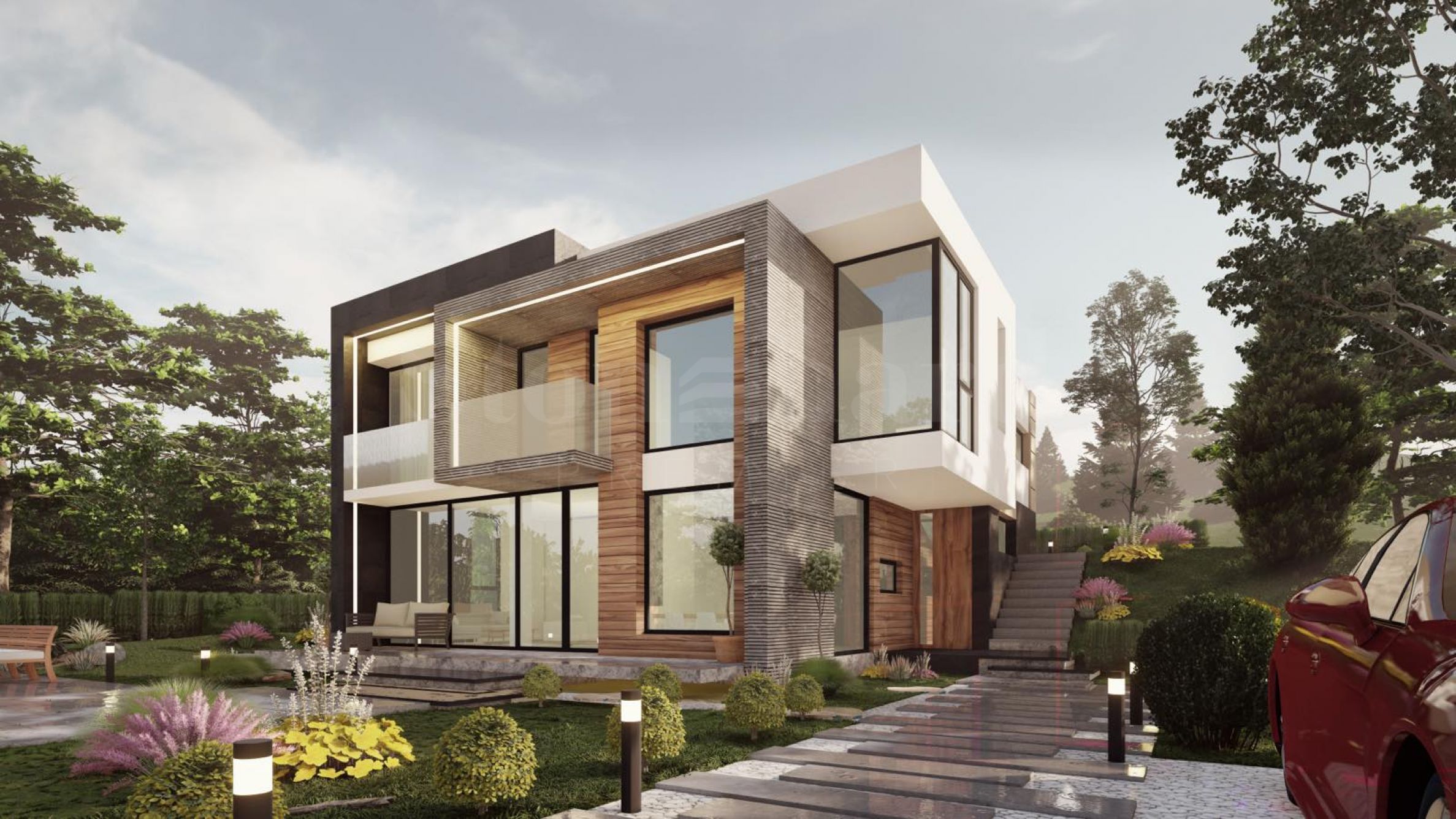 Die Architektur des Komplexes vereint klare Linien, natürliche Materialien wie Stein und Holz sowie sorgfältig ausgewählte Fassadenlösungen. Hochwertige Dämmung, dreifach verglaste Rehau Geneo Fenster, moderne Eingangstüren und zuverlässige Dachlösungen garantieren dauerhafte Qualität und Energieeffizienz. Beheizt wird das Gebäude mit einer Wärmepumpe und Fußbodenheizung. Die Innenräume sind verputzt und gekalkt, wobei eine schlüsselfertige Übergabe nach individuellen Wünschen möglich ist.