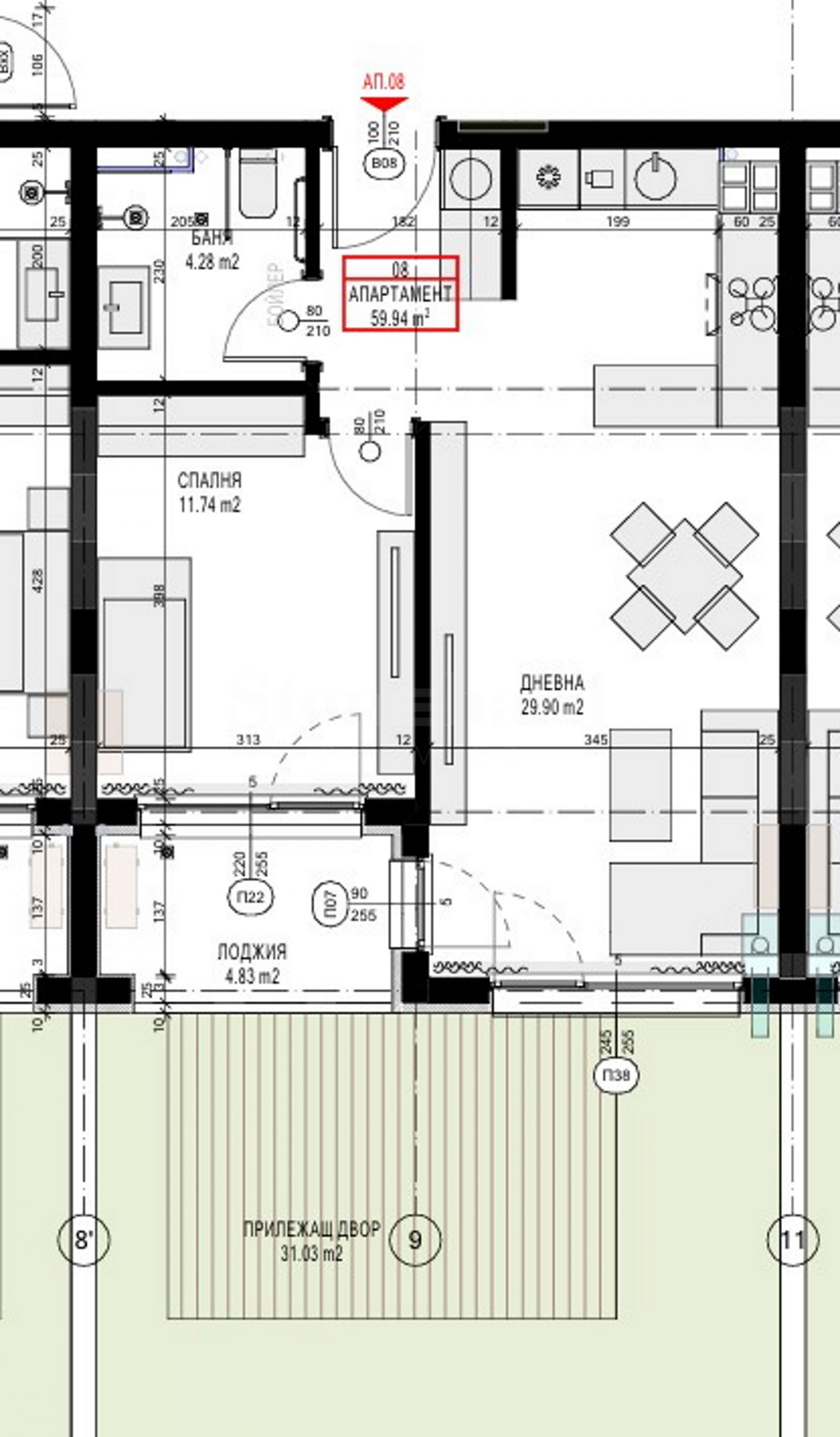 Die Wohnung Nr. 8 befindet sich im 1. Obergeschoss und hat eine Wohnfläche von 59,94 m². Sie ist aufgeteilt in: Eingangsbereich, Badezimmer/WC, helles Wohnzimmer mit Küche und Essbereich, komfortables Schlafzimmer und eine Loggia-Terrasse, die von beiden Zimmern aus zugänglich ist. Zur Wohnung gehören außerdem ein angrenzender Hof (31,03 m²) und ein Abstellraum (2,79 m²), die im Preis inbegriffen sind.