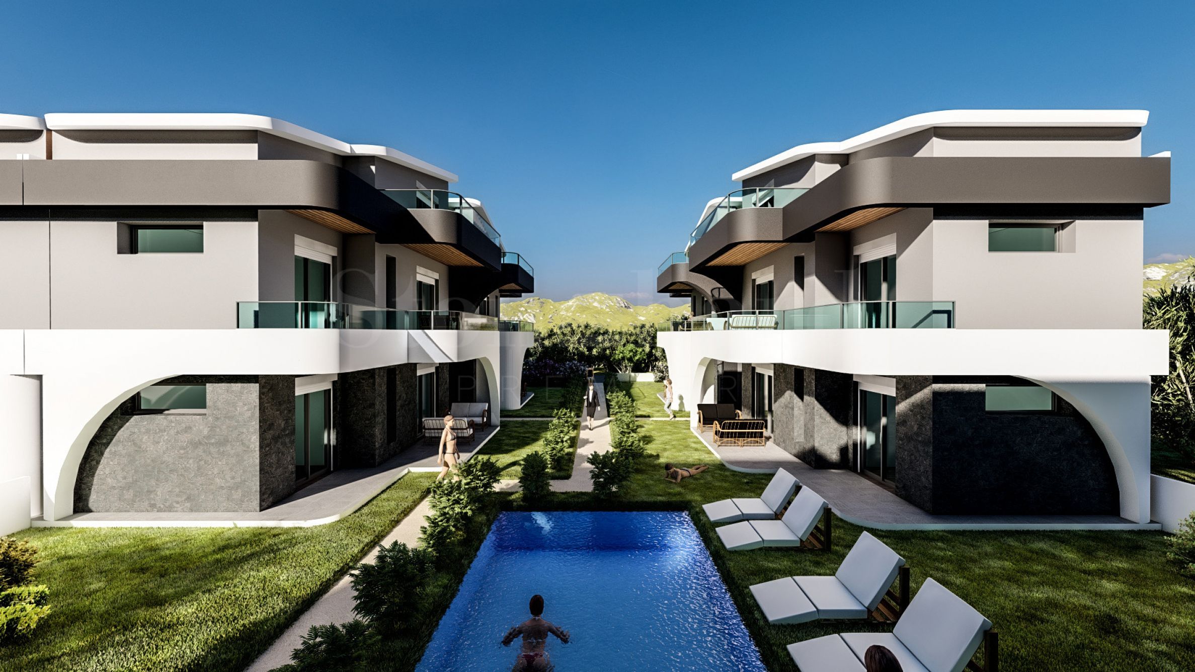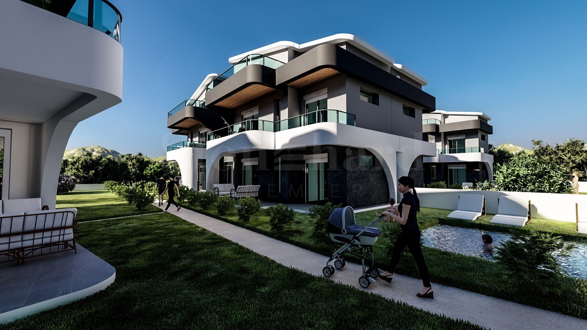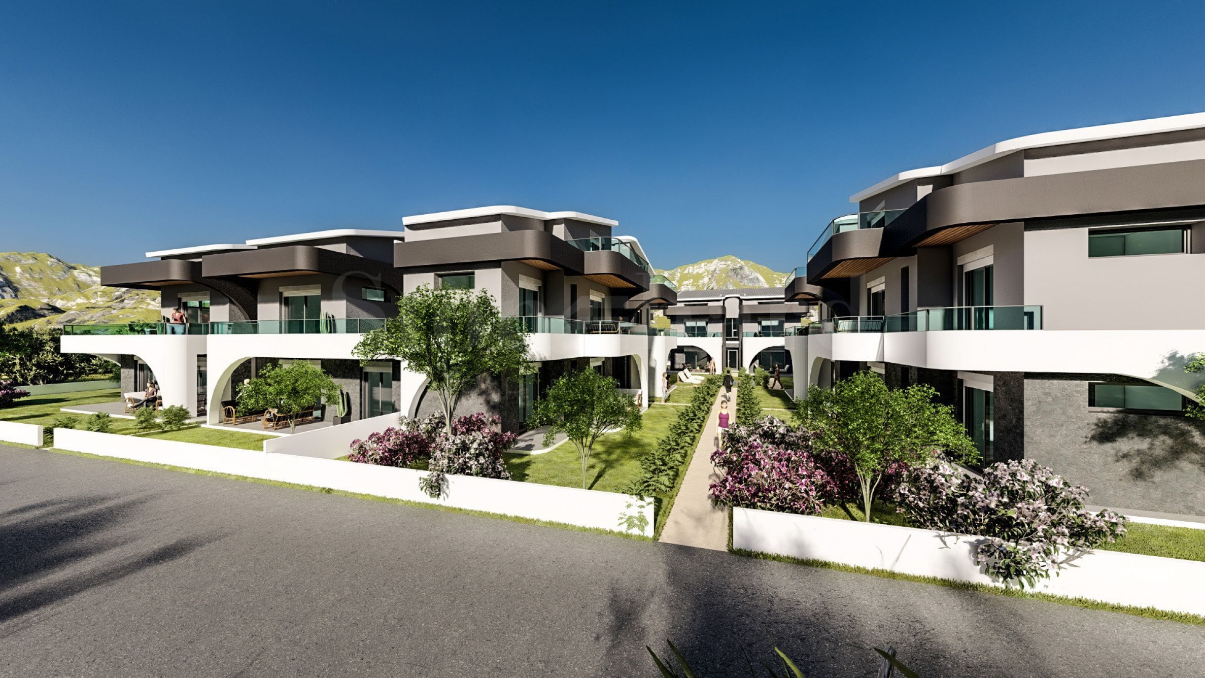 Der Komplex umfasst acht Gebäude mit insgesamt 24 Wohnungen, die mit Blick auf Komfort und Funktionalität gestaltet wurden. Die Architektur besticht durch eine elegante Optik mit einer Kombination aus Glas, Holz und dekorativen Akzenten, die dem Gebäude einen modernen Charakter verleihen. Die Wohnungen erstrecken sich über ein oder zwei Etagen, sind durch stilvolle Treppenhäuser miteinander verbunden und werden schlüsselfertig angeboten – inklusive Türen, Fußböden, Beleuchtung, Einbauküchen und komplett ausgestatteten Badezimmern. Die Erdgeschosswohnungen verfügen über sonnige Veranden, die Wohnungen in den oberen Etagen über großzügige Terrassen.