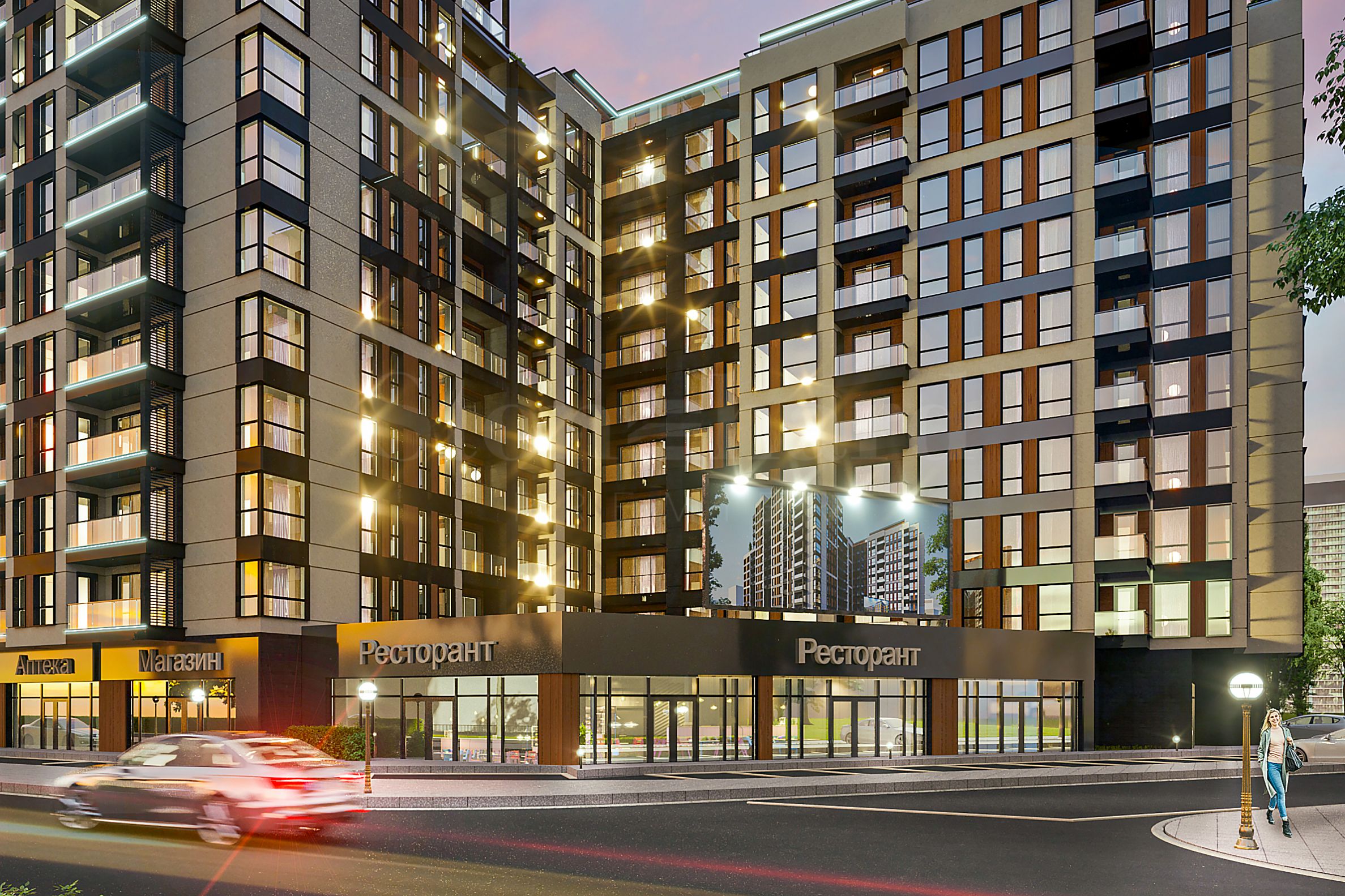 Der Komplex besteht aus vier Abschnitten mit insgesamt 241 Wohnungen, verteilt auf drei bis sechs Studios sowie Ein- und Zweizimmerwohnungen pro Etage. Jeder Abschnitt verfügt über einen separaten Eingang mit angrenzendem Aufzug, der eine komfortable Verbindung zur Tiefgarage herstellt. Die Gemeinschaftsbereiche sind luxuriös mit hochwertigen Materialien und in einem exklusiven Design gestaltet. Die Wohnungen zeichnen sich durch funktionale Grundrisse aus, die für helle und geräumige Räume sorgen. Im Erdgeschoss befinden sich Gewerbe- und Büroflächen.