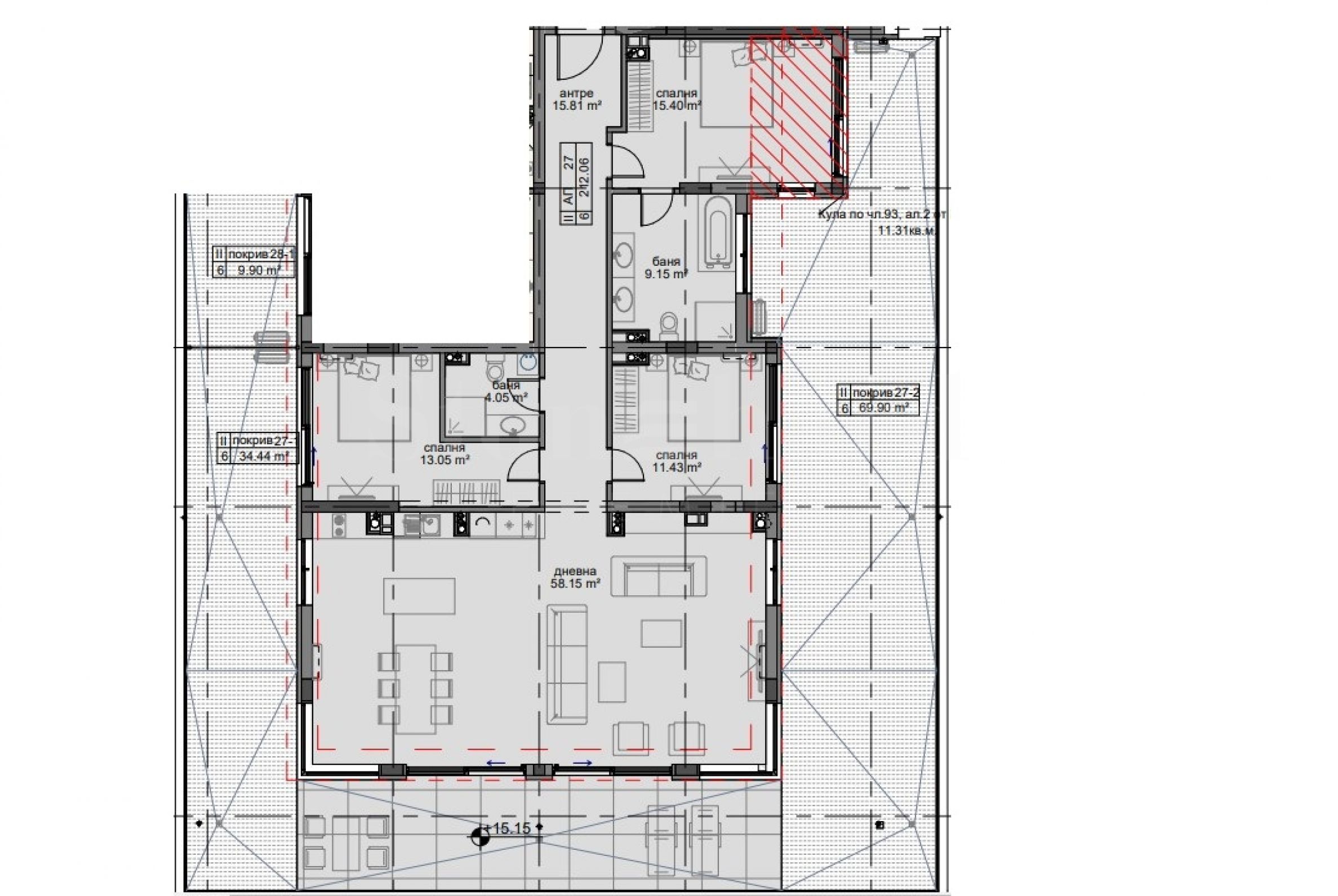 Die Wohnung befindet sich im 5. Obergeschoss und bietet eine Gesamtfläche von 212,06 m². Sie besteht aus Eingangsbereich, Wohnzimmer, Terrasse, drei Schlafzimmern und einem Badezimmer mit WC. Zur Wohnung gehören außerdem zwei Dachterrassen mit einer Gesamtfläche von 104,34 m².