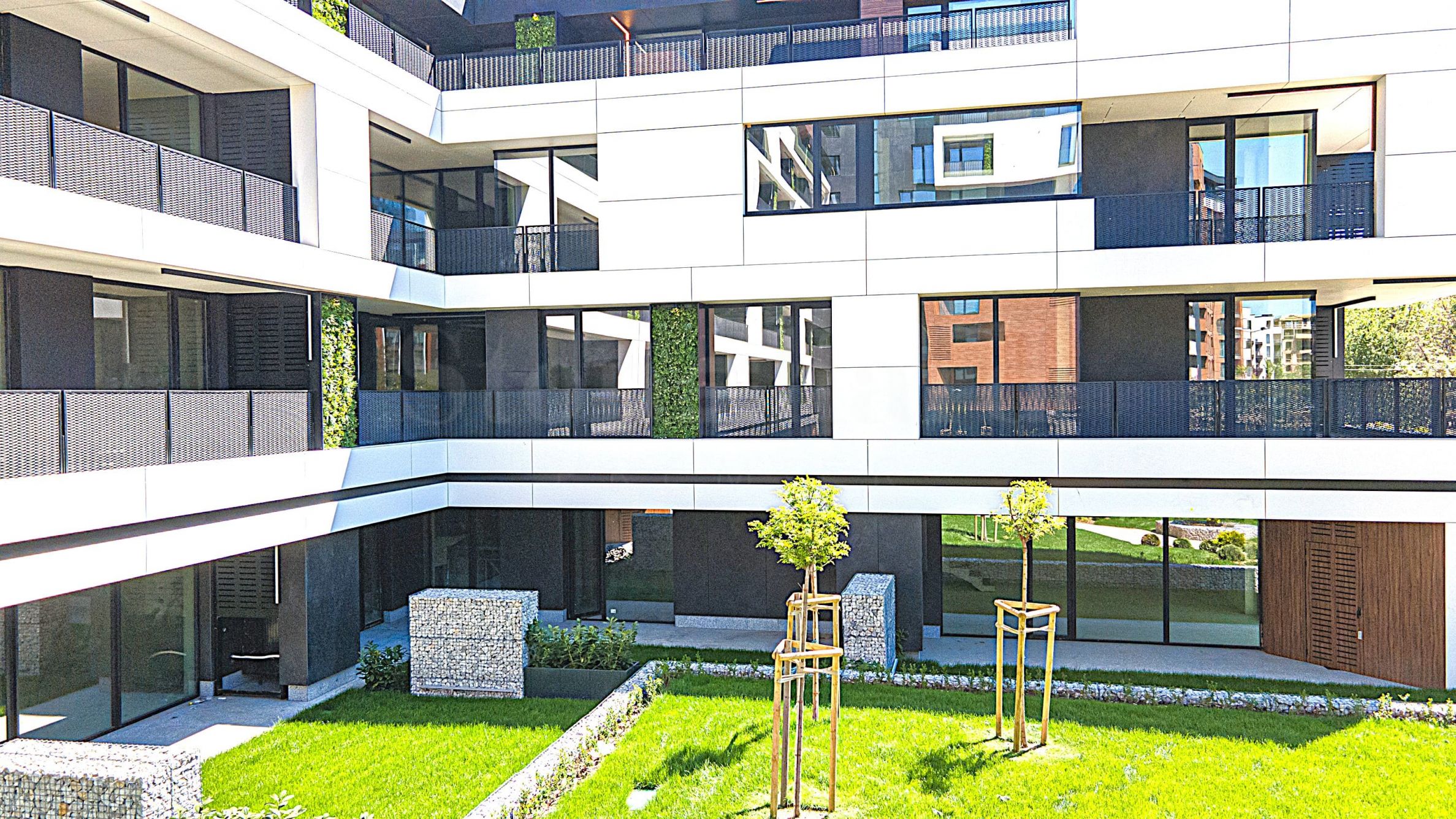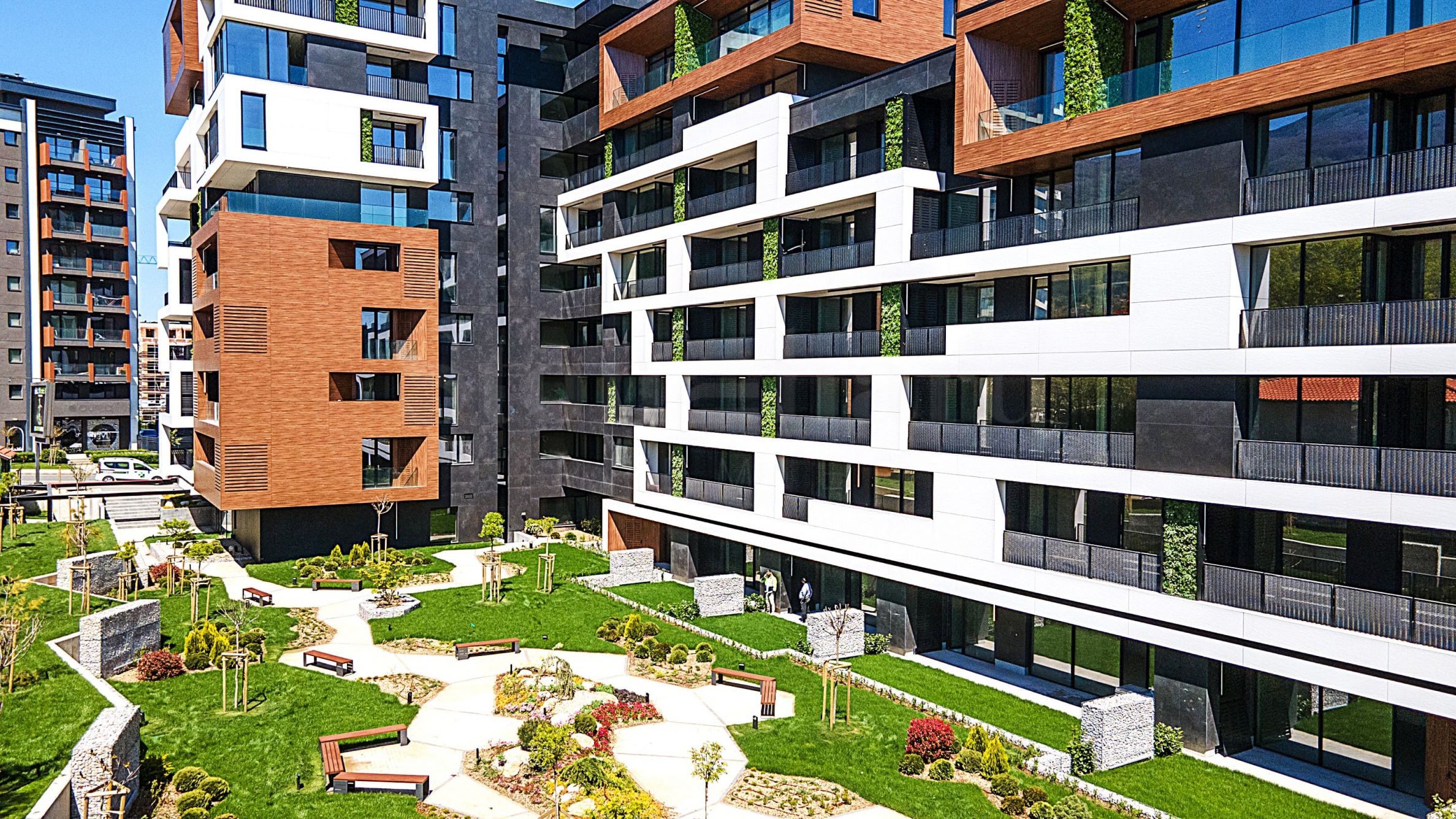 Das angestrebte Spiel mit der Plastizität der vor- und zurückspringenden Glasvolumen in der gemeinsamen Fassade verbindet sich mit dem Motiv vertikaler Grünwände, die die Klimaanlagen ästhetisch verdecken. Alle Terrassen, auch die im obersten Stockwerk, sind überdacht und sonnenbeschienen. Der Terrassenboden besteht aus zweilagigen Granitfliesen. Die filigranen Geländer sind in zwei Ausführungen erhältlich: als dreilagiges Glasgeländer oder als Metallrahmen mit schwarzem Streckmetallgitter, je nach architektonischem Detail und dem kompositorischen Konzept. Die zusätzliche, lineare LED-Beleuchtung der Fassade unterstreicht die Hauptwirkung bei Nacht. Das Konzept der dynamischen Komposition setzt sich in der Gestaltung des Hauptinnenhofs der Anlage fort, der mit Gabionen, Parkmöbeln, Beleuchtung und einem Wasserspiel kombiniert wird.