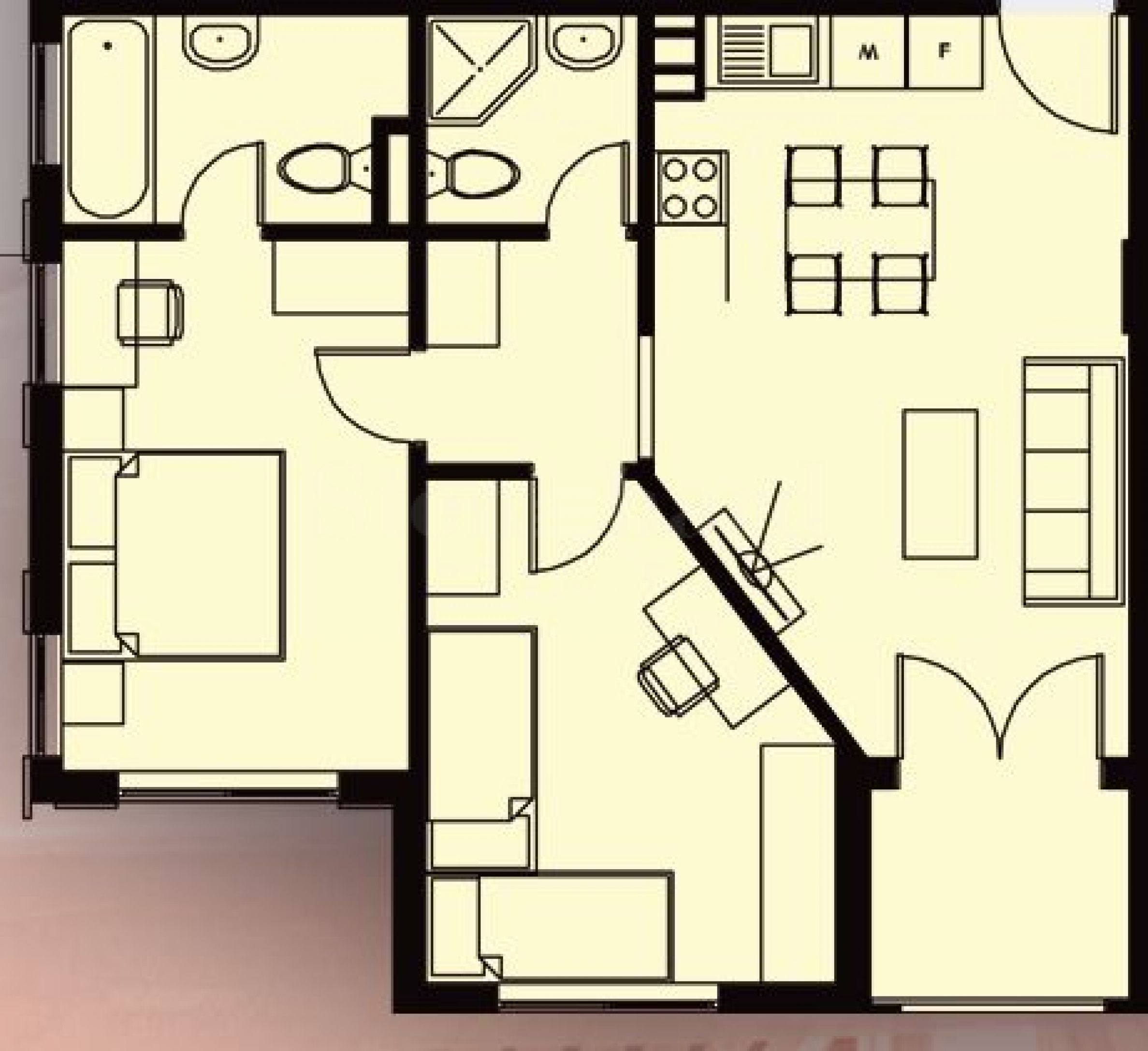 Die Wohnung befindet sich im 1. Stock und hat eine Gesamtfläche von 81,28 qm. Es besteht aus: Flur, Wohnzimmer mit Küche, 2 Schlafzimmern, 2 Bädern, Terrasse.