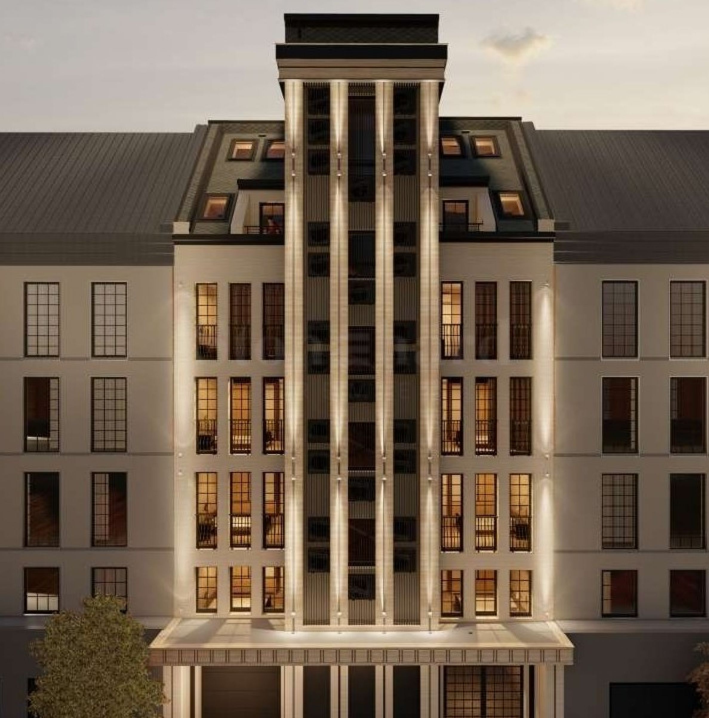 Das mit klassischer Architektur und modernem Erscheinungsbild gestaltete Gebäude liegt zwischen zwei Fallen, verteilt auf fünf Etagen mit zwei Dachgeschossen und einem Untergeschoss, mit insgesamt dreizehn Wohnungen. Es gibt eine Auswahl an Zwei- und Drei-Zimmer-Wohnungen sowie Ein-Zimmer-Wohnungen, die eine Poolbildung ermöglichen. Im Keller befinden sich Lagerräume. Für die Parkmöglichkeiten stehen 5 Parkplätze und 2 Garagenzellen im Untergeschoss sowie 3 Garagenzellen und 3 oberirdische Parkplätze im ersten Stock zur Verfügung. Die vertikale Kommunikation besteht aus einem Aufzug und einem Treppenhaus, das alle Ebenen bedient. Die Hauptfassaden des Gebäudes sind mit hochwertigen Materialien mit unterschiedlich strukturierten Bereichen aus Travertin und schmiedeeisernen Geländern mit natürlicher Patina versehen.