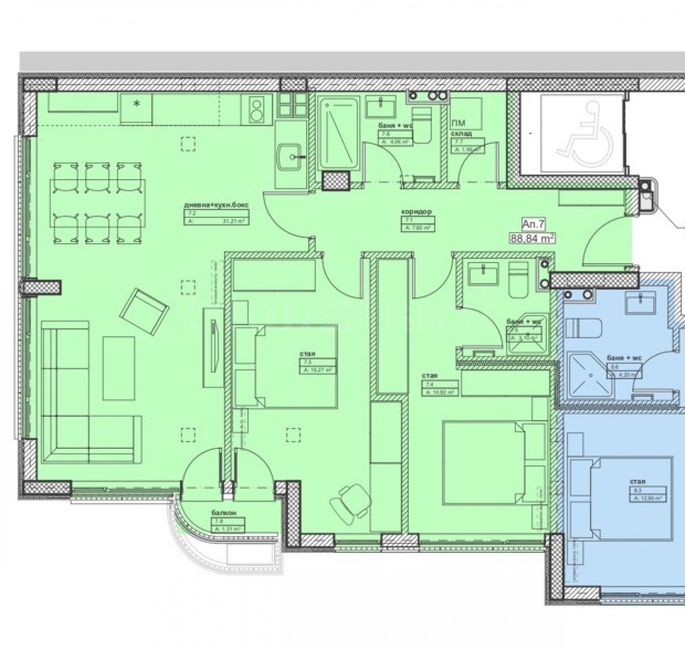 zweites Schlafzimmer mit Zugang zur Terrasse. Das Gebäude erstreckt sich über 6 Ebenen, darunter eine Untergeschossebene mit Parkplätzen und Garagen, ein Geschäft im Erdgeschoss und fünf Wohnetagen mit Zwei- und Dreizimmerwohnungen, die in einem Fertigstellungsgrad gemäß bulgarischem Zivilgesetzbuch angeboten werden. Die Beheizung erfolgt über eine Gasheizung sowie eine Multisplit-Klimaanlage.
