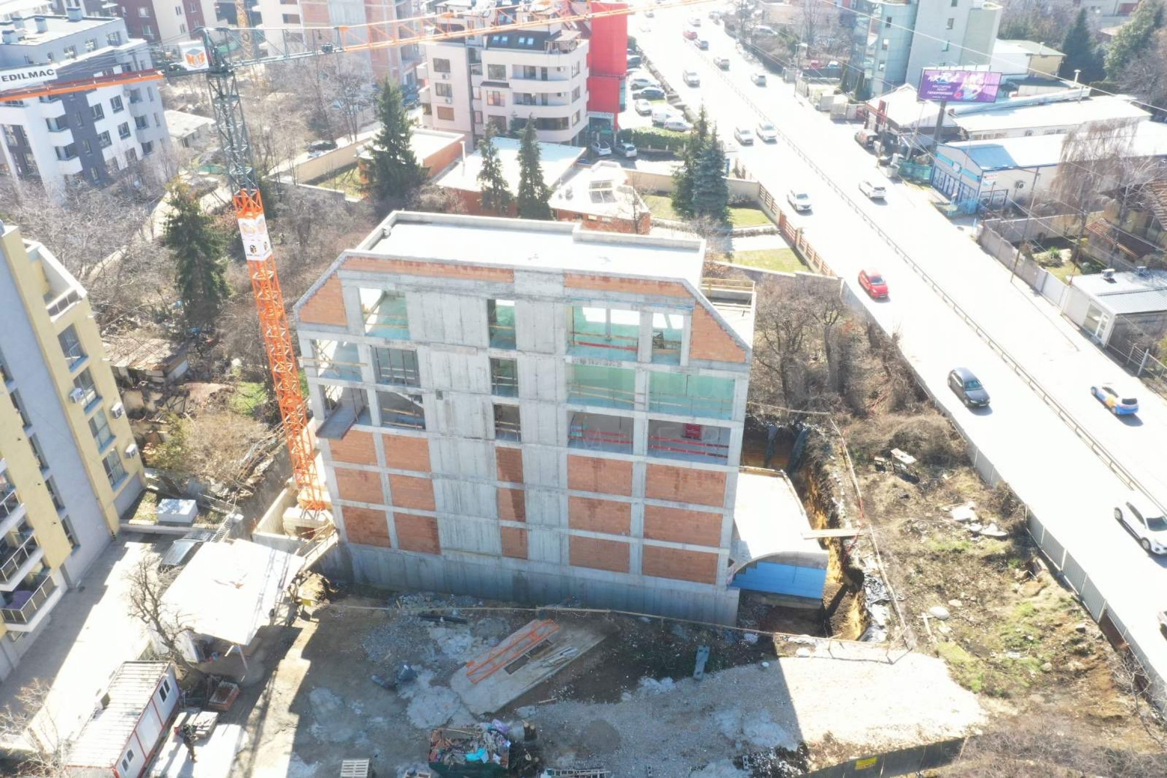 Das Gebäude erstreckt sich über 6 Ebenen, darunter eine unterirdische Ebene mit Parkplätzen und Garagen, ein Geschäft im Erdgeschoss und fünf Wohnetagen mit Zwei- und Dreizimmerwohnungen, die in einem Fertigstellungsgrad gemäß bulgarischem Zivilgesetzbuch angeboten werden. Die Beheizung erfolgt über eine Gasheizung sowie eine Multisplit-Klimaanlage.