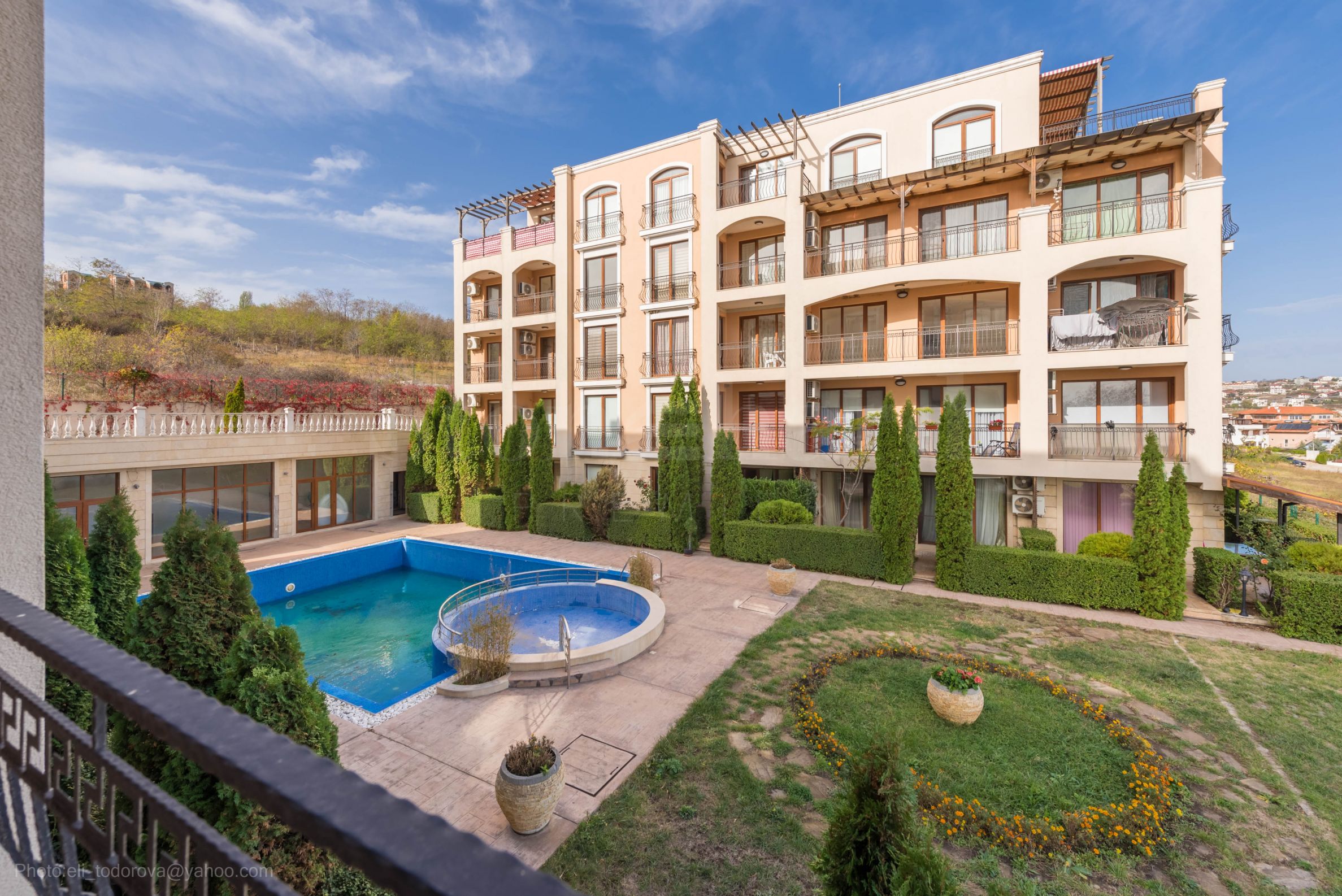 Der Komplex besteht aus zwei Gebäuden mit einem dazwischen liegenden Außenpool. Der geschlossene Komplex ist nur begrenzt zugänglich und verfügt über einen Blumengarten und einen Außenpool mit Kinderbereich. Parkmöglichkeiten gibt es auf der Straße neben dem Komplex.