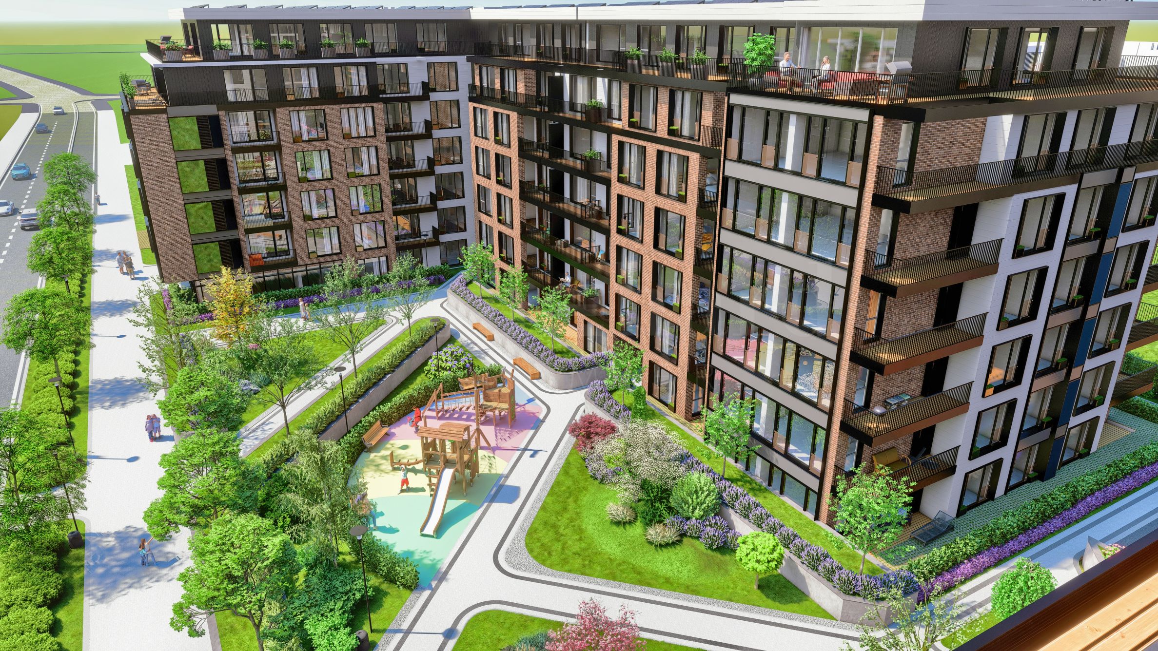 Das Projekt besteht aus 2 Gebäuden und vier Wohnabschnitten. Die Wohnabschnitte sind typisiert – gespiegelt und wiederholbar. Es bietet Studios, Ein-, Zwei-, Drei- und Vierzimmerwohnungen, Garagen und Parkplätze, die vollständig in einer Tiefgarage realisiert sind, eine Parkumgebung mit zwei Kinderbereichen – 5500 m², ein Fitnessstudio im Freien und einen Wasserspiegel.