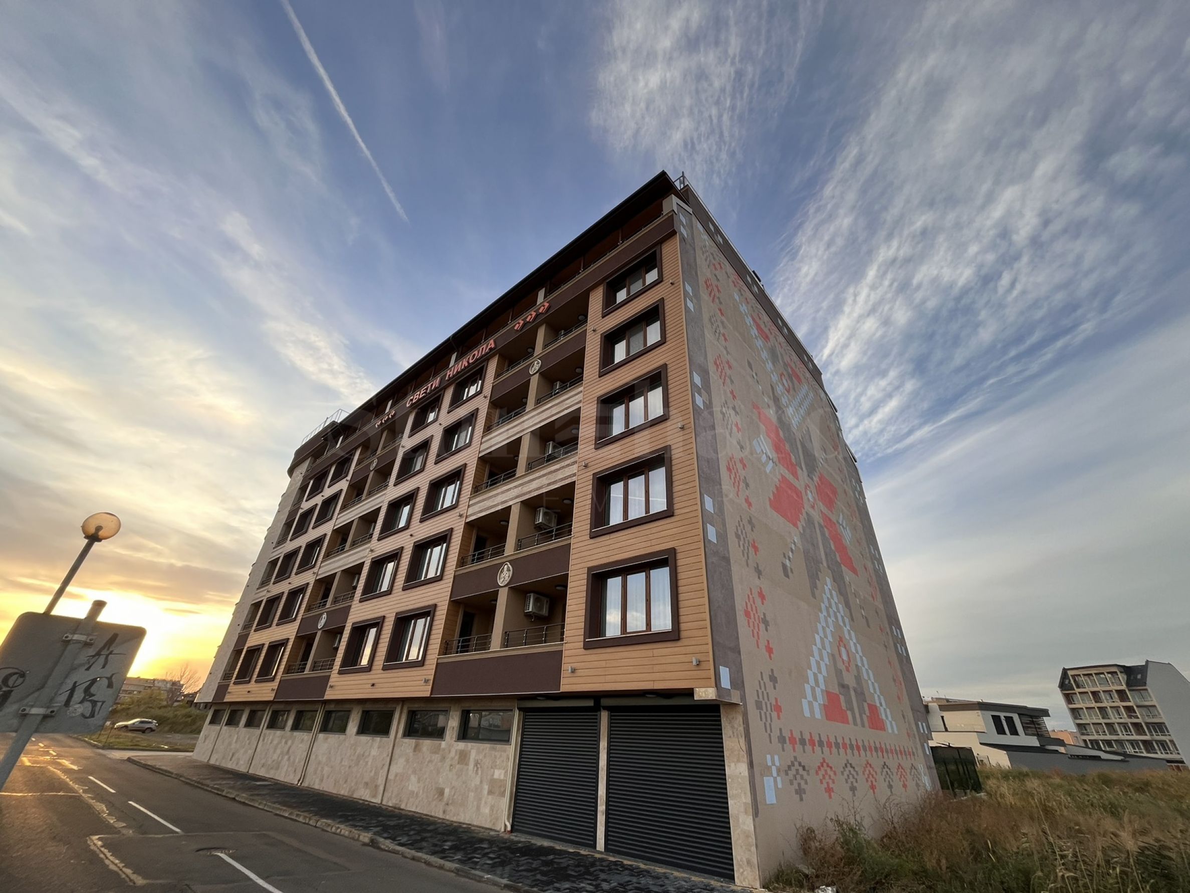 Im Erdgeschoss des Gebäudes befinden sich eine luxuriöse Eingangshalle, 6 Lagerhallen, 5 Garagen, ein Büro und 13 Geschäfte, während sich in den übrigen 6 Etagen Ein- und Zweizimmerwohnungen mit einer Fläche von 46,78 m² bis 74,92 m² befinden.