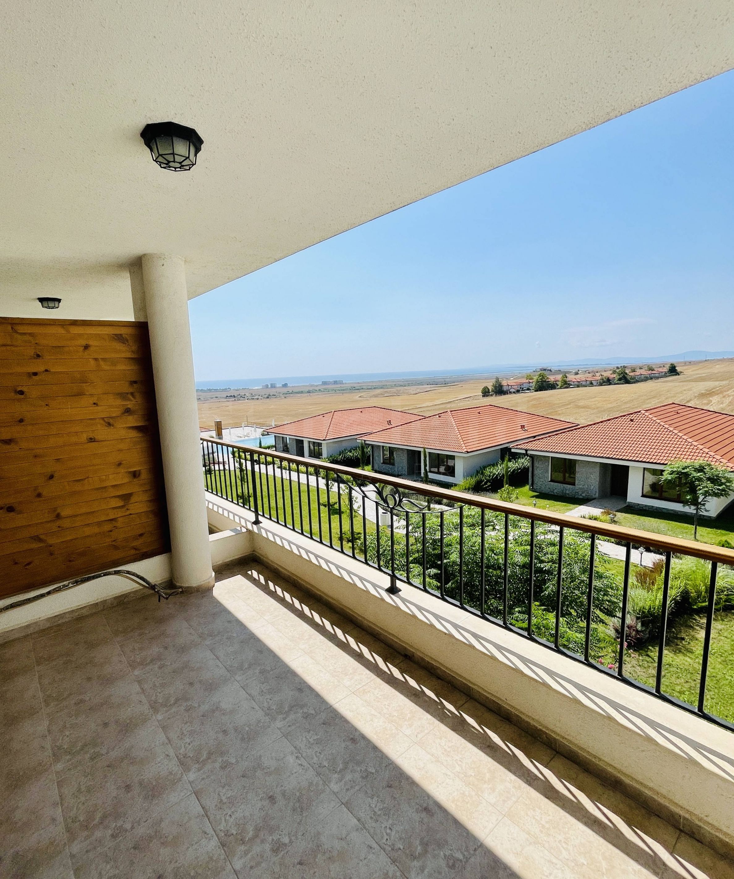 Begrünter Parkplatz im Freien. Der Komplex liegt auf einem Hügel mit atemberaubendem Meerespanorama und Blick auf Stara Planina.