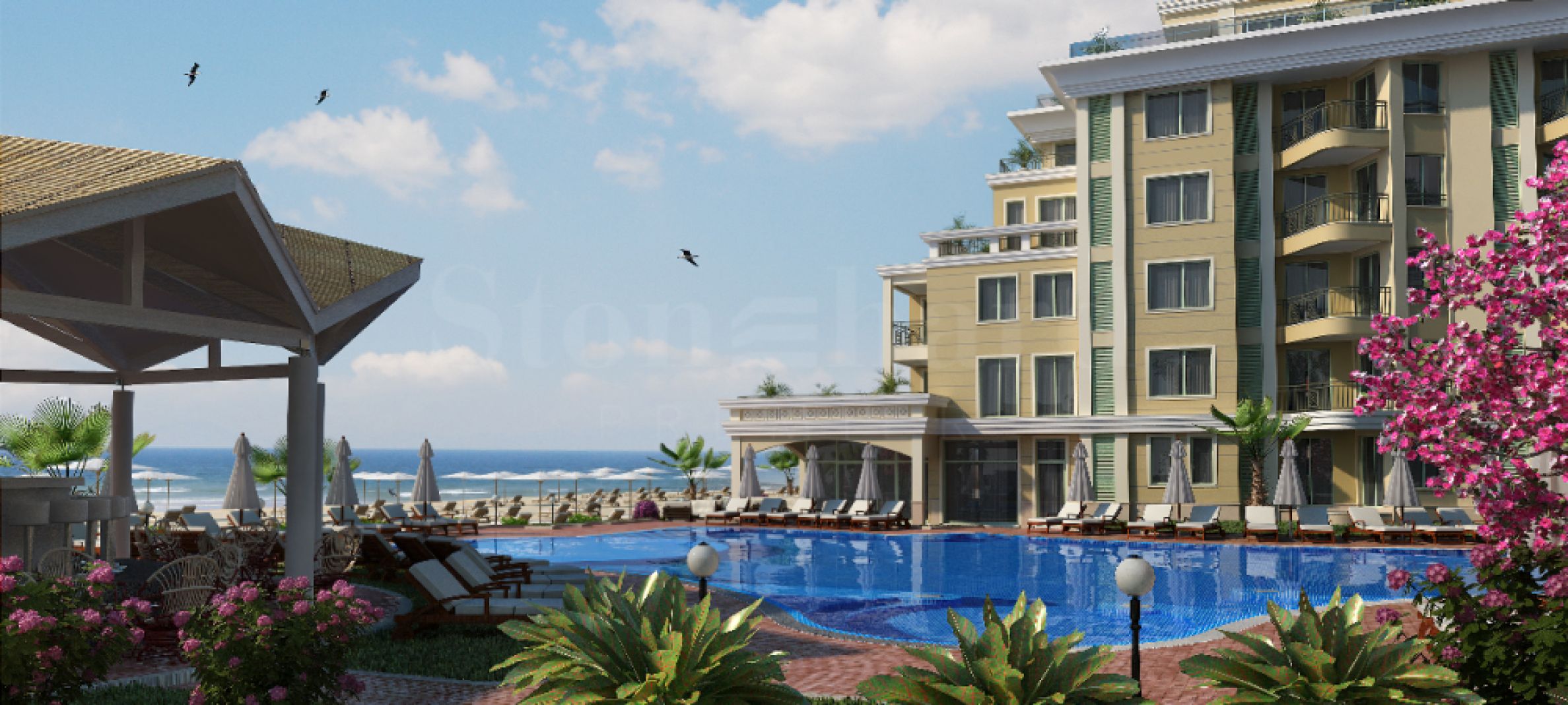 Three-room apartment with a frontal sea view in a spa complex in Pomorie