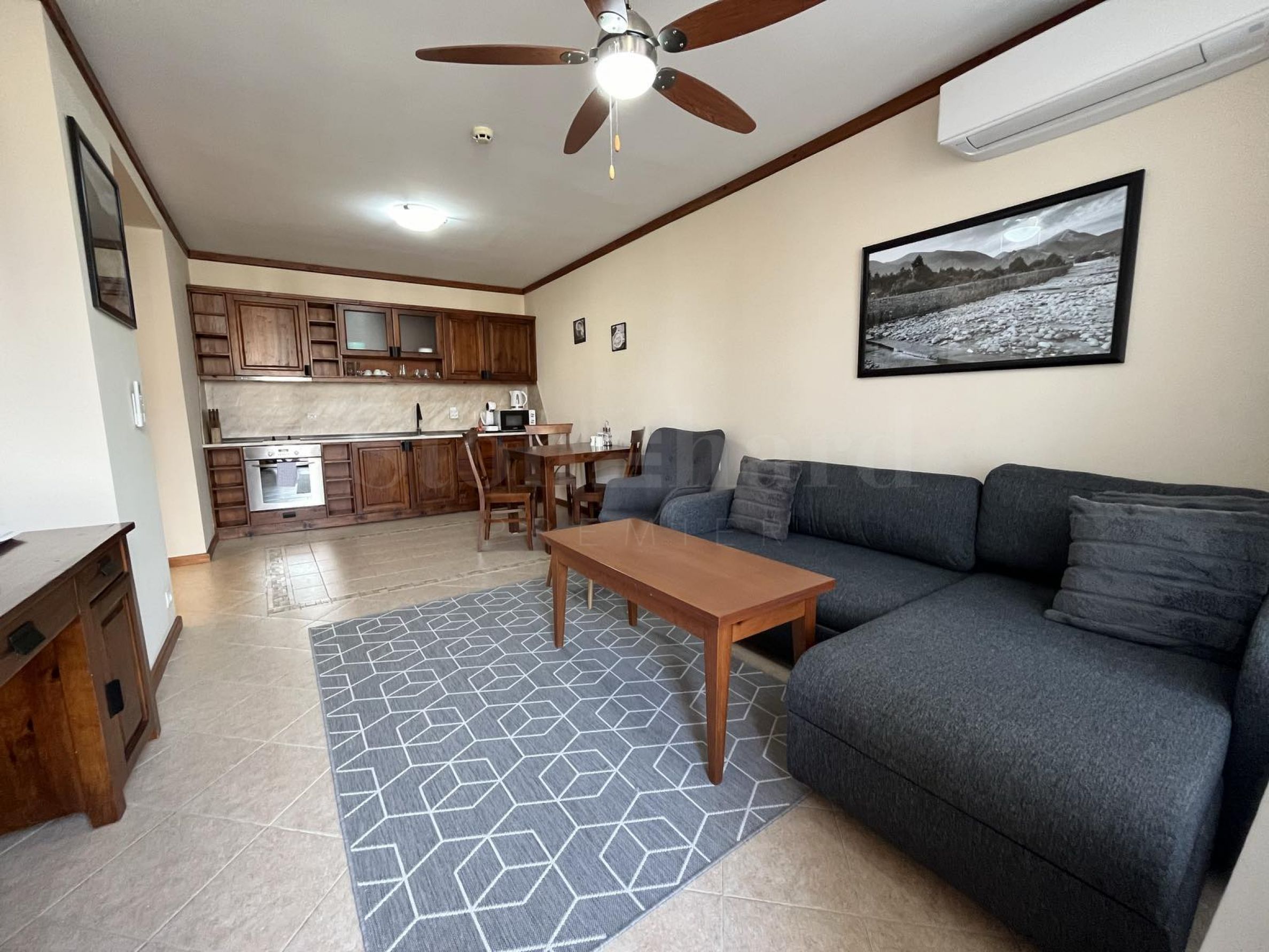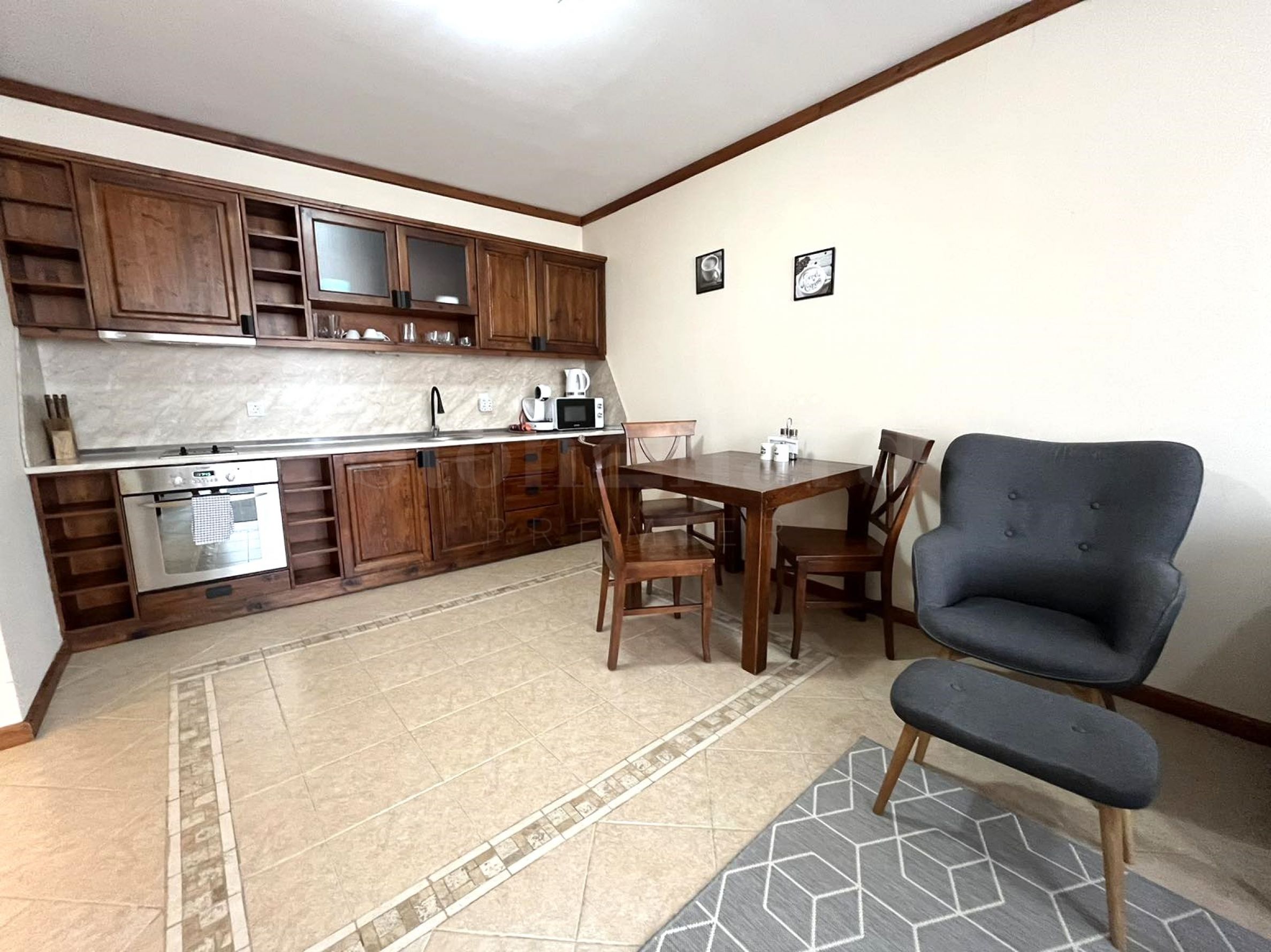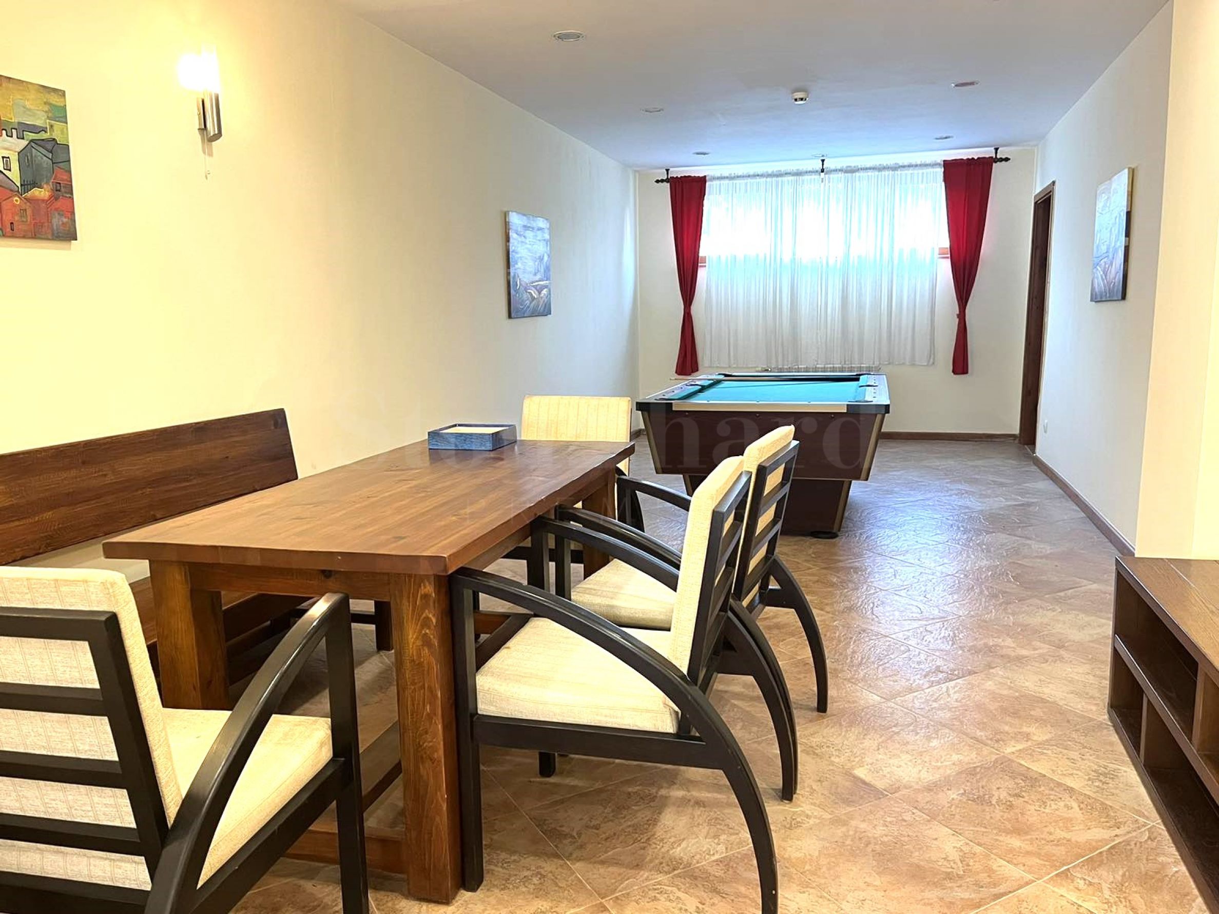 Die Wohnung befindet sich in einem Haus hinter dem Hauptgebäude. Jedes Haus verfügt über: einen Massagebereich, eine Sauna, ein Dampfbad, einen Skiraum, einen großen Grill mit Kamin, einen Billardtisch. Alle diese Extras sind nur für Eigentümer bestimmt. Die Eigentümer genießen die frische Bergluft und die Aussicht auf Pirin. Das charmante Interieur vermittelt das Gefühl von heimeliger Behaglichkeit.