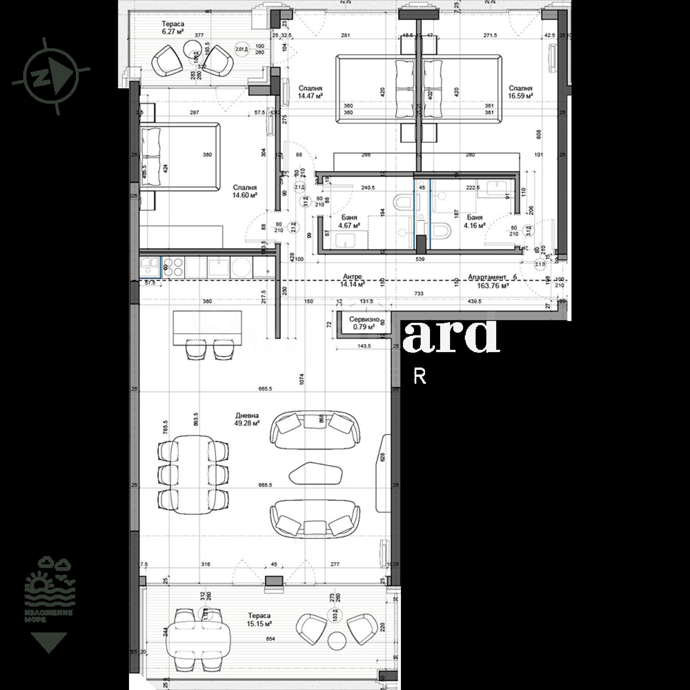 In der vierten Küstenlinie, nur 200 Meter Luftlinie vom Meer entfernt, wurden 5 Gebäude mit Schwimmbädern entworfen, jedes mit 4 Etagen plus Terrasse, mit kleineren Apartments - Studios und Zwei-Zimmer-Wohnungen, die sich im Fertigstellungszustand nach bulgarischen Baustandards befinden und optional möbliert werden können.