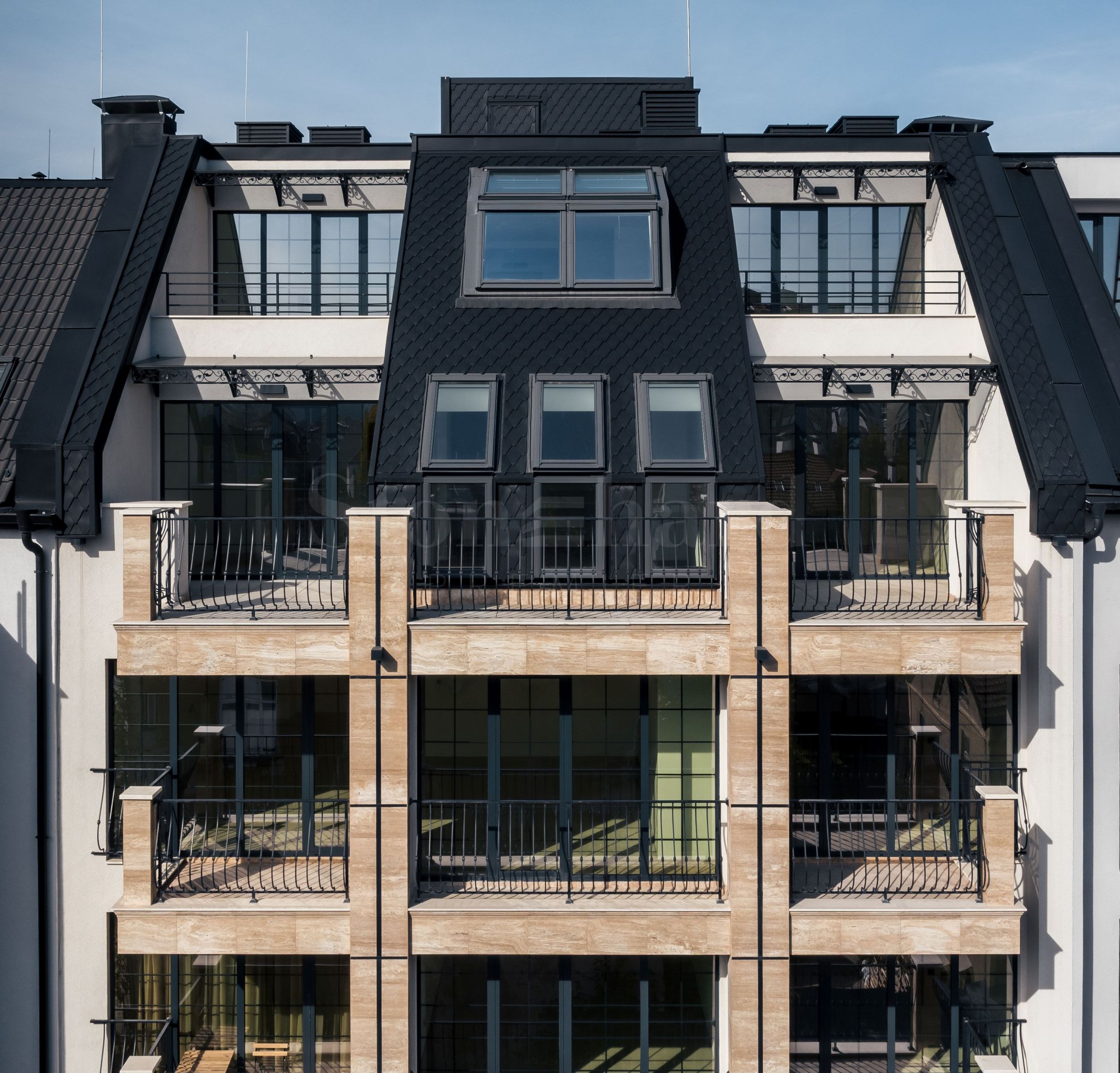 Das in klassischer Architektur und modernem Look gestaltete Gebäude liegt zwischen zwei Fluren, verteilt auf fünf Etagen, mit zwei Dachgeschossen und einem Untergeschoss, mit insgesamt dreizehn Wohnungen. Im Keller befinden sich Lagerräume. Die Parkmöglichkeiten umfassen 5 Parkplätze und 2 Garagenzellen im Untergeschoss sowie 3 Garagenzellen und 3 oberirdische Parkplätze im ersten Stock. Die vertikale Kommunikation besteht aus einem Aufzug und einem Treppenhaus, das alle Ebenen bedient. Die Hauptfassaden des Gebäudes sind mit hochwertigen Materialien gefüllt, mit unterschiedlich strukturierten Bereichen aus Travertin und schmiedeeisernen Geländern mit natürlicher Patina.