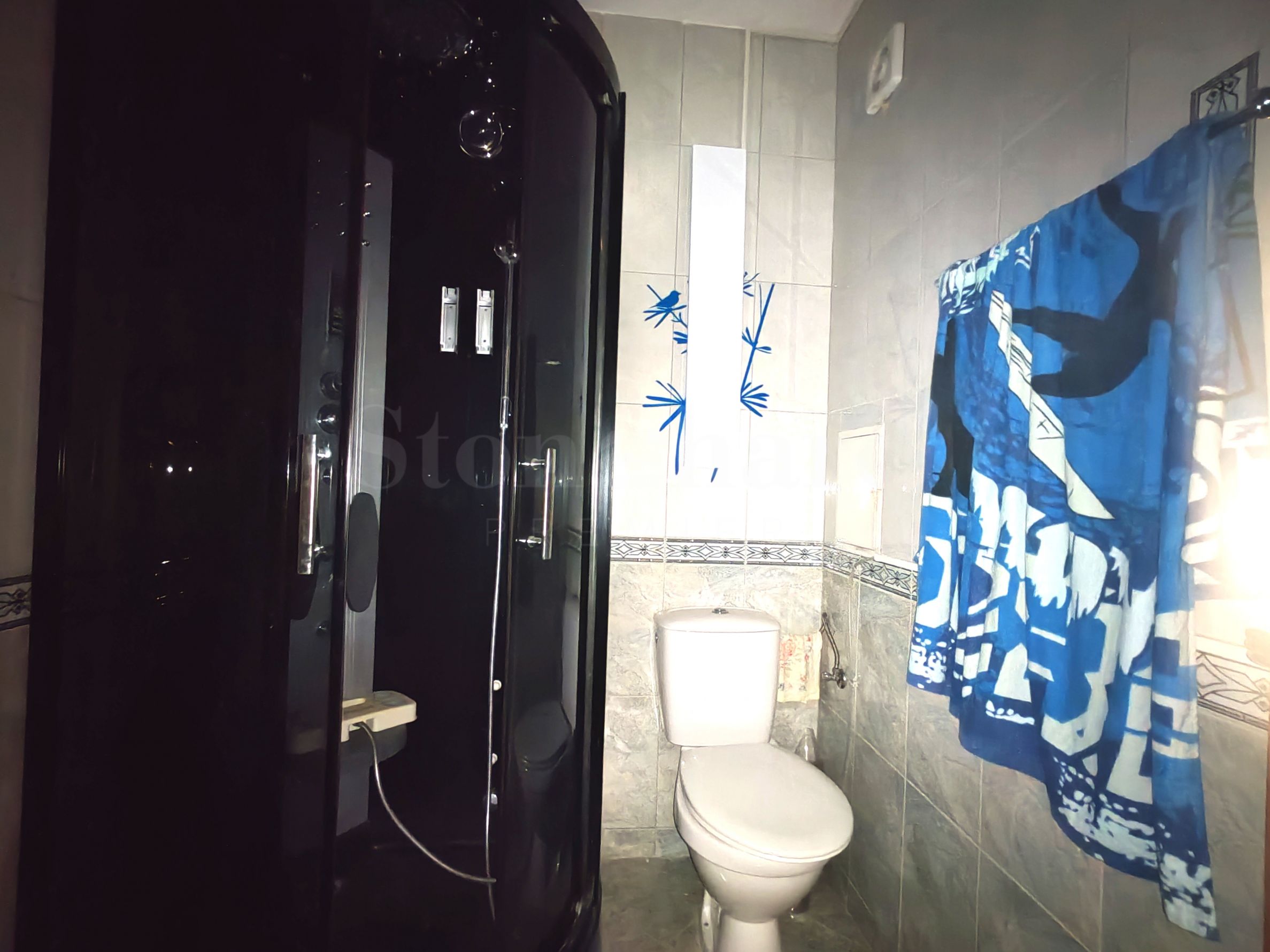 Badezimmer mit Duschkabine und Toilette,