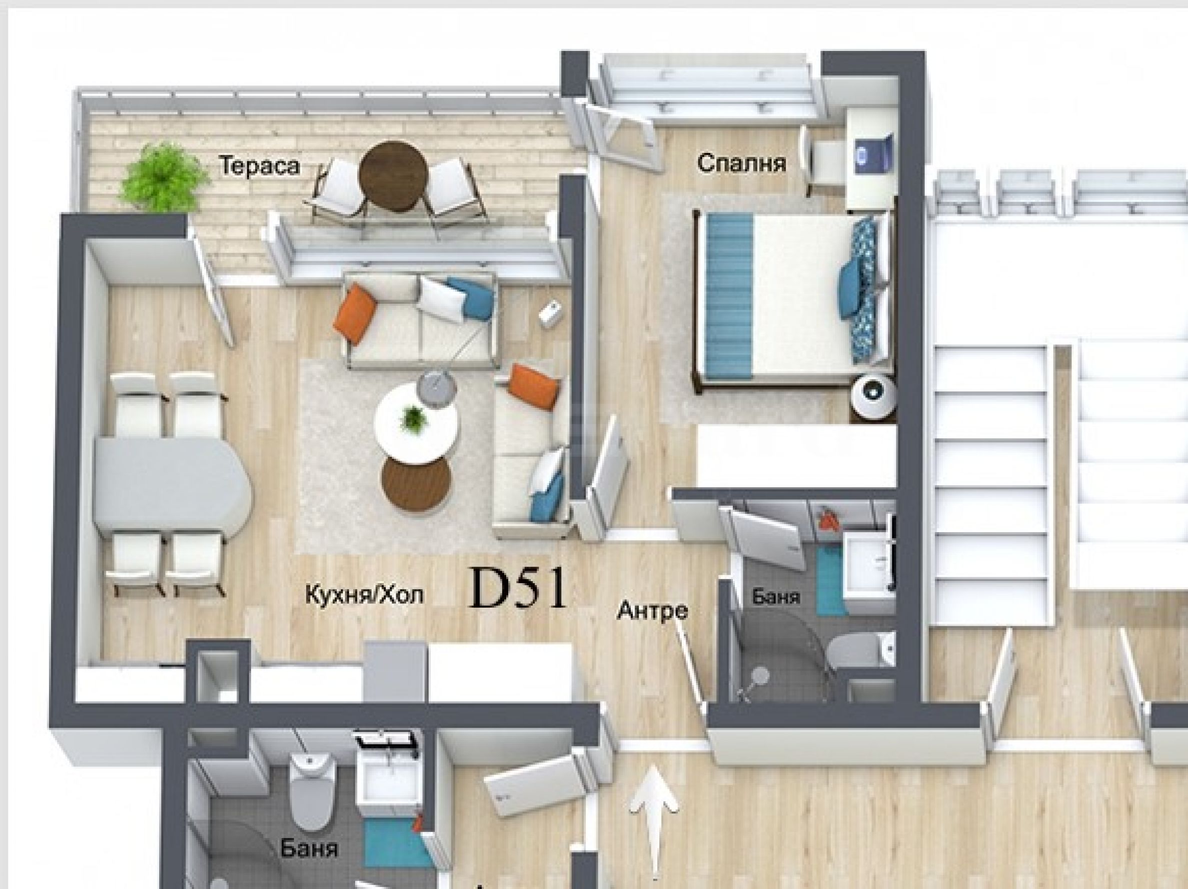 Die Immobilie mit einer Gesamtfläche von 61,54 m² befindet sich im 5. Obergeschoss und ist nach Nordosten ausgerichtet. Es besteht aus einem Vorraum, Bad/WC, Wohnzimmer mit Küche, Schlafzimmer und Terrasse zu beiden Zimmern. Die Fotos im Angebot sind beispielhaft und stammen aus der fertigen Bauphase der Anlage.