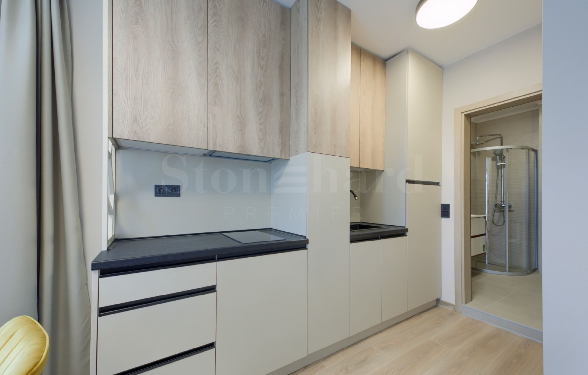 Küchenzeile mit Schränken und Elektrogeräten – eingebaute Dunstabzugshaube, Glaskeramikkochfeld mit Sensorsteuerung, eingebauter Kühlschrank mit Gefrierfach – 187 l mit den Abmessungen 1225/540/545, Spüle und Mischbatterie aus Verbundwerkstoff – Farbe Schwarz, Esstisch mit vier Stühlen, Schlafsofa, Couchtisch, Kommode mit Hocker, 43-Zoll-Fernseher, Kleiderbügel, Schuhschrank, Beleuchtungskörper, dünner Vorhang und dicke Vorhänge;