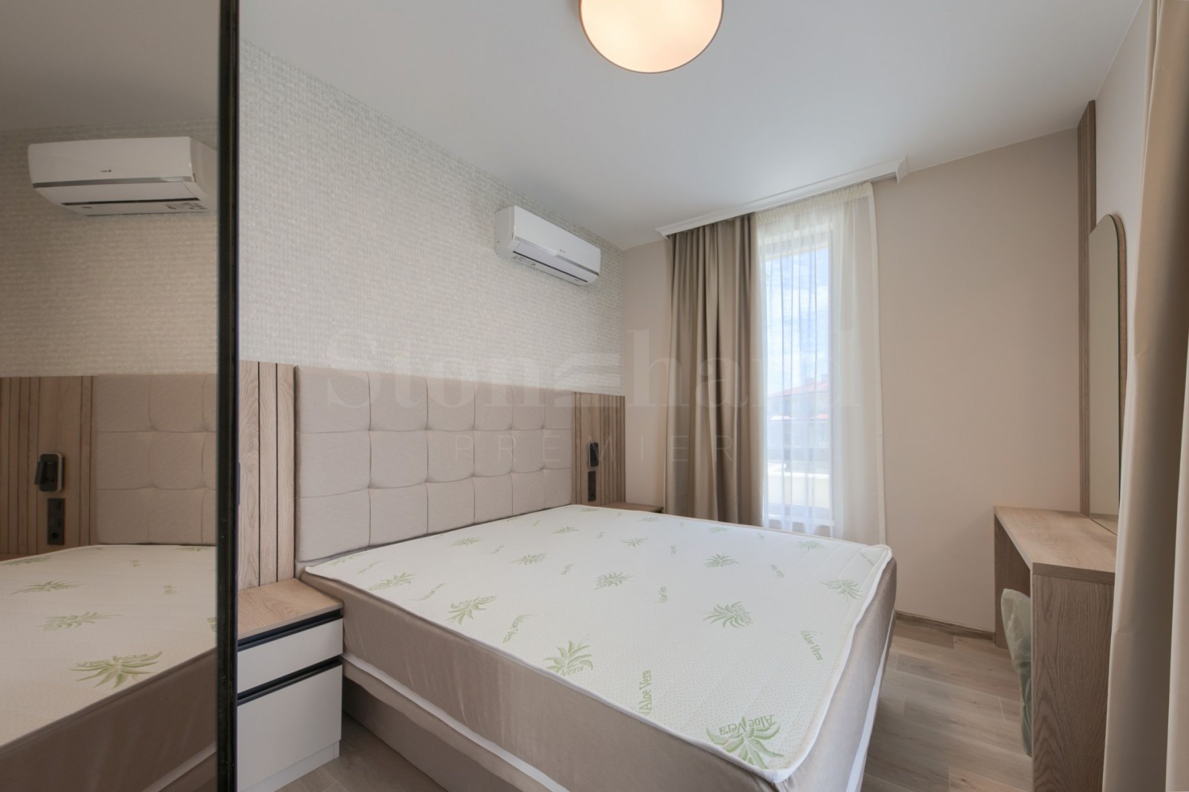Schlafzimmer – Laminatboden, Wände und Decken – verputzt und mit Latex gestrichen, dekorative Tapeten, eingebaute Schalter, Steckdosen und Wandsteckdosen, individuelle Klimaanlage, Schlafzimmergröße 160/200, 2 Nachttische, Frisiertisch mit Kommode, Spiegel, Hocker, Kleiderschrank, Beleuchtungskörper, dünne Vorhänge und dicke Vorhänge;