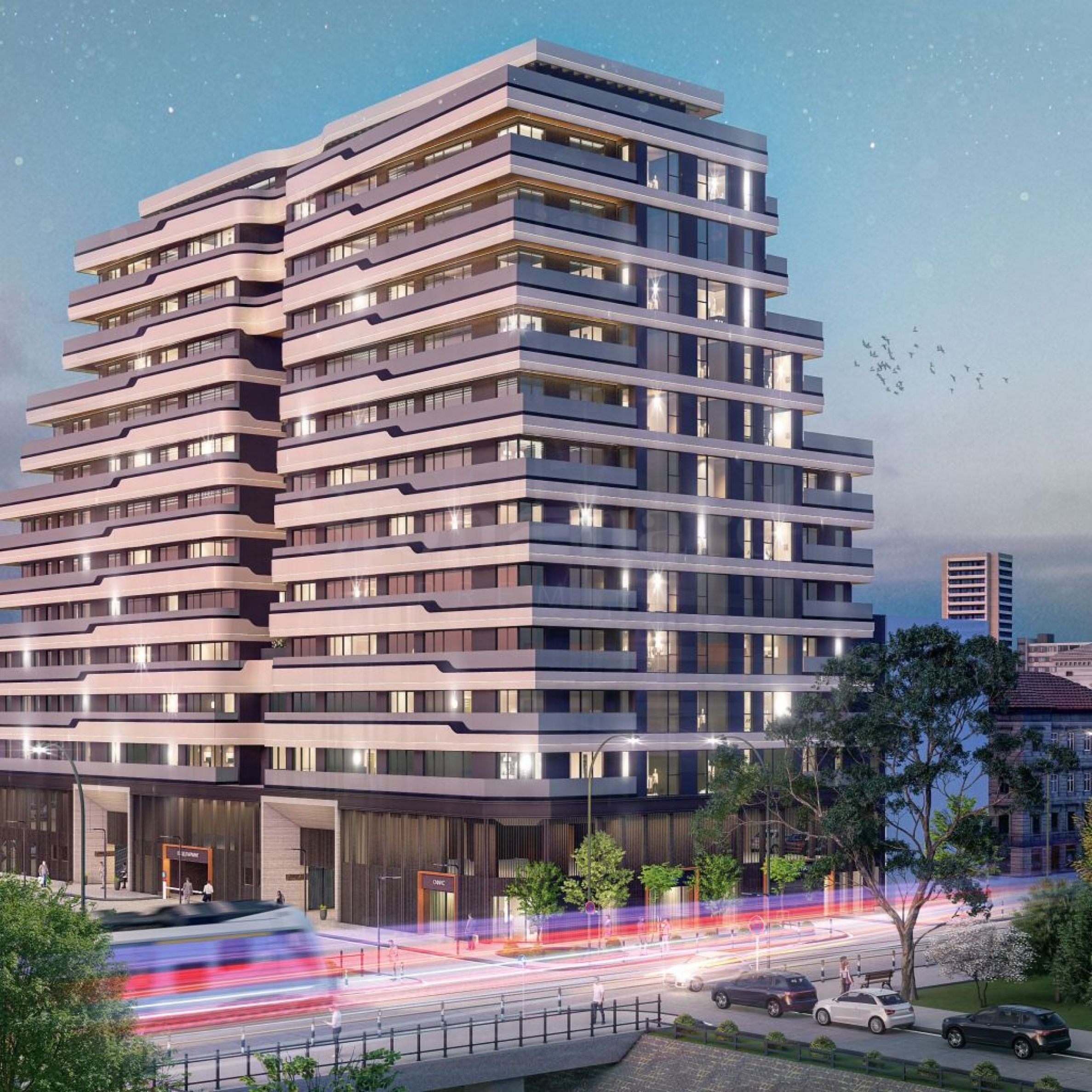 Im obersten 14. Stock befindet sich eine Mehrzimmerwohnung mit privater Dachterrasse, die einen Panoramablick über die Stadt bietet.