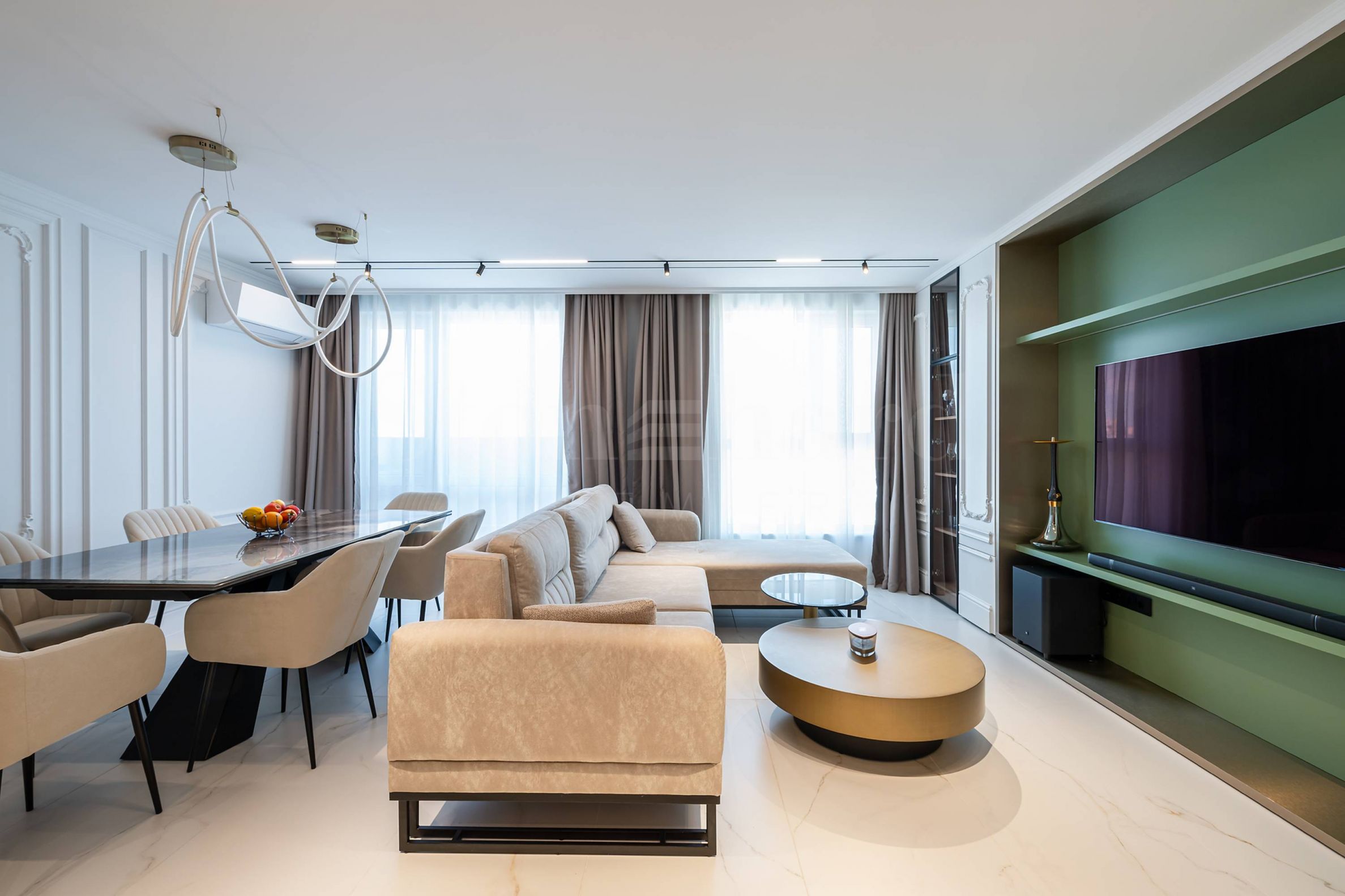 Die Wohnung hat eine Fläche von 180 m², liegt im 12. Stock und bietet eine wunderschöne Aussicht auf die Stadt, den Garten und das Meer.