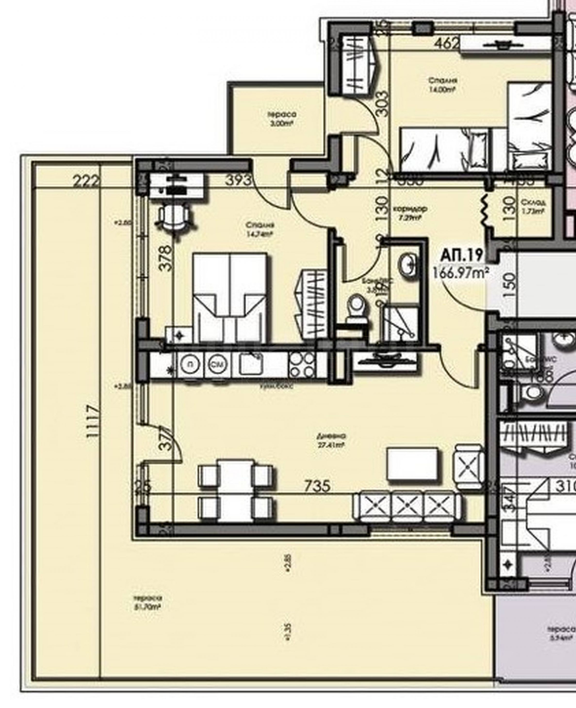 geräumige Terrasse. Die Wohnung verfügt über einen angrenzenden Abstellraum von 4,28 m². Sie wird in einem nach bulgarischen Standards fertiggestellten Zustand mit Putz und Estrich, hochwertiger Neubau, vermietet. Sie eignet sich sowohl für den Eigengebrauch, als Investition in die Vermietung als auch zum ganzjährigen Wohnen.