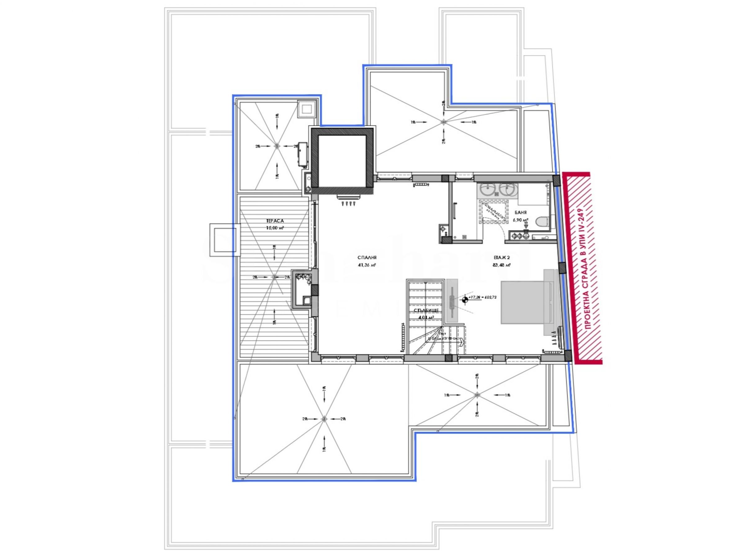 Zweiter Stock (Gesamtfläche: 99,56 m²): großes Hauptschlafzimmer mit Bad und Panoramaterrasse von 15 m². Gebäudekonzept