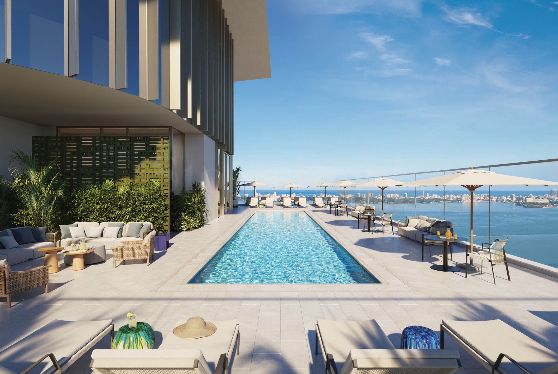 Das Gebäude verfügt über zwei Swimmingpools: einen auf der Terrasse im achten Stock und einen weiteren im obersten Stockwerk. Ersteres verfügt über eine eigene Bar mit Getränken und Speisen, Cabanas, Entspannungsbereiche und einen Garten, während Letzteres einen 360-Grad-Panoramablick auf die Stadt und das Meer bietet und so das Gefühl vermittelt, in die pulsierende Stadt einzutauchen. Im achten Stock finden Sie außerdem Kinderzimmer mit vielfältigen Unterhaltungsmöglichkeiten, einen Arcade-Raum, Sportsimulatoren und ein Freiluftkino.