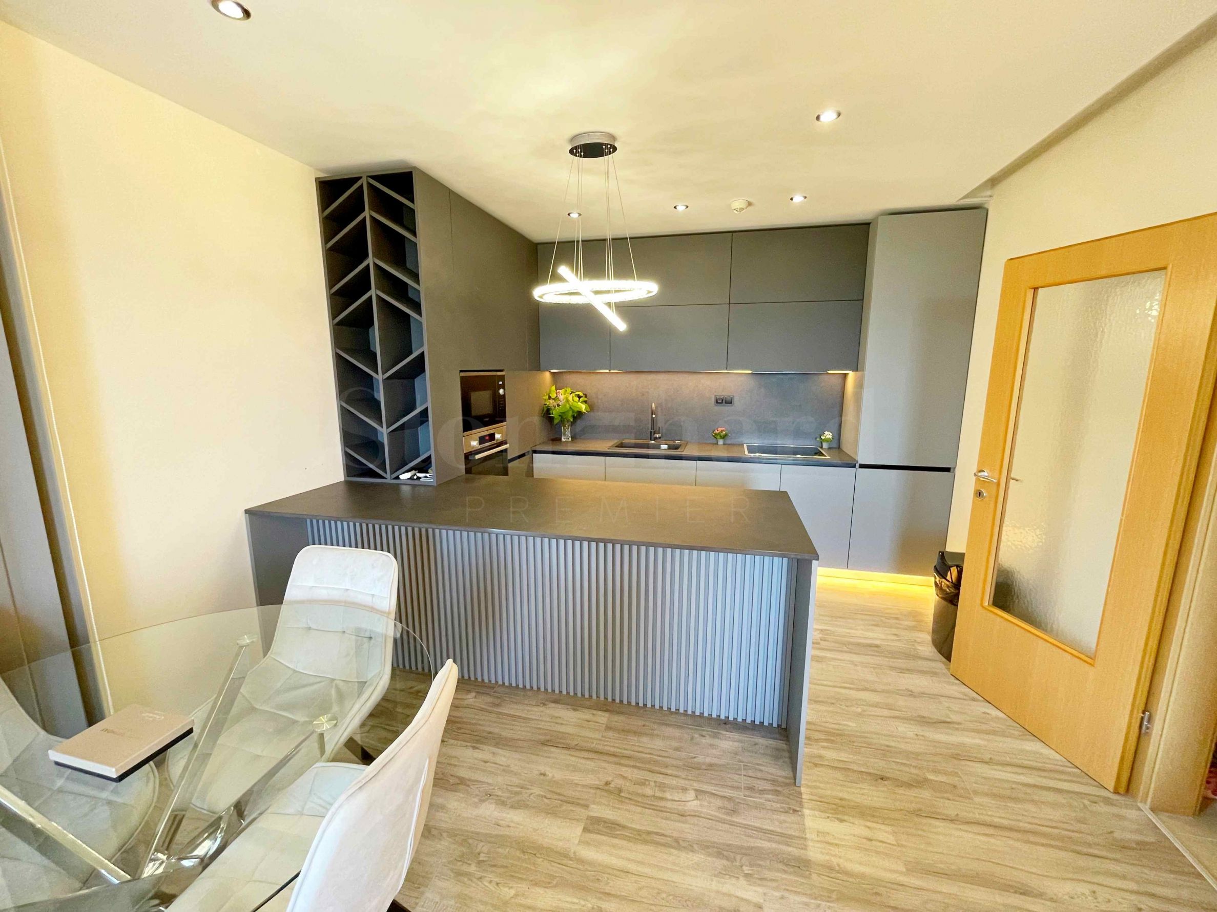 eine wunderbare Terrasse mit einer Fläche von ca. 35 qm, die nach Süden ausgerichtet ist und einen schönen Blick auf einen Mischwald bietet. Die Wohnung ist komplett und geschmackvoll mit hochwertigen Materialien, Möbeln und Geräten eingerichtet. Die Küche ist komplett mit Einbaugeräten von Elite-Marken ausgestattet und verfügt über eine LED-Hintergrundbeleuchtung, die auch auf der Dekorplatte an der Wand hinter den Polstermöbeln vorhanden ist. Alle Zimmer sind klimatisiert.