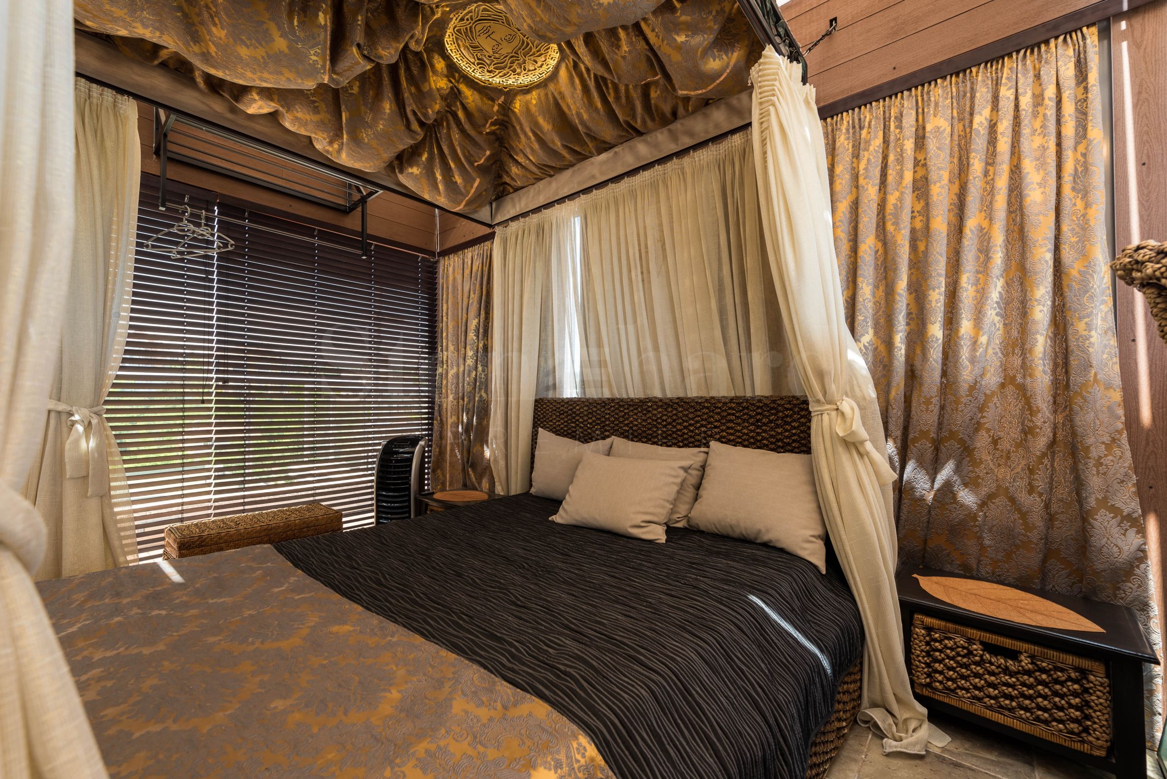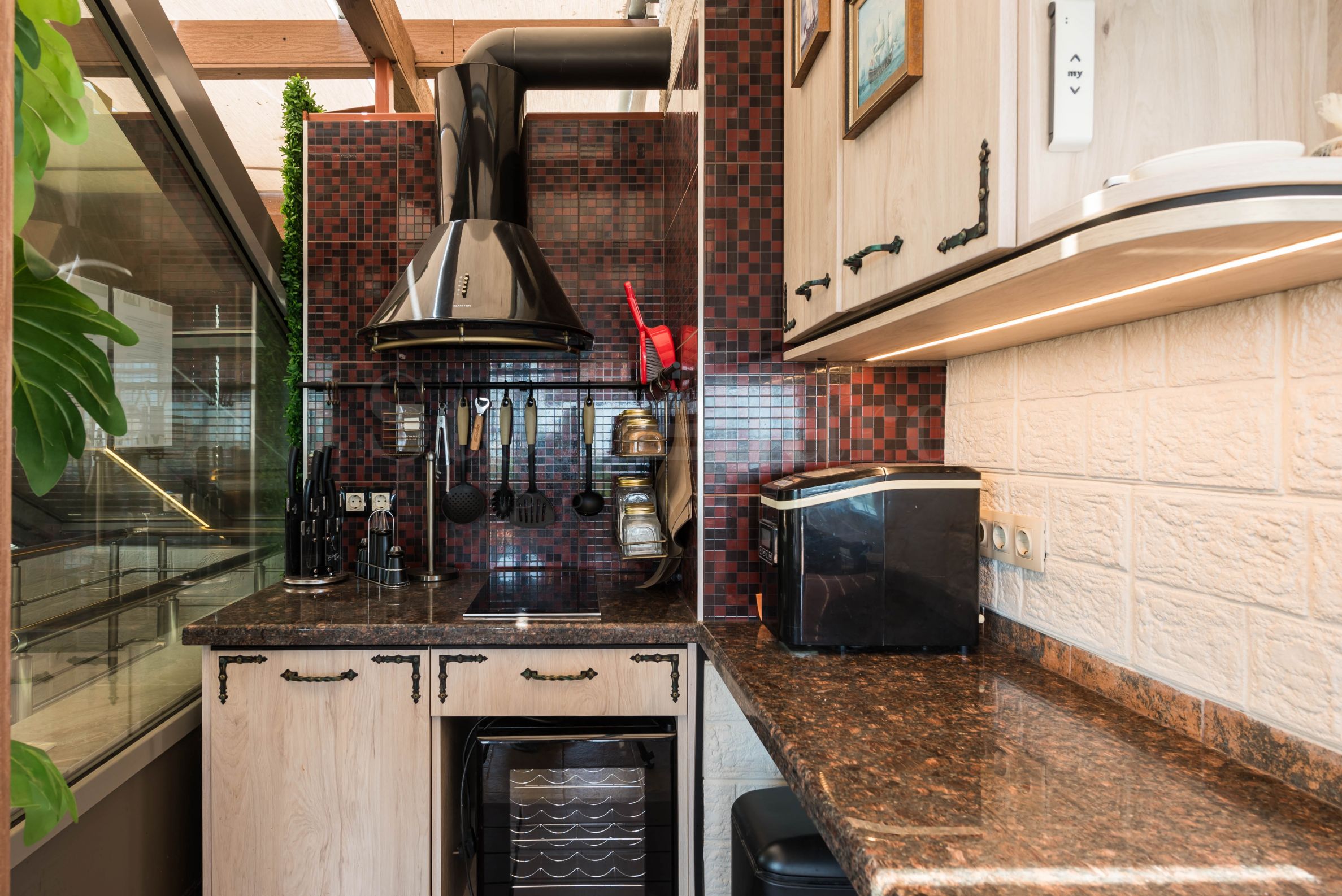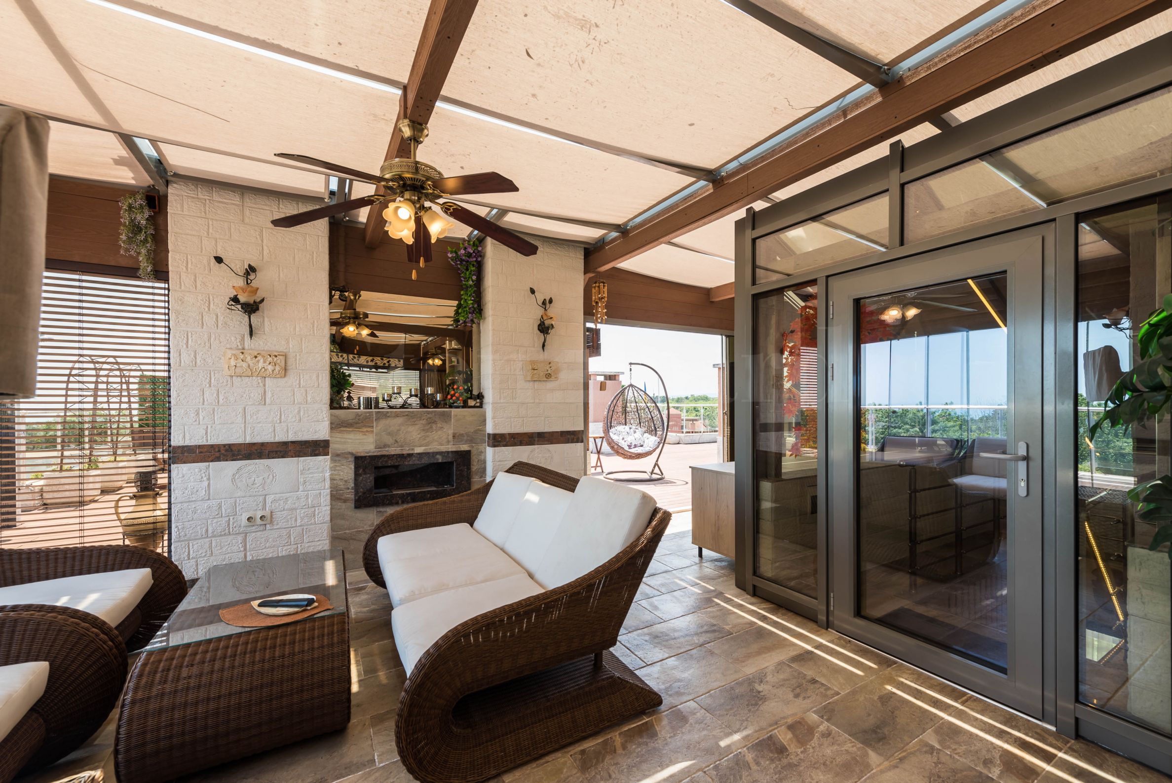 Der Zugang zur verglasten zweiten Ebene erfolgt über eine Glastreppe im Wohnzimmer. Die Böden bestehen aus hochwertigen italienischen Granitfliesen. Es gibt eine Sommerküche mit Geschirrspüler und allen Annehmlichkeiten. Eine geräumige, quadratische Bartheke mit einem eingebauten Springbrunnen sorgt an heißen Sommertagen und -nächten für Erfrischung. Auf der zweiten Ebene befinden sich ein Schlafzimmer mit schmiedeeisernen Möbeln und ein verstecktes WC. Im Ruhebereich befindet sich ein eingebauter Bioethanol-Kamin, die Möbel bestehen aus natürlichem Rattan. Ein Fernseher ist auf einem Ständer montiert, der sich zum Ruhebereich oder zum großen Küchentisch drehen lässt. Das Heimkinosystem verfügt über einen Projektor und eine Leinwand, die auf die große Dachterrasse hinausragt. Das integrierte Soundsystem mit zwei Zonen lässt sich bequem über eine Smartphone-App steuern. So können Sie Ihre Lieblingsmusik auswählen und wechseln, ohne vom bequemen Loungesessel aufstehen zu müssen. Der große Küchentisch wurde auf die Dachterrasse verlegt, eine elektrische Markise spendet jedoch auch an heißen Sommertagen kühlen Schatten. Zu diesem Zweck wurde auch ein Deckenventilator installiert. Die Beleuchtung der zweiten Ebene ist so konzipiert, dass sie zwei Betriebsmodi bietet. Einer ist ein Hintergrund mit leicht flackerndem Licht der Wandlampen, der andere Modus sorgt für angenehme Beleuchtung während der Nachtstunden. Die Lampen sind aus Schmiedeeisen gefertigt.
