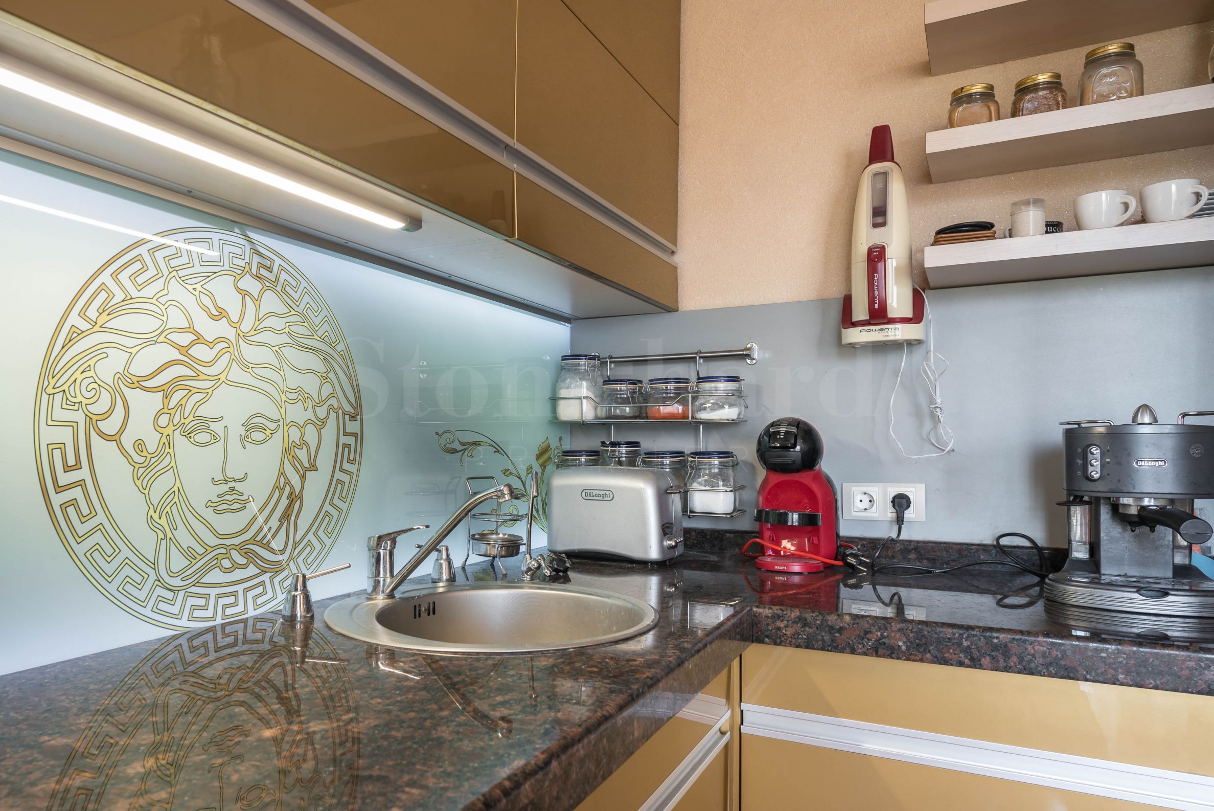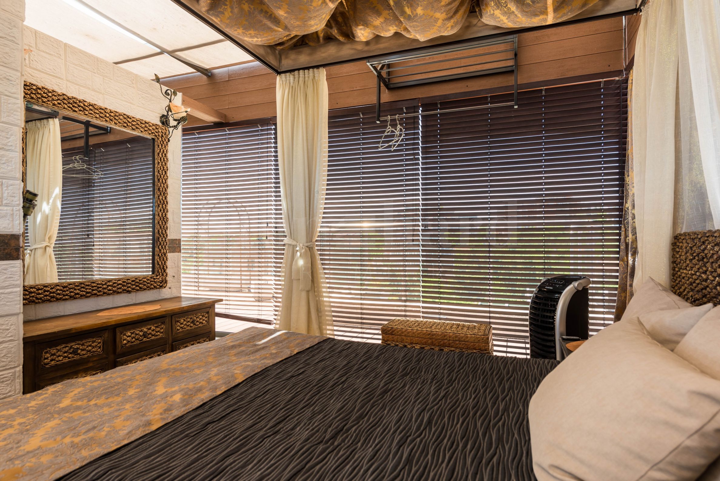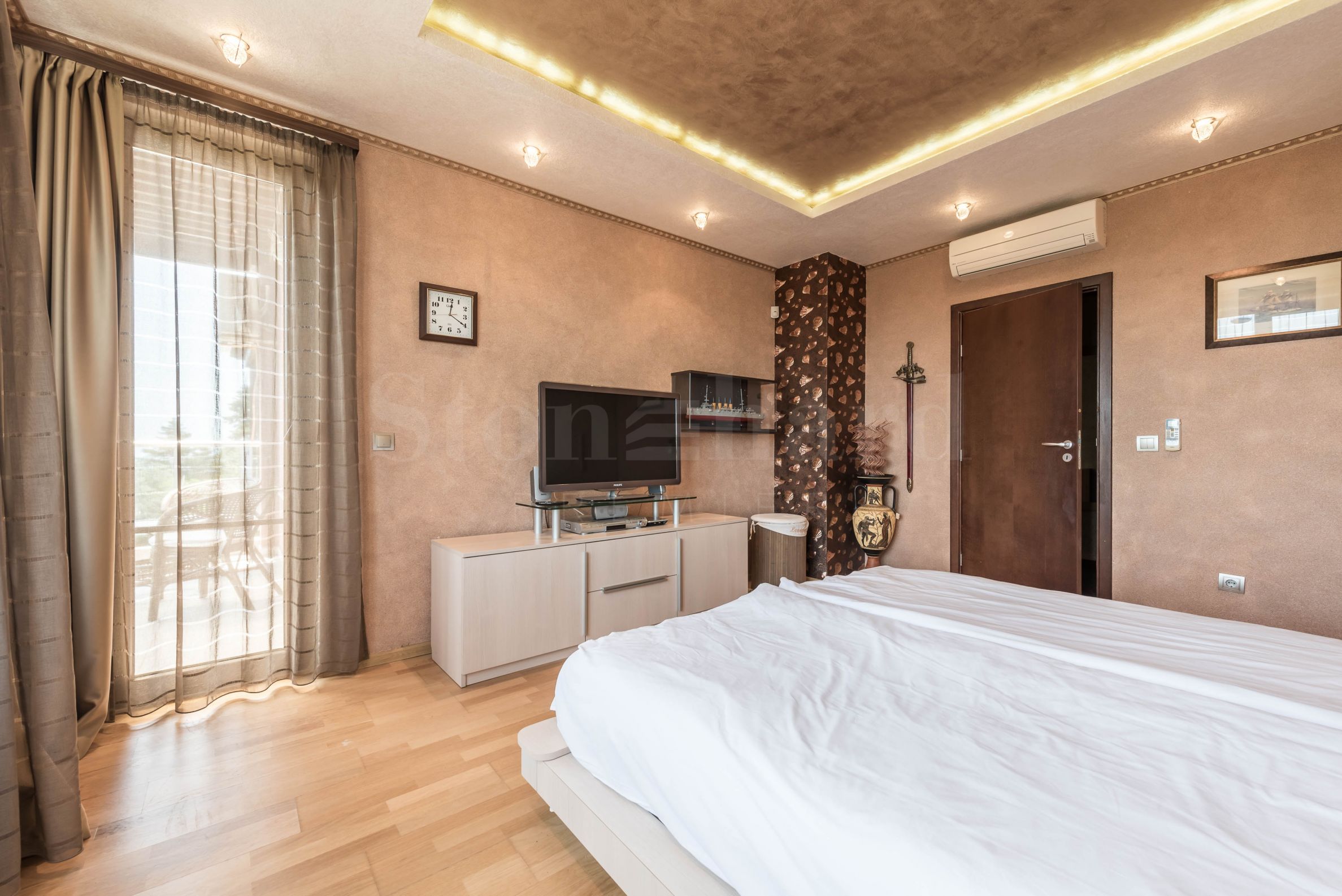 Der Zugang zur verglasten zweiten Ebene erfolgt über eine Glastreppe im Wohnzimmer. Die Böden bestehen aus hochwertigen italienischen Granitfliesen. Es gibt eine Sommerküche mit Geschirrspüler und allen Annehmlichkeiten. Eine geräumige, quadratische Bartheke mit einem eingebauten Springbrunnen sorgt an heißen Sommertagen und -nächten für Erfrischung. Auf der zweiten Ebene befinden sich ein Schlafzimmer mit schmiedeeisernen Möbeln und ein verstecktes WC. Im Ruhebereich befindet sich ein eingebauter Bioethanol-Kamin, die Möbel bestehen aus natürlichem Rattan. Ein Fernseher ist auf einem Ständer montiert, der sich zum Ruhebereich oder zum großen Küchentisch drehen lässt. Das Heimkinosystem verfügt über einen Projektor und eine Leinwand, die auf die große Dachterrasse hinausragt. Das integrierte Soundsystem mit zwei Zonen lässt sich bequem über eine Smartphone-App steuern. So können Sie Ihre Lieblingsmusik auswählen und wechseln, ohne vom bequemen Loungesessel aufstehen zu müssen. Der große Küchentisch wurde auf die Dachterrasse verlegt, eine elektrische Markise spendet jedoch auch an heißen Sommertagen kühlen Schatten. Zu diesem Zweck wurde auch ein Deckenventilator installiert. Die Beleuchtung der zweiten Ebene ist so konzipiert, dass sie zwei Betriebsmodi bietet. Einer ist ein Hintergrund mit leicht flackerndem Licht der Wandlampen, der andere Modus sorgt für angenehme Beleuchtung während der Nachtstunden. Die Lampen sind aus Schmiedeeisen gefertigt.