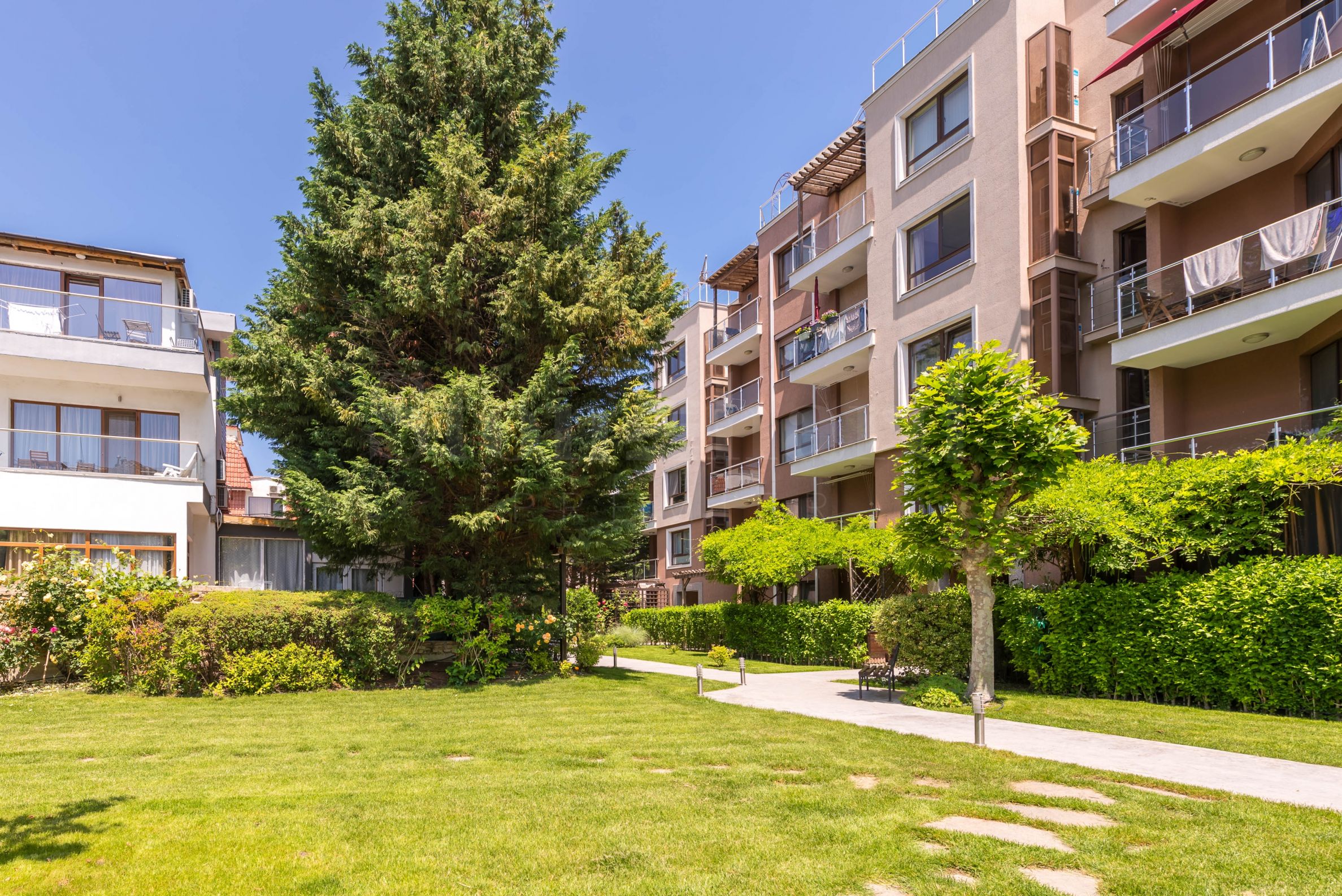 Der Komplex hat eine Fläche von 2218 m² und bietet einen Außenpool, Grünflächen, Gärten, einen Mineralwasserbereich und kontrollierten Zugang. Er liegt im südlichen Teil von St. Konstantin und Helena, nur wenige Meter vom Euxinograd-Palast entfernt. In unmittelbarer Nähe befinden sich saubere und gepflegte Strände, Hotels, Einkaufszentren, Restaurants, Mineralpools und SPA-Komplexe, ein Open-Air-Kino, ein Lidl-Supermarkt, Haltestellen des öffentlichen Nahverkehrs und zahlreiche Attraktionen im Sommer.