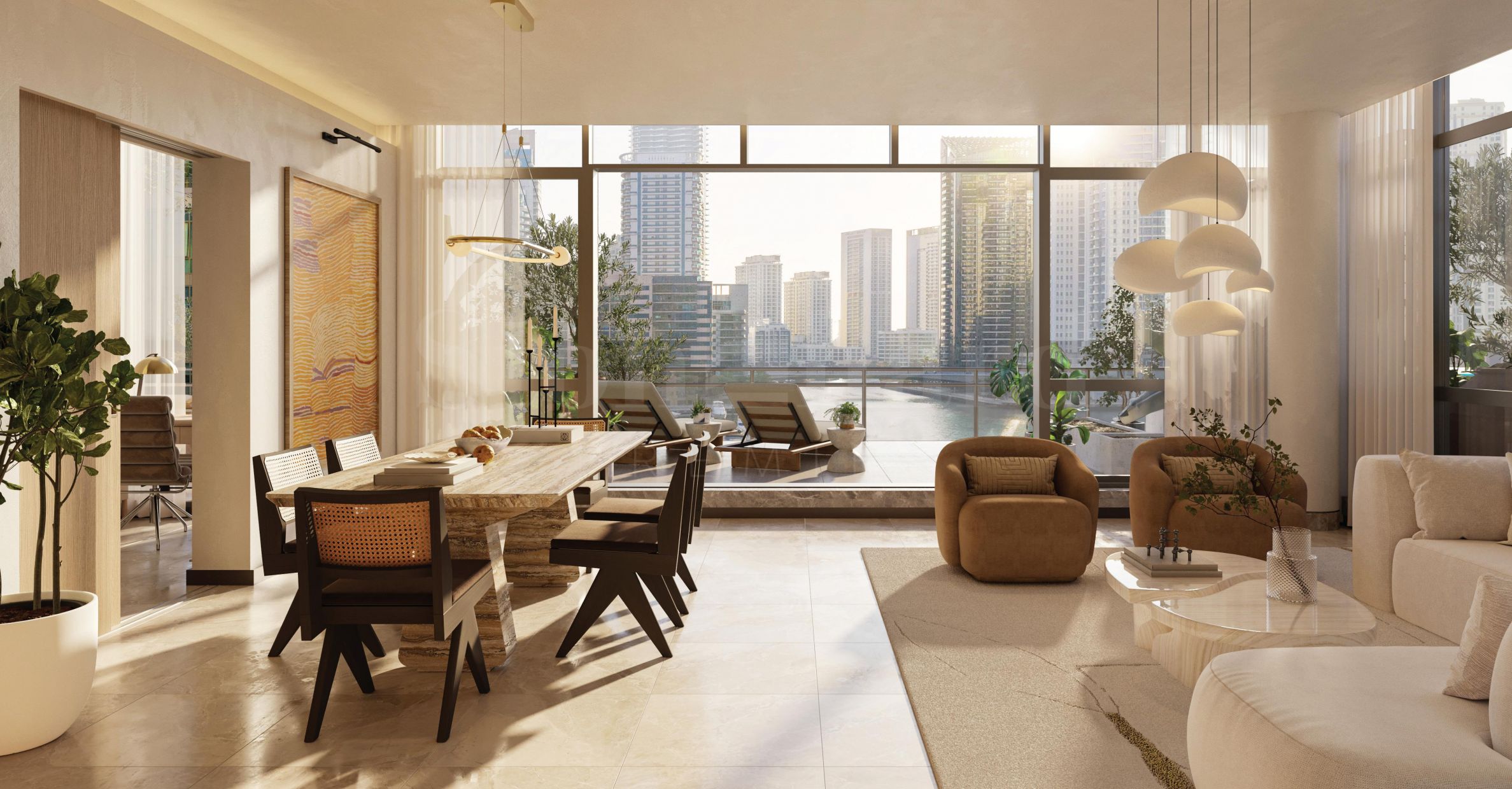 Die Wohnung hat eine Gesamtfläche von 116,50 m² und besticht durch ein durchdachtes Innendesign, das auf Luxus und Privatsphäre der Bewohner ausgelegt ist. Die Eingangshalle führt zu sorgfältig abgetrennten Bereichen, die Ruhe und Funktionalität gewährleisten. Das geräumige Wohnzimmer vereint Küche, Esszimmer und Ruhebereich. Bodentiefe Fenster durchfluten die Wohnung mit Licht und öffnen den Innenraum für das umliegende Stadtpanorama. Die harmonische Verschmelzung von Innenräumen und Außenterrasse vermittelt ein Gefühl von Freiheit und Leichtigkeit – perfekt für einen modernen Lebensstil.