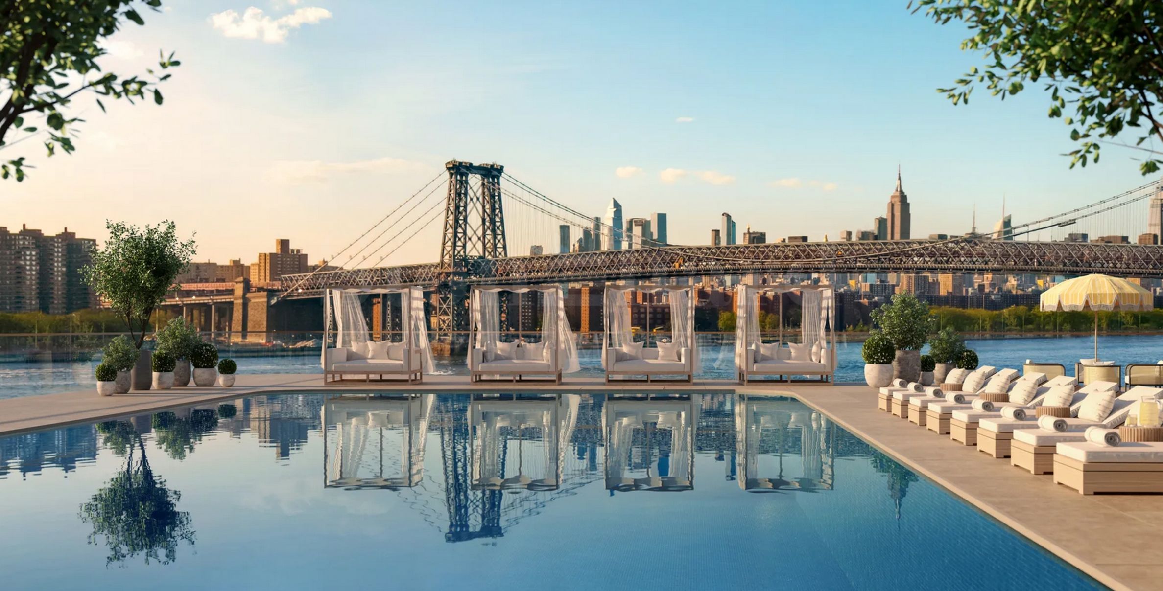 Imagine starting your mornings with an energizing jog along the riverfront promenade, taking in the majestic skyline of Manhattan; enjoying a workout in the state-of-the-art fitness center with dedicated spa areas; or relaxing on the rooftop — a true New York highlight — featuring an infinity pool with endless views of the city and the East River. In winter, this rooftop transforms into a magical ice-skating rink, perfect for endless hours of seasonal joy.