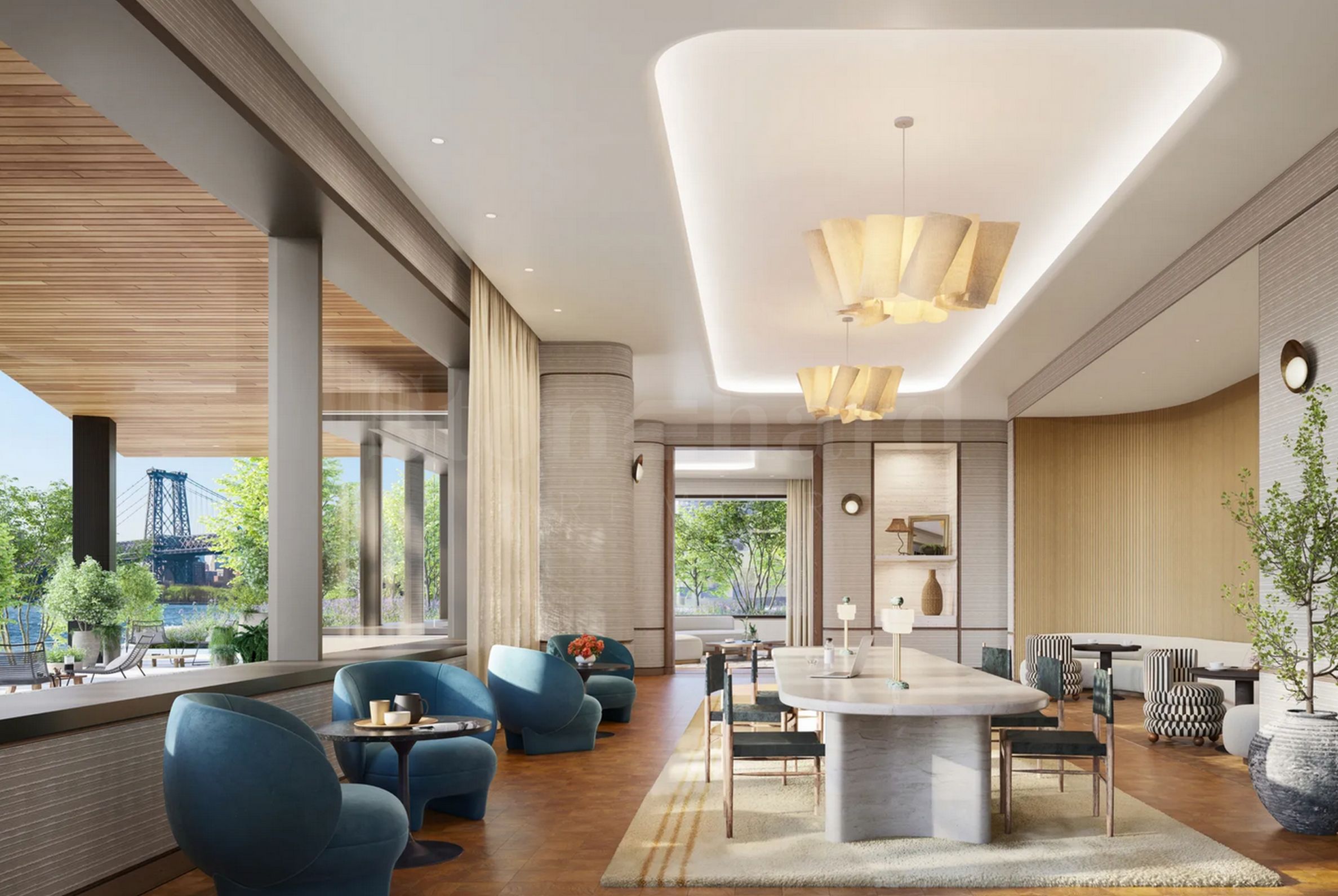 Im One Williamsburg Wharf sind die Innenräume auf höchsten Komfort, Produktivität und Genuss ausgelegt. Elegante private Lounges, Unterhaltungsräume, ein Kino, eine Bibliothek, gemeinsame Arbeitsbereiche sowie ruhige Grünflächen laden zum Meditieren, Konzentrieren und Inspirieren ein oder genießen Sie einfach den Sonnenaufgang über dem Fluss. Ob Sie ein Geschäftstreffen abhalten oder ein Glas Wein mit Freunden genießen, die Atmosphäre ist stets stilvoll, gemütlich und inspirierend.