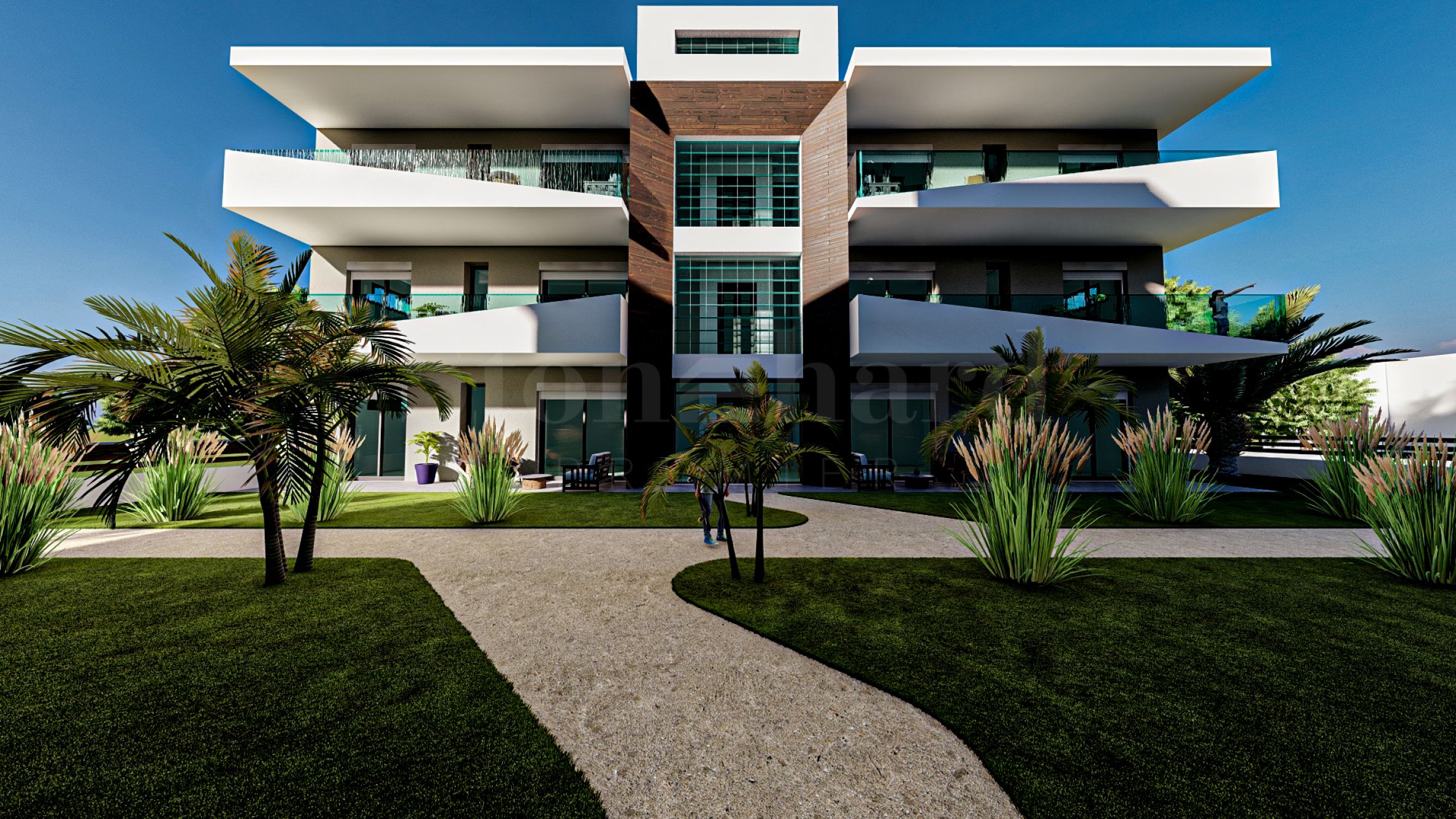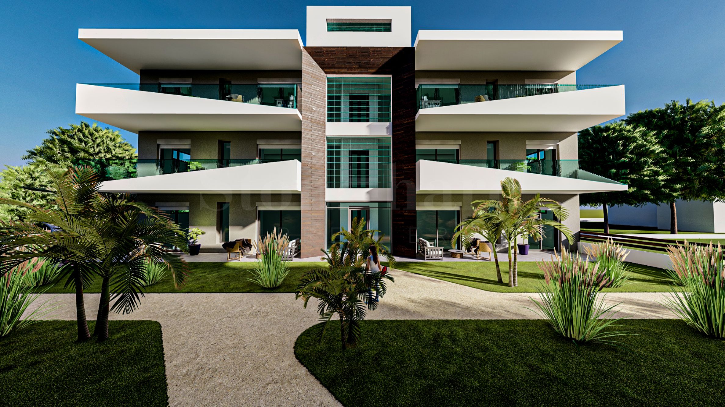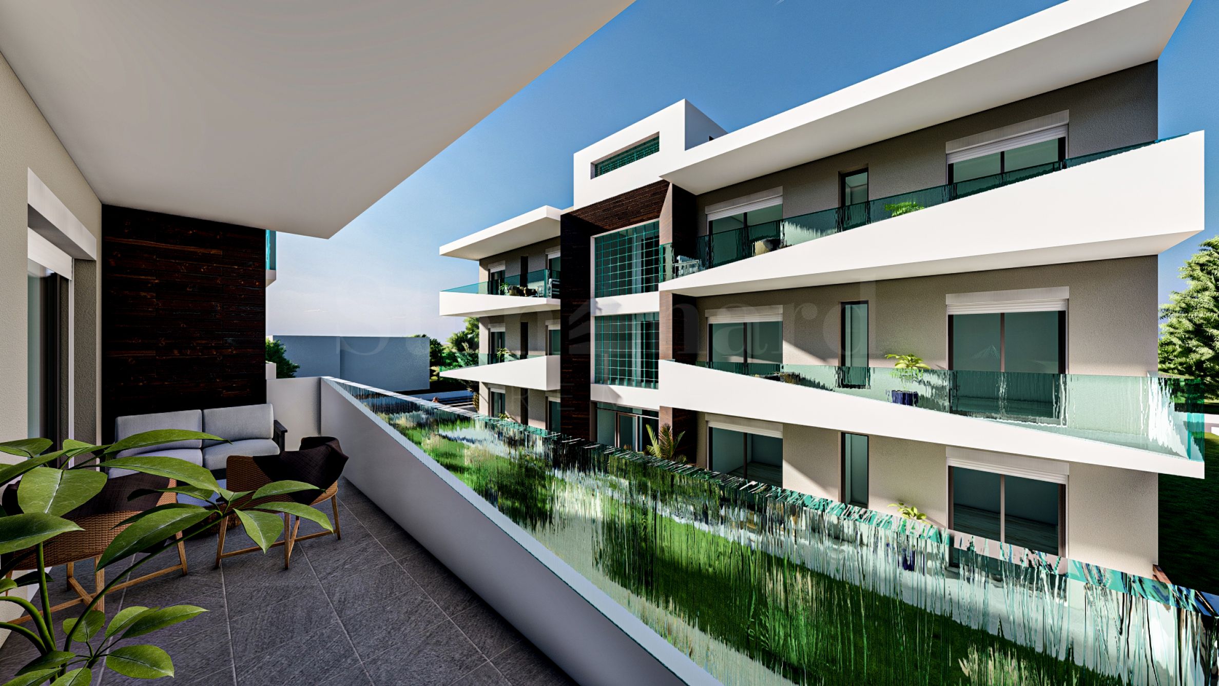 Die Gestaltung der von grünen Rasenflächen dominierten Umgebung fügt den Komplex harmonisch in die natürliche Umgebung der Umgebung ein und schafft die ideale Atmosphäre für unzählige Momente des Vergnügens und der Entspannung.