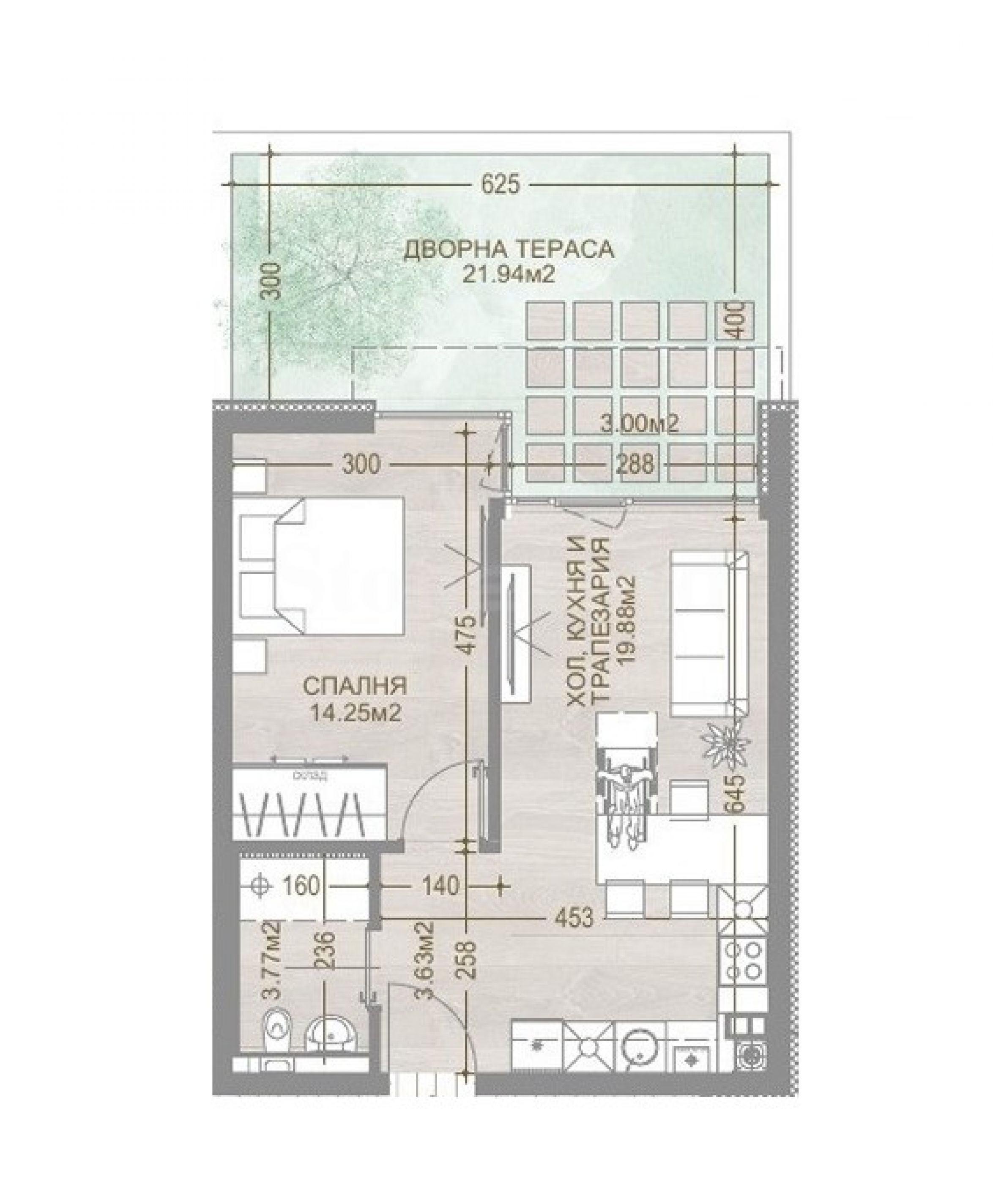 Ein-Zimmer-Wohnung mit Innenhofterrasse im Stadtteil "Manastirski Livadi - Ost"