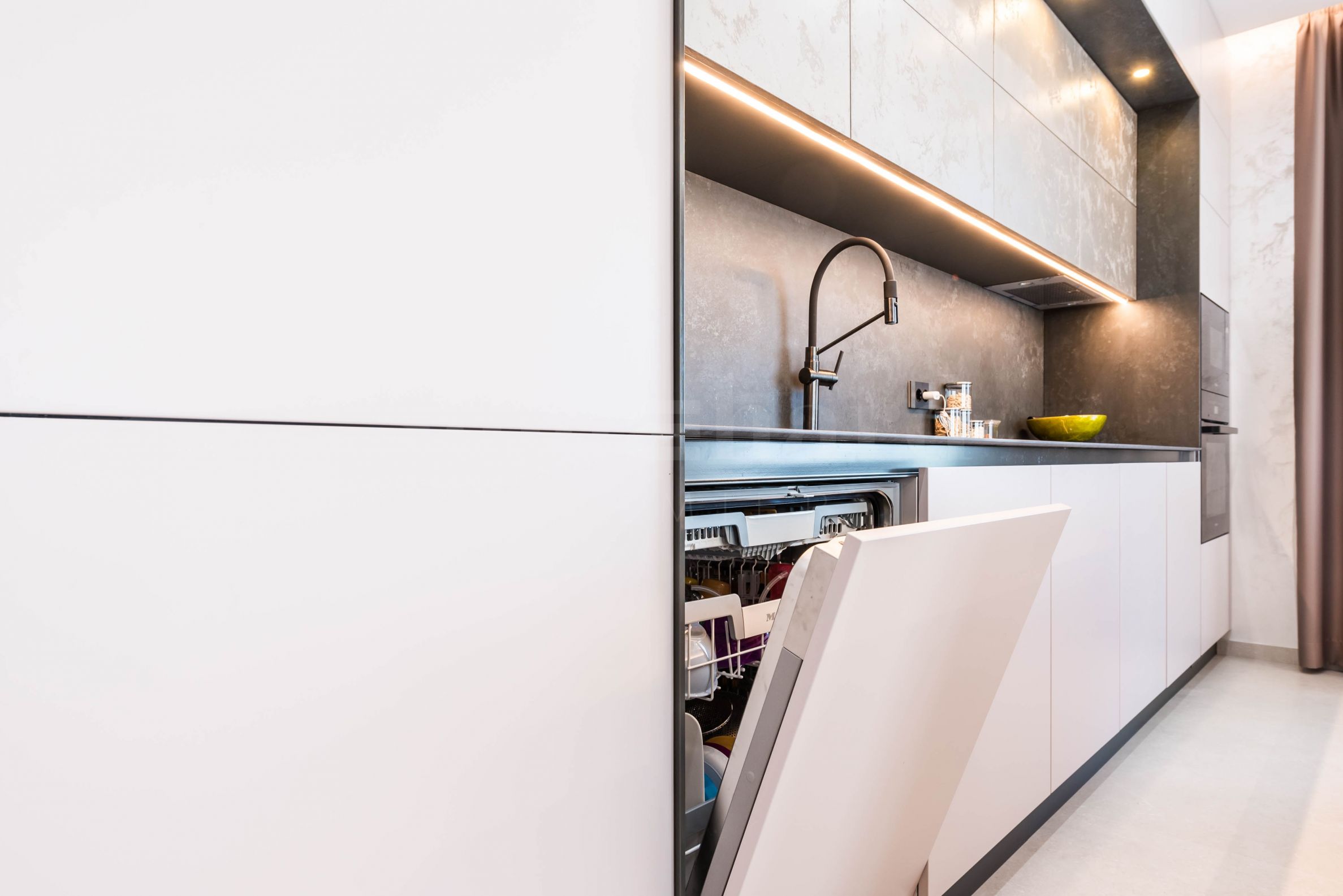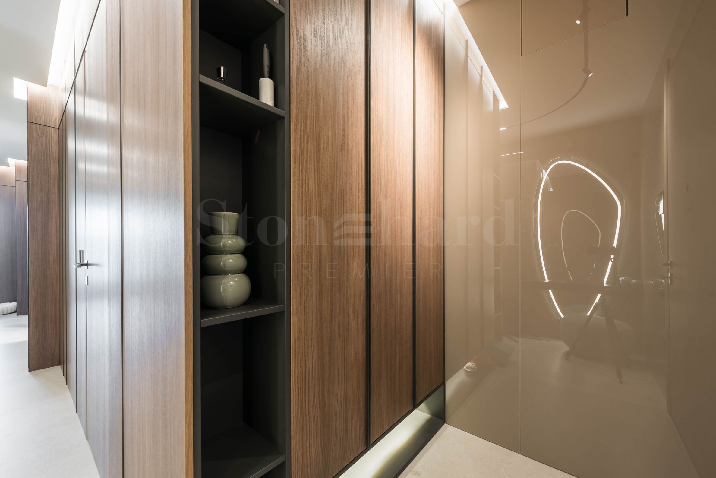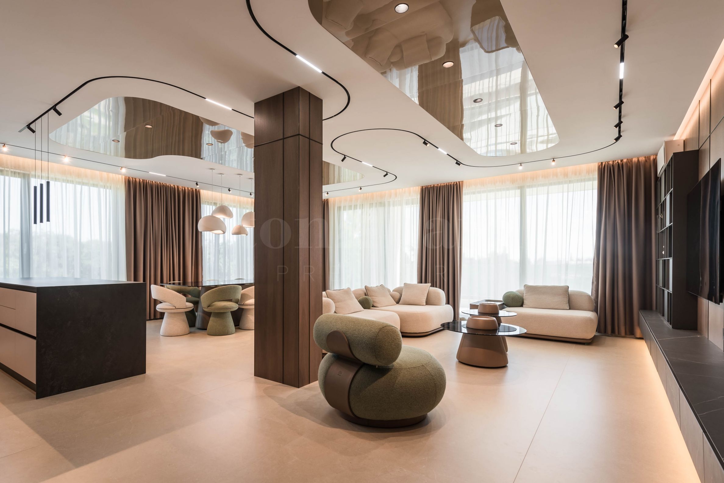 Das Innere der Immobilie strahlt moderne Eleganz und außergewöhnliche Liebe zum Detail aus. Das Apartment ist nach einem Designerprojekt luxuriös mit maßgefertigten italienischen Möbeln und hochwertigen Miele-Geräten eingerichtet. Im Wohnbereich beeindrucken ausgewählte Möbel mit organischen Formen – bequeme Sofas und Sessel, kombiniert mit niedrigen Tischen und einem stilvollen TV-Modul. Der Raum ist in sanften Erdtönen gestaltet und Akzente werden durch attraktive moderne Decken mit zeitgenössischer Beleuchtung gesetzt – eingebaute, lineare und Designer-Pendelleuchten, die die Bereiche hervorheben und der Immobilie Charakter verleihen. Die Schlafzimmer folgen dem gleichen Konzept – Erdtöne, Akzentbeleuchtung und Designerlösungen, die Komfort und Stil vereinen. Die Atmosphäre ist so durchdacht, dass sie Luxus und gleichzeitig Ruhe vermittelt.