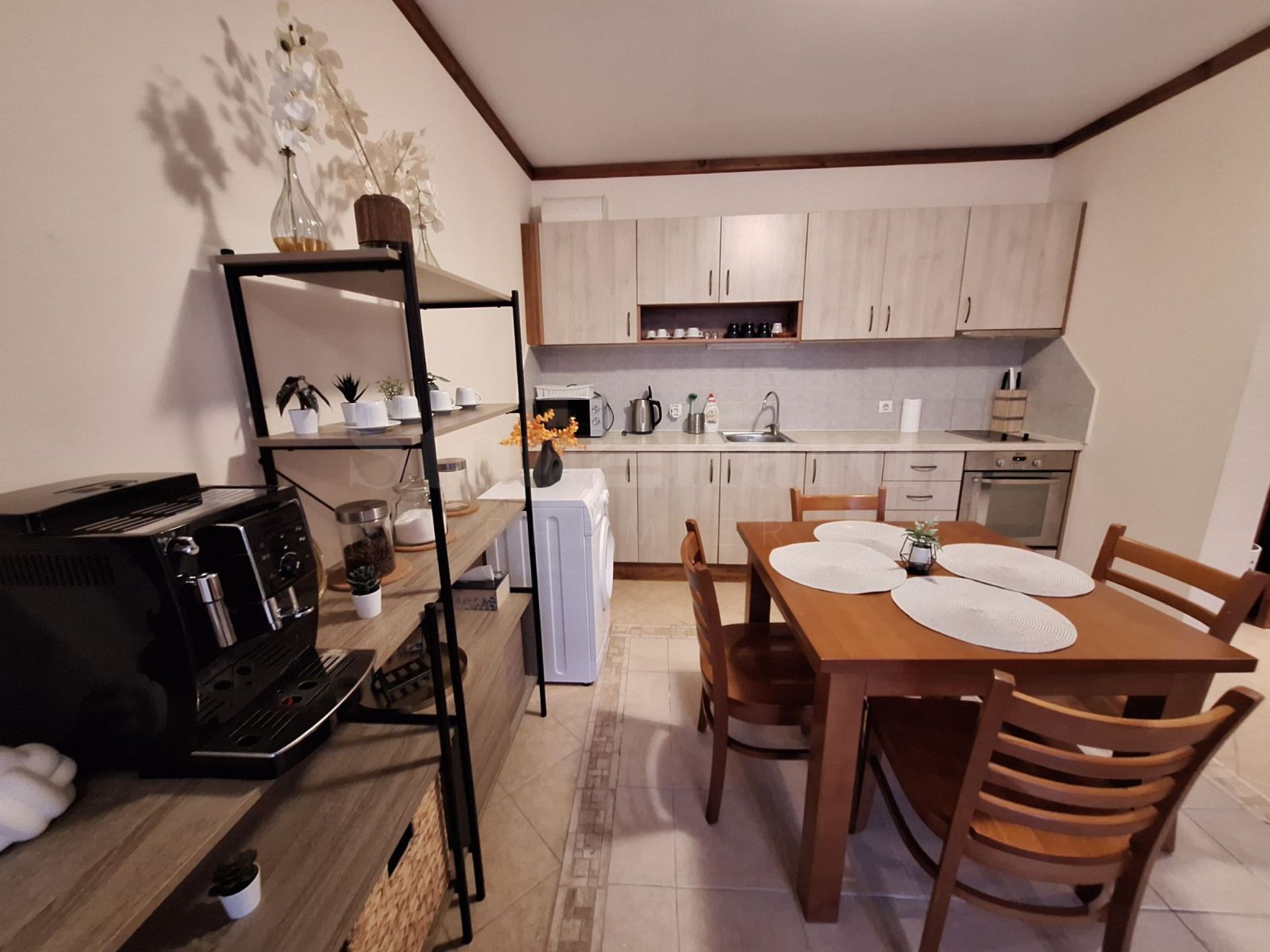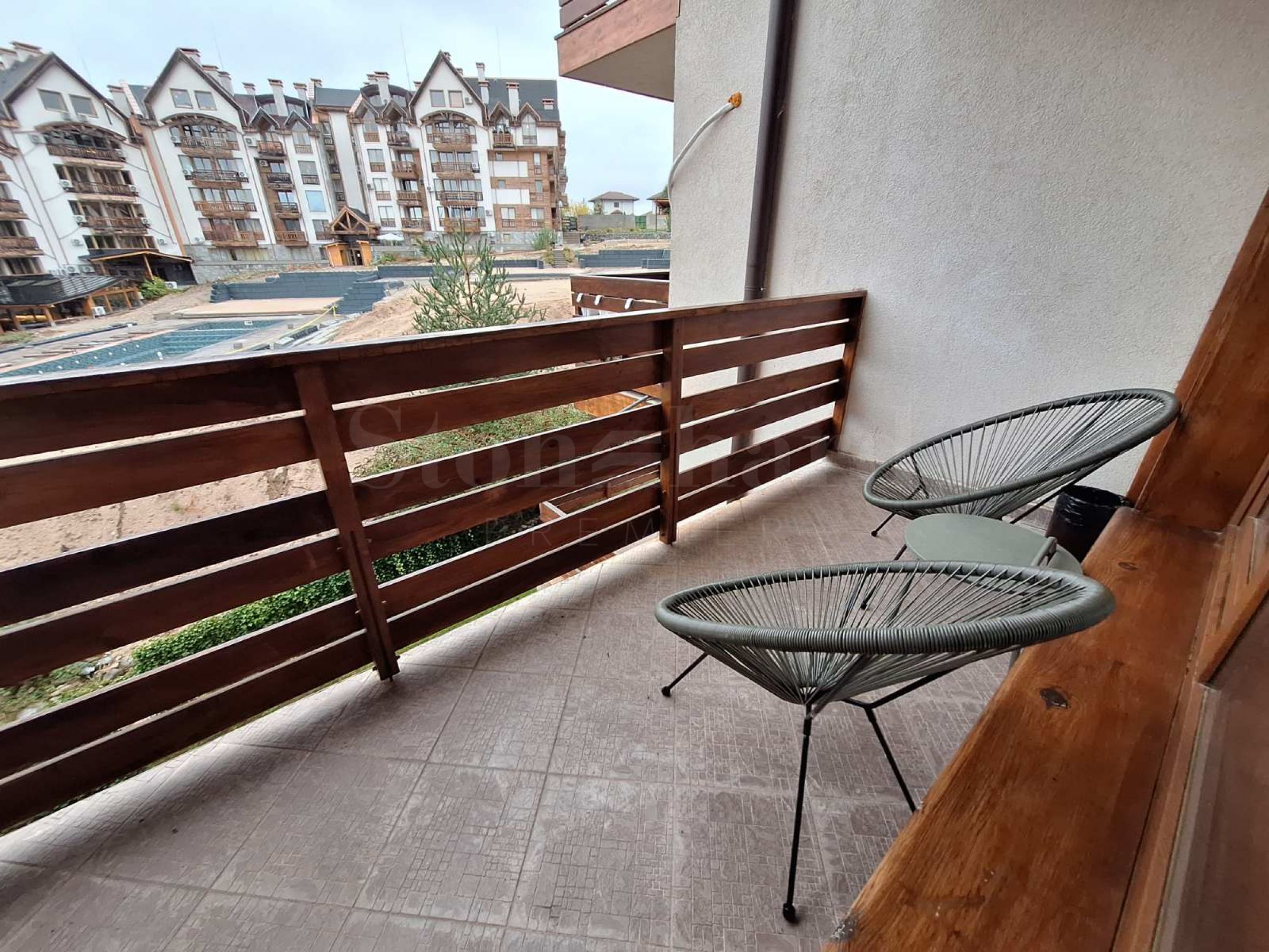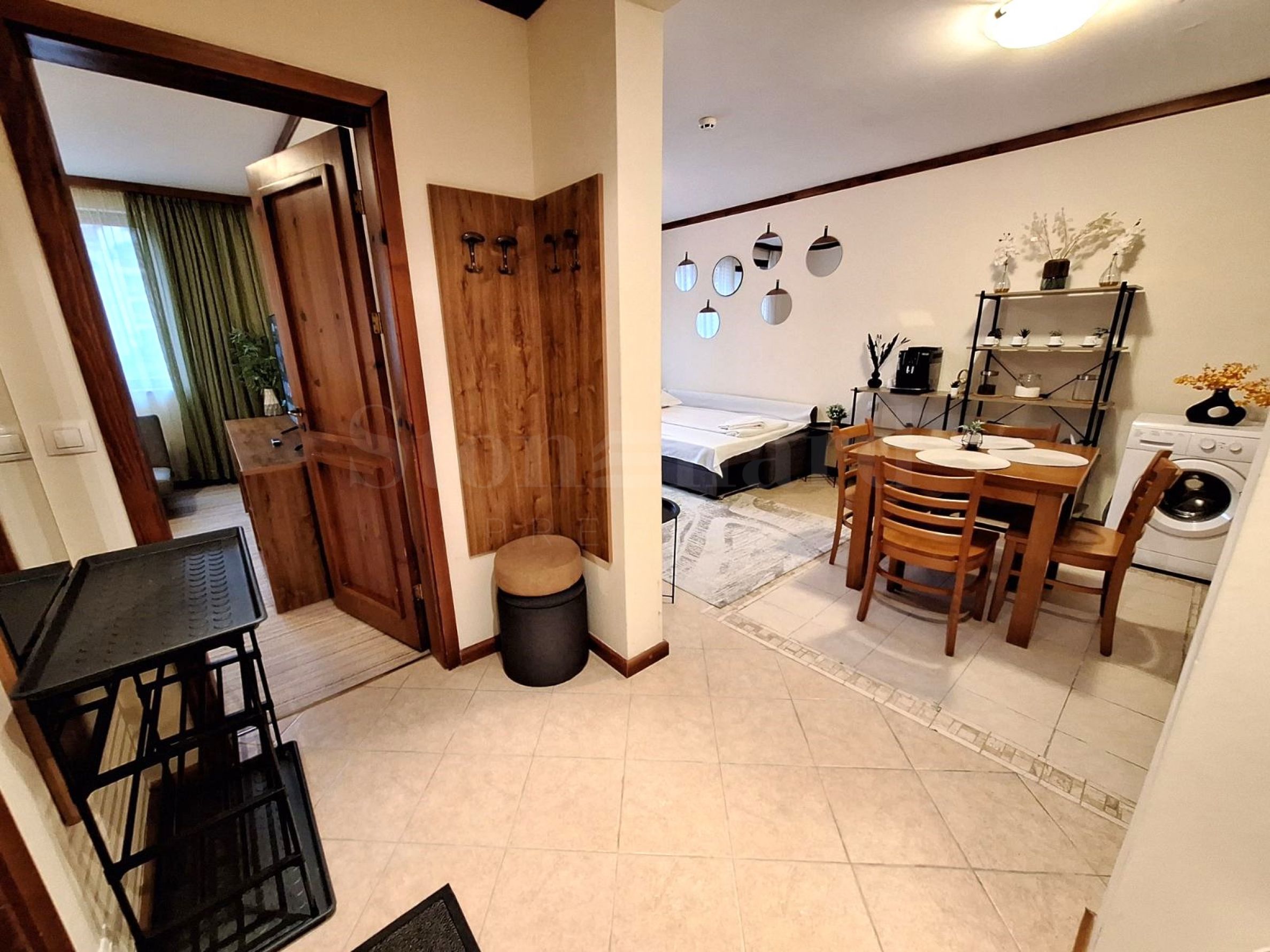 Die Wohnung befindet sich in einem Haus hinter dem Hauptgebäude. Jedes Haus verfügt über einen Massagebereich, eine Sauna, ein Dampfbad, einen Skiraum, einen großen Grill mit Kamin und einen Billardtisch. Diese Annehmlichkeiten stehen ausschließlich den Eigentümern zur Verfügung. Sie genießen die frische Bergluft und den Blick auf das Pirin-Gebirge. Das charmante Interieur vermittelt ein behagliches Wohngefühl.