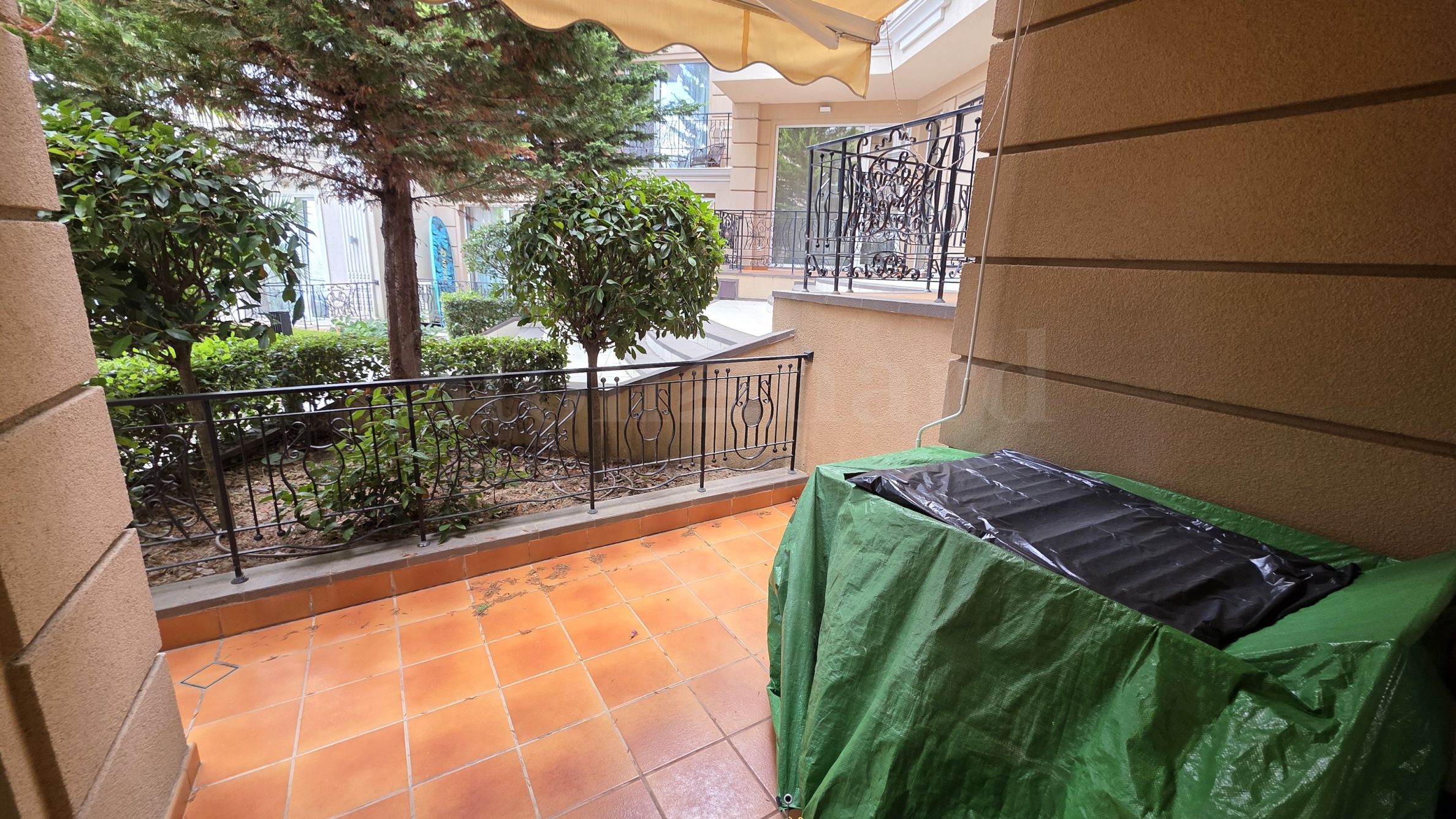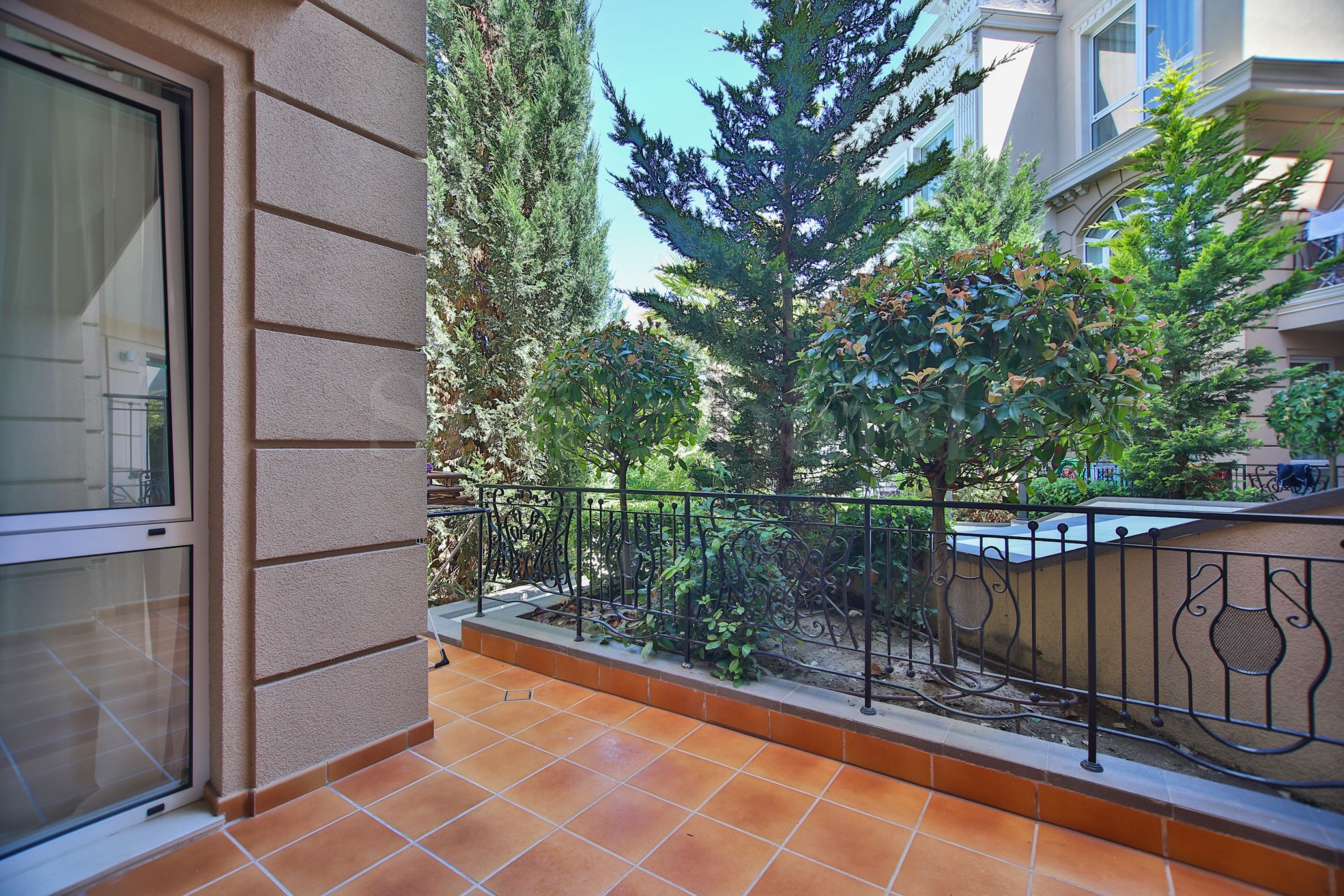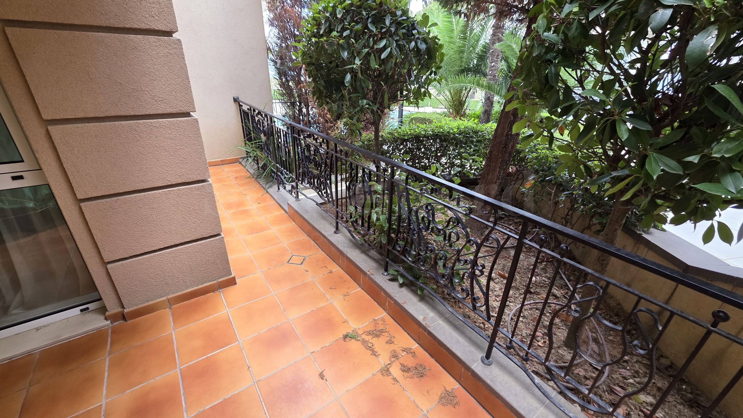 Die Wohnung befindet sich im Erdgeschoss und verfügt über eine große Gartenterrasse mit Blick auf den Pool und den begrünten Innenhof der Anlage sowie über eine zweite, kleinere Terrasse am Schlafzimmer.