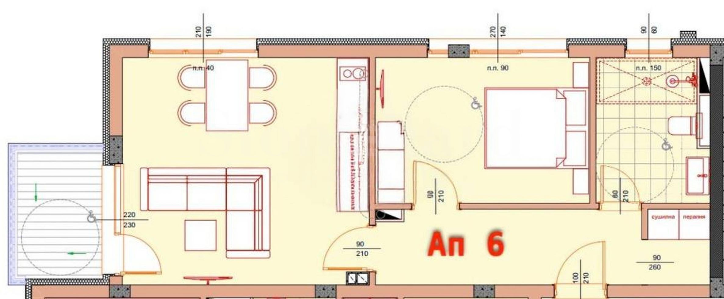 Die Immobilie hat eine Fläche von 71,50 m² und befindet sich im 2. Obergeschoss mit Nordwestausrichtung. Sie wird gemäß bulgarischen Baustandards in folgendem Bauzustand vermietet: