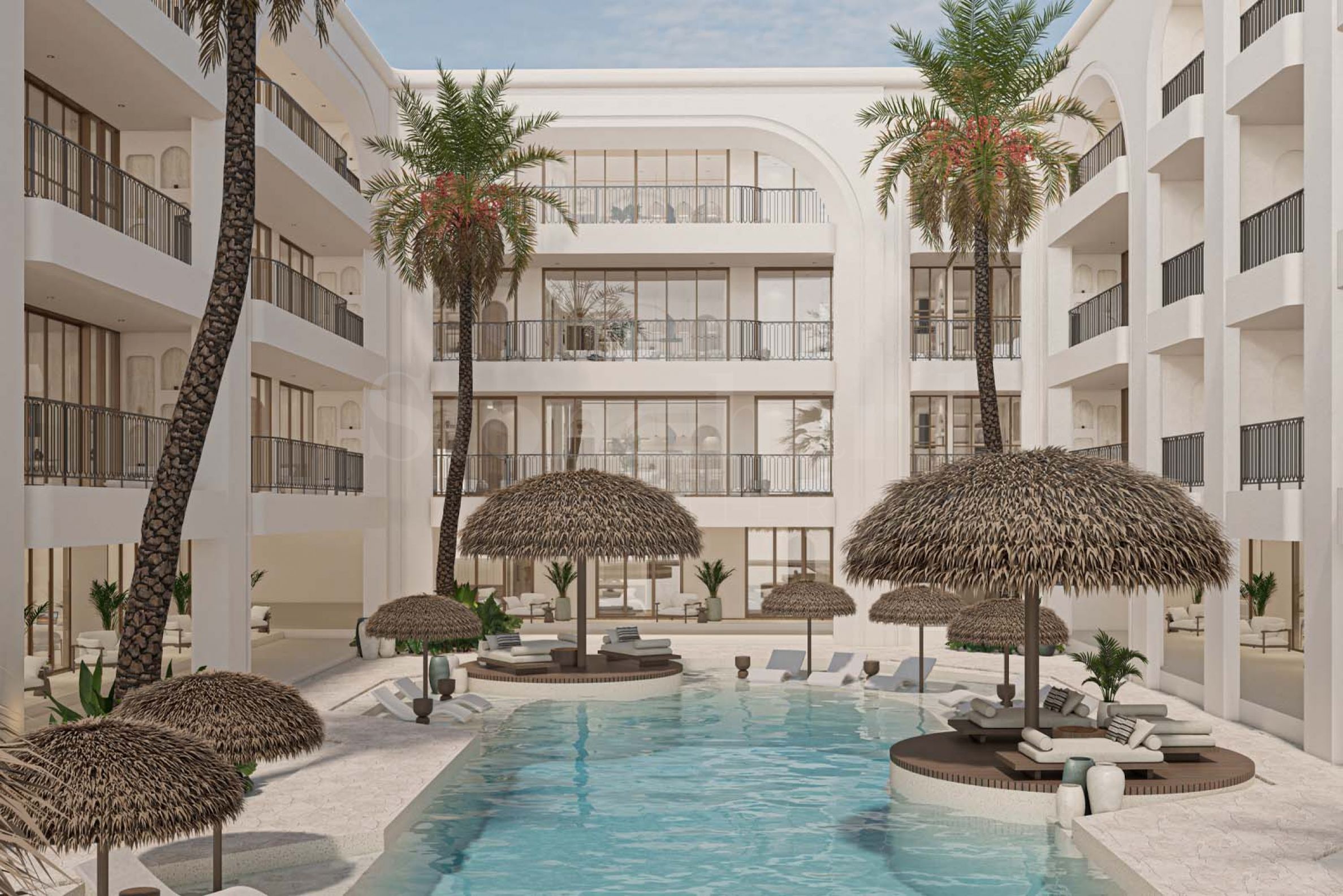 Der Komplex bietet eine begrenzte Anzahl an Zweizimmerwohnungen mit einer Fläche von 40 m², die komfortabel und funktional gestaltet sind. Die Wohnung verfügt über ein gemütliches Wohnzimmer mit Kochnische und Bartheke, ein separates Schlafzimmer und eine großzügige Sonnenterrasse mit privatem Pool zur Entspannung und zum Vergnügen der Bewohner.