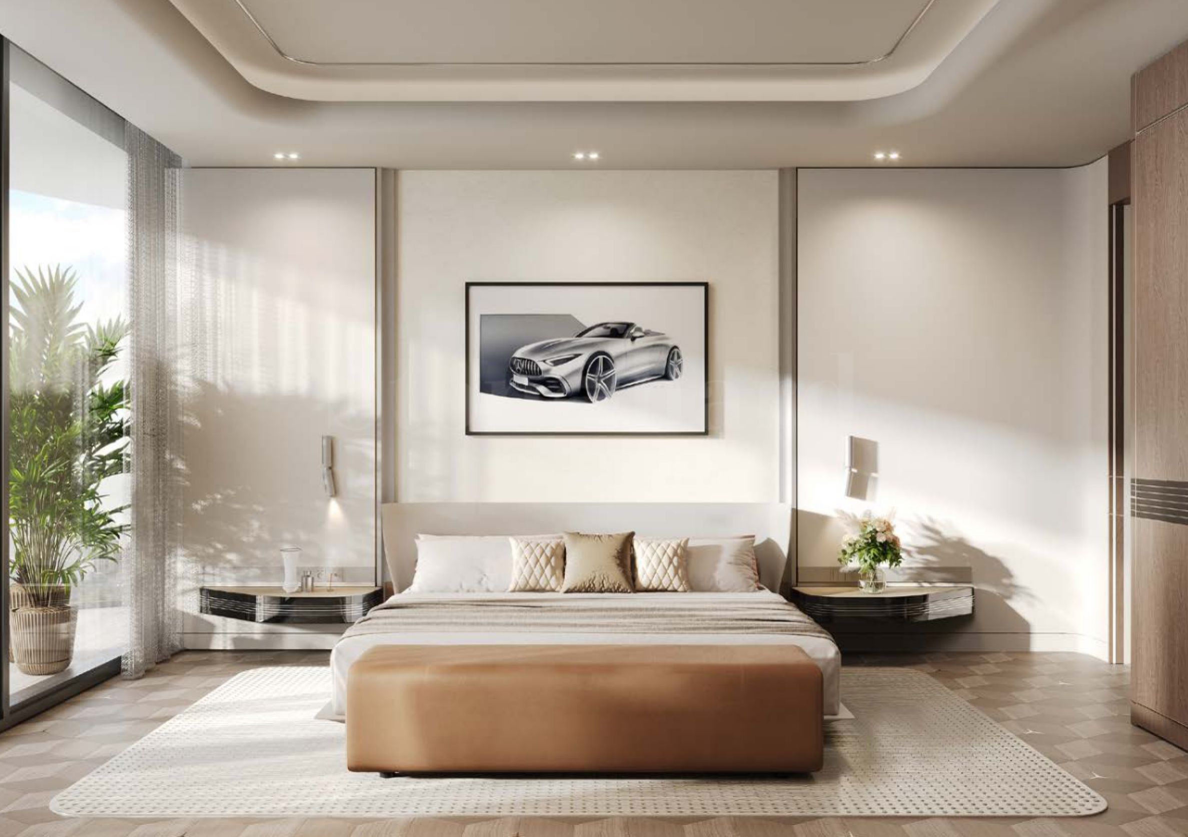 Das Studio bietet eine Fläche von 57,35 m², inklusive 6,27 m² Außenfläche. Hohe Decken und bodentiefe Fenster sorgen für ein großzügiges und helles Ambiente. Die Raumaufteilung ist intelligent gestaltet: Küche und Wohnbereich sind voneinander getrennt, und die Terrasse lädt zum Entspannen im Freien ein. Das Schlafzimmer verfügt über ein eigenes Badezimmer, und im Wohnzimmer befindet sich ein Gäste-WC. Die Immobilie wird bezugsfertig angeboten, inklusive voll ausgestatteter Küche, Badezimmer, Bodenbelägen, Beleuchtung und Innentüren – alles im Mercedes-Benz-Stil.