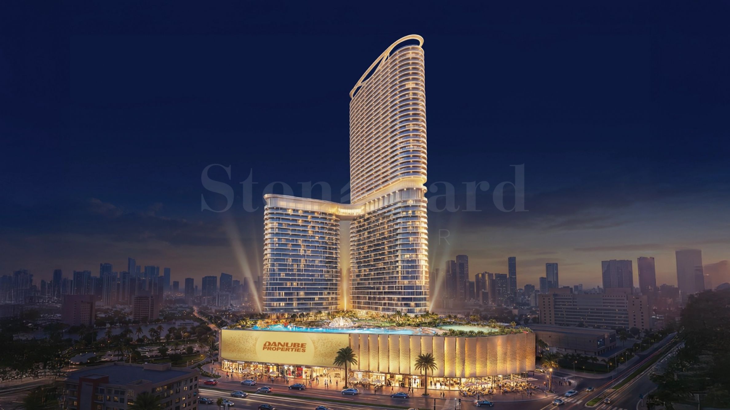 Das Gebäude erhebt sich elegant aus der Silhouette des Wohngebiets und besticht durch seine exquisiten goldenen Akzente, die ihm ein unverwechselbares und einprägsames Erscheinungsbild verleihen. Die Sockelgeschosse sind funktional gestaltet und bieten sowohl komfortable Parkflächen als auch eine sorgfältig ausgewählte Palette an Annehmlichkeiten, die auf den modernen Lebensstil zugeschnitten sind.