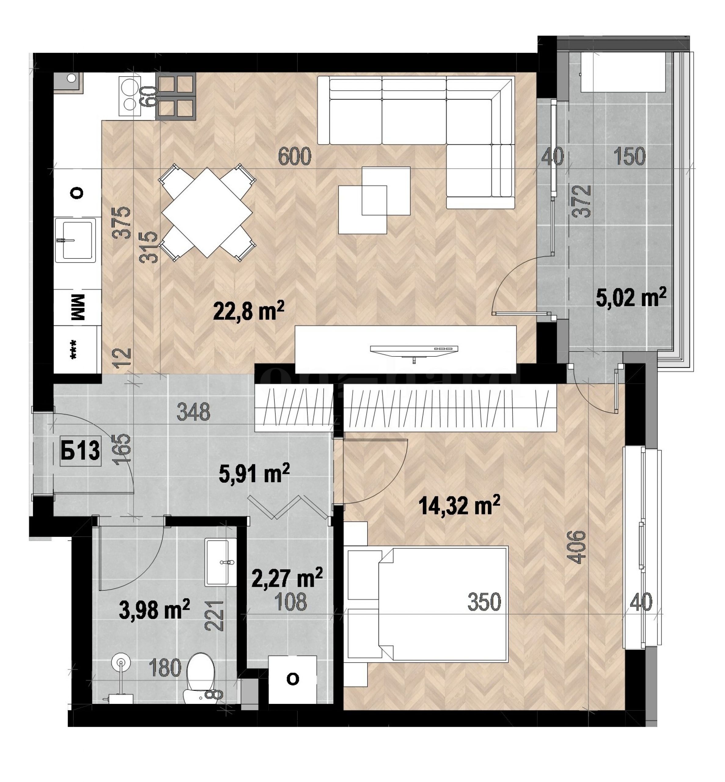 Der Komplex verfügt über zwei Eingänge und insgesamt 68 Wohnungen, verteilt auf ein modernes Gebäude mit zeitgenössischer Architektur und unverwechselbarem Design. Im obersten Stockwerk sind exklusive Penthäuser geplant, und einige Wohnungen bieten einen Panoramablick auf das Witoscha-Gebirge.