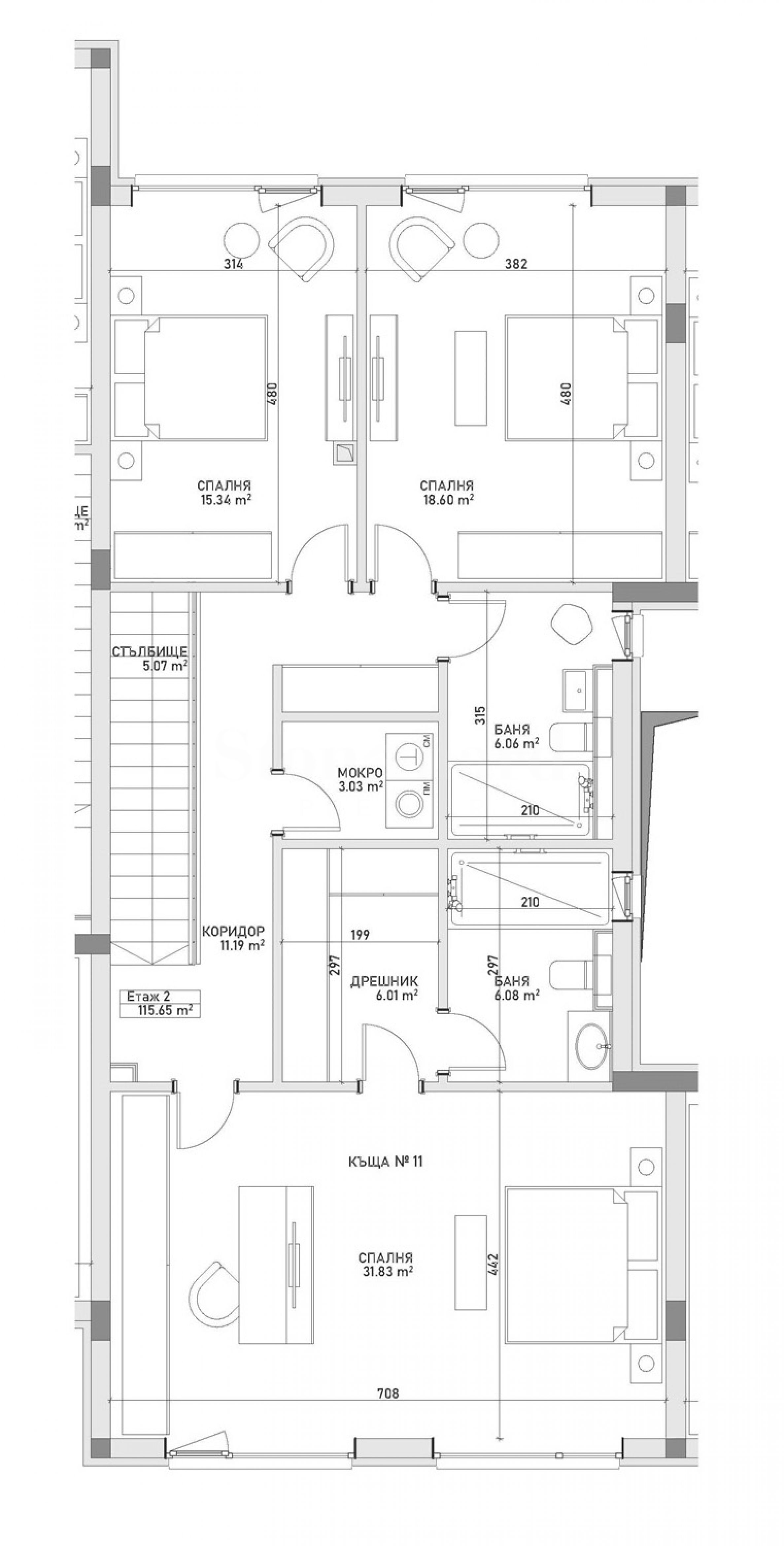 Zweites Obergeschoss – drei Schlafzimmer, ein Abstellraum, ein Hauswirtschaftsraum und zwei separate Badezimmer mit WC. Die Wohnfläche beträgt 115,65 m².