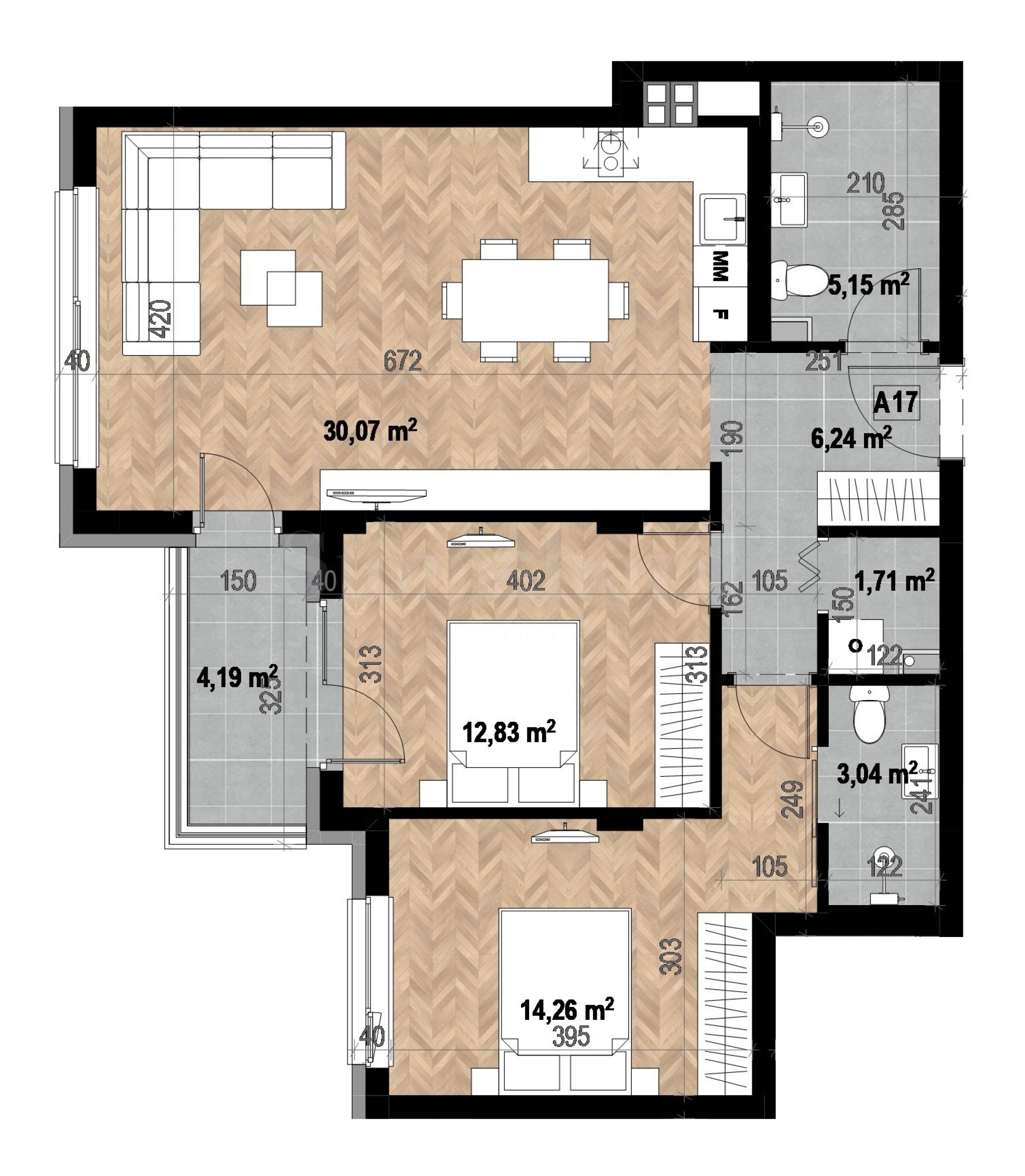 Die Wohnfläche beträgt 90,39 m², die Gemeinschaftsflächen 12,79 m² und verteilen sich wie folgt: